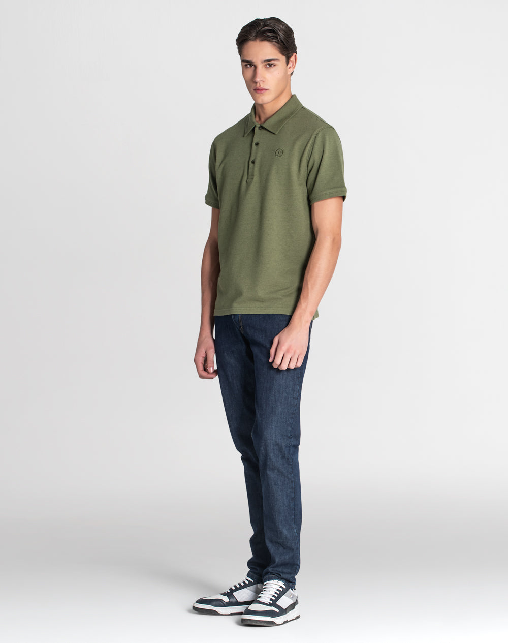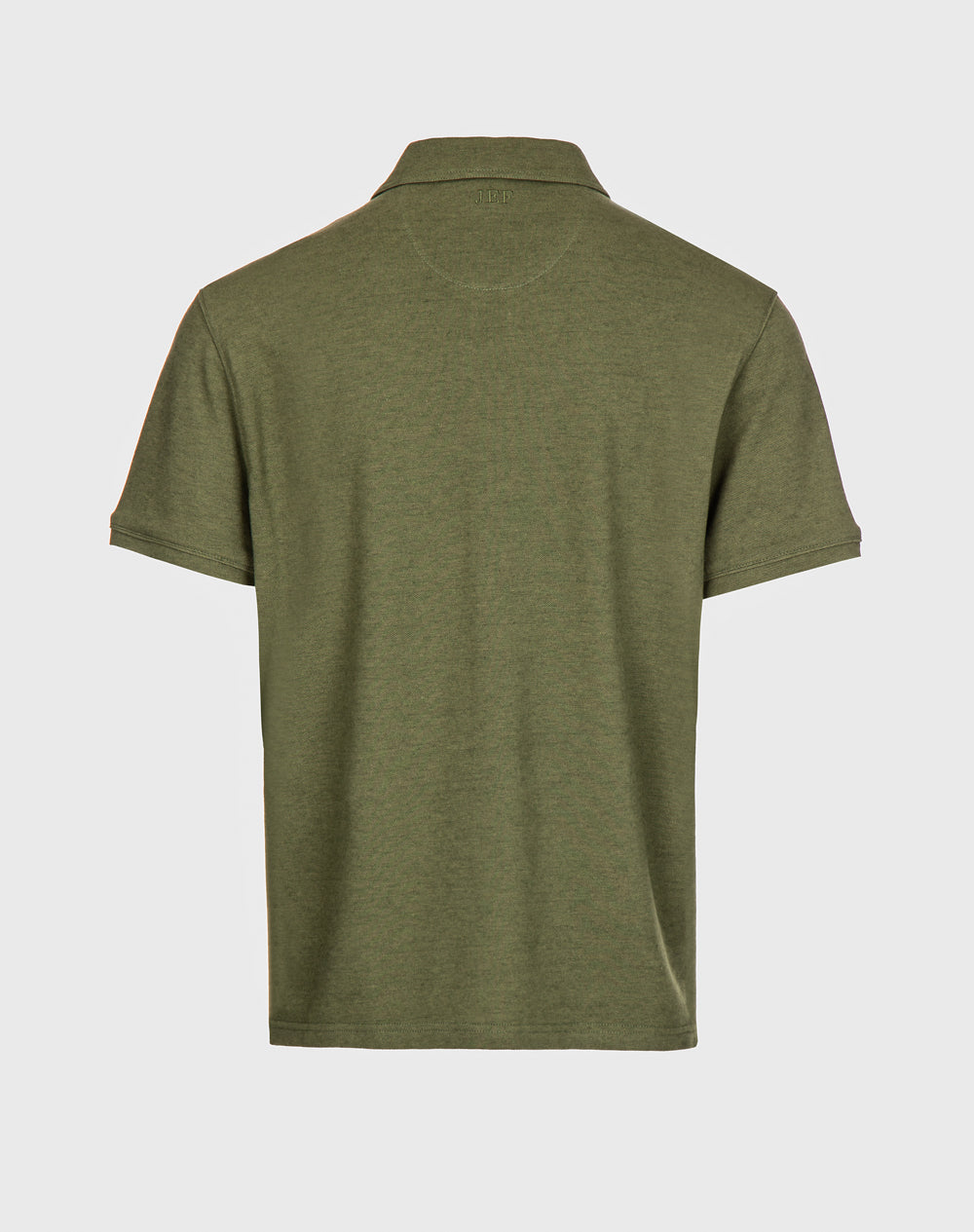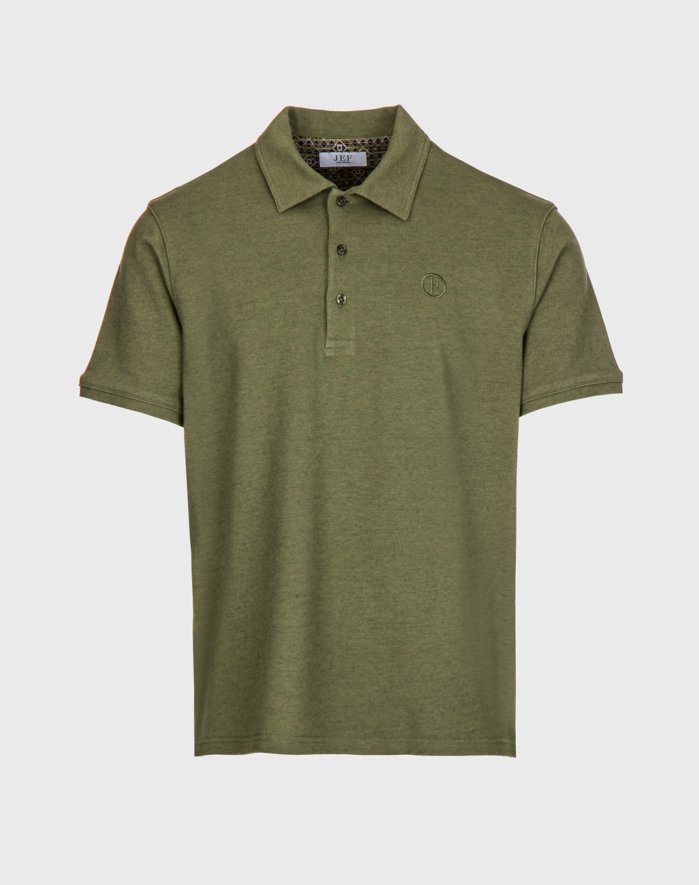 Polo manga curta em malha orgânica. Abertura no meio-frente através 3 botões. Gola, cavas e punhos com vivos. Logótipo ícon bordado à cor da peça. Logótipo JEF bordado nas costas à cor da peça. Meia-lua em tecido estampado (all-over alusivo ao conceito da coleção). Pequenas rachas nas laterais.