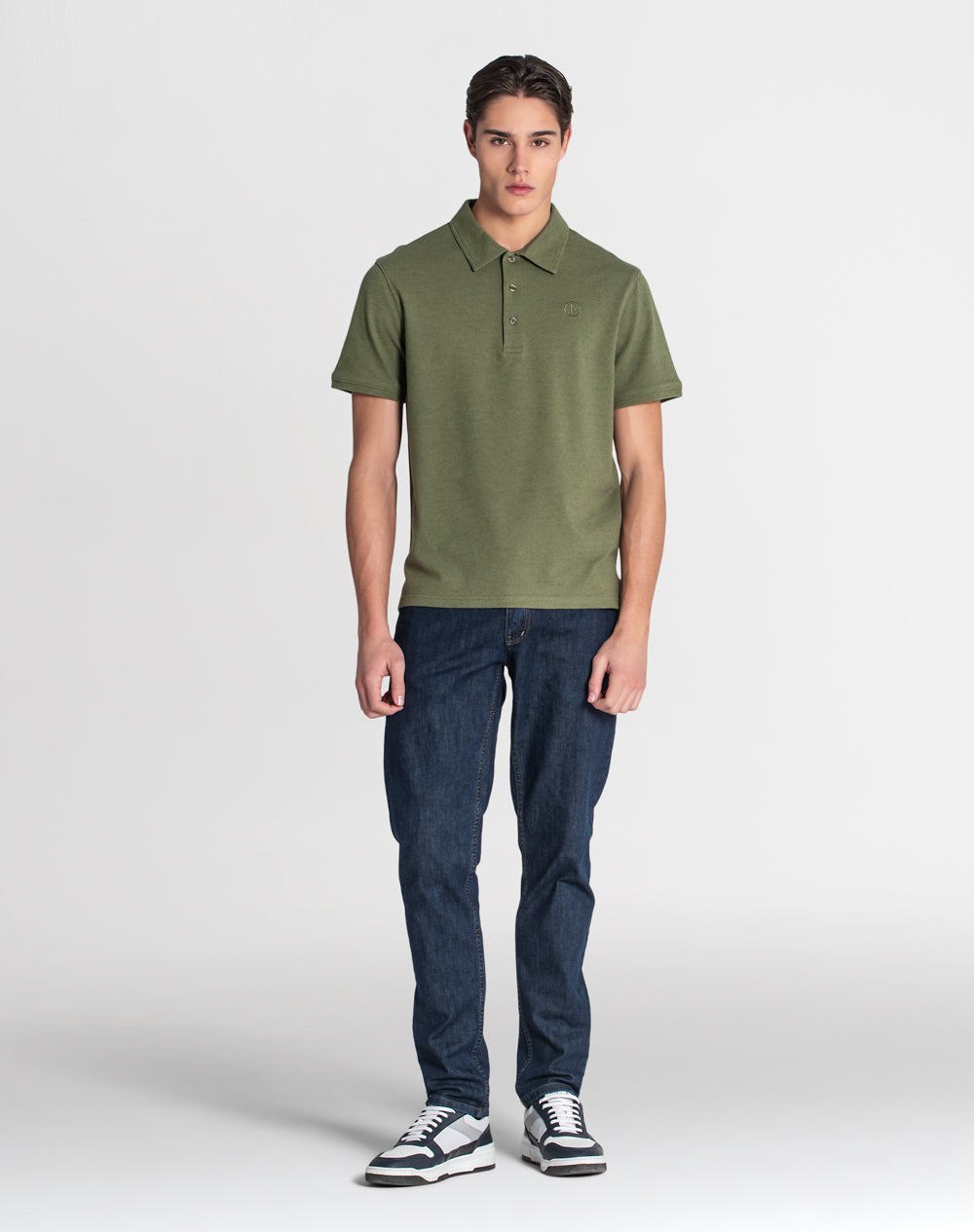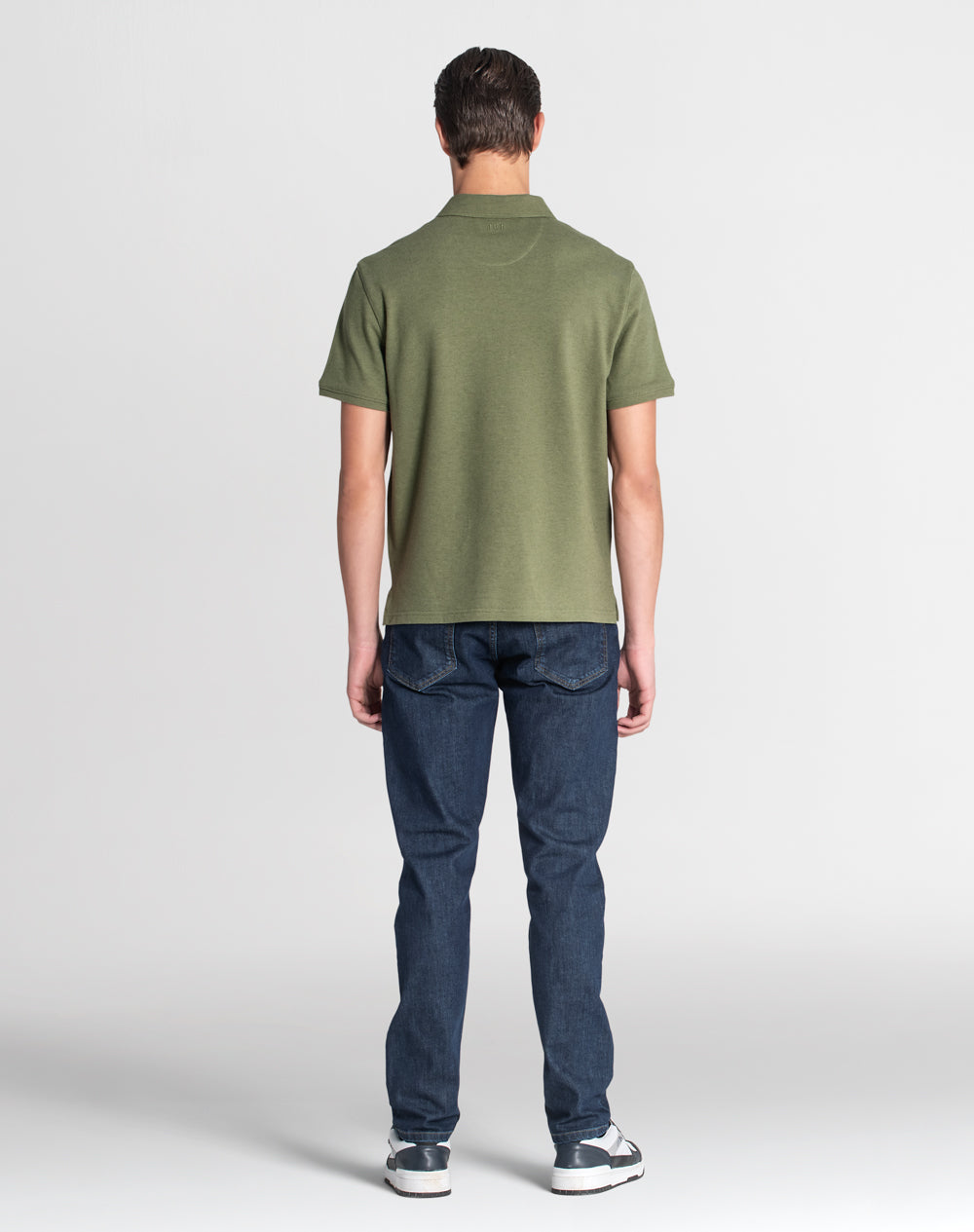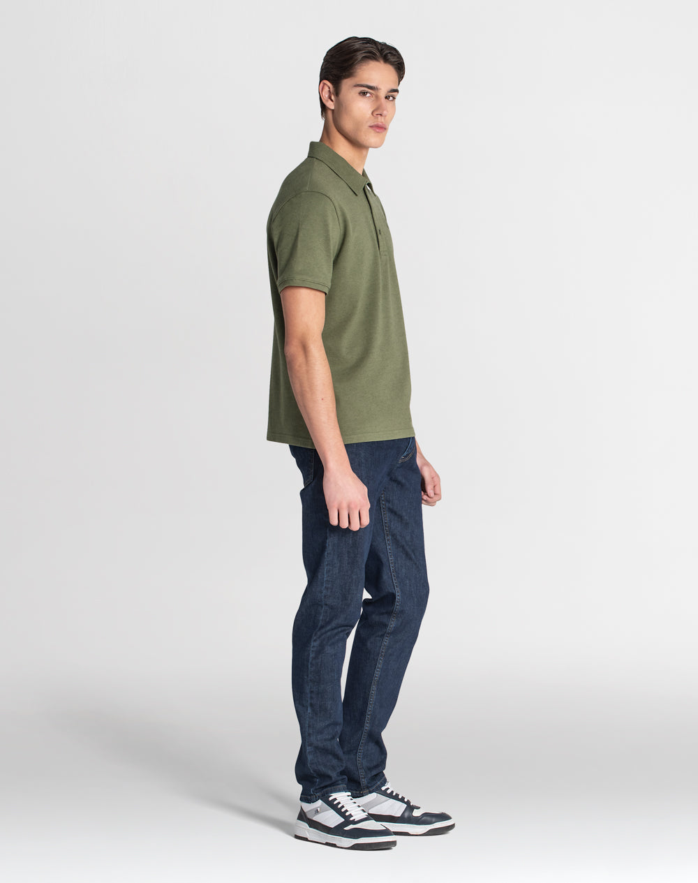 Polo manga curta em malha orgânica. Abertura no meio-frente através 3 botões. Gola, cavas e punhos com vivos. Logótipo ícon bordado à cor da peça. Logótipo JEF bordado nas costas à cor da peça. Meia-lua em tecido estampado (all-over alusivo ao conceito da coleção). Pequenas rachas nas laterais.