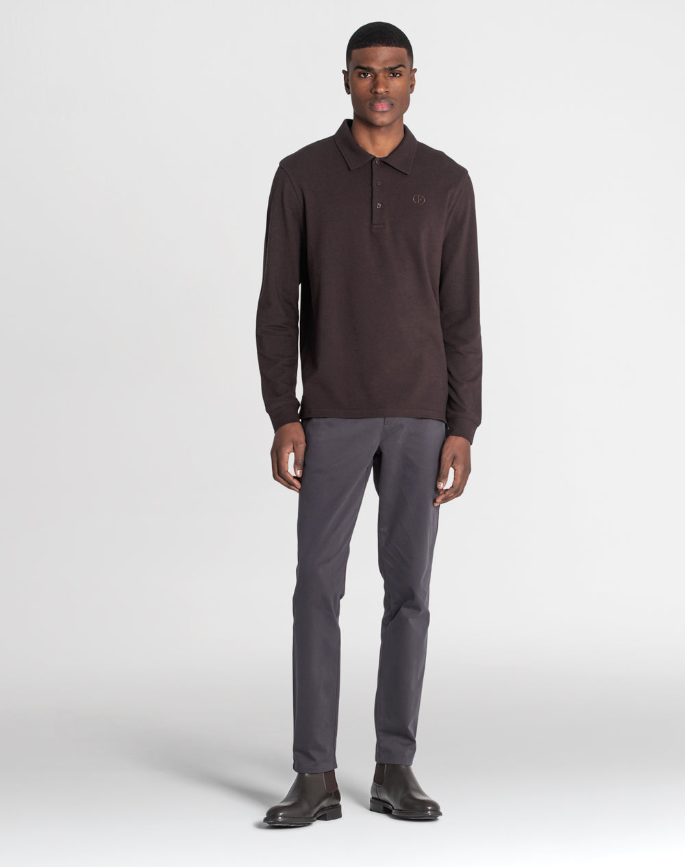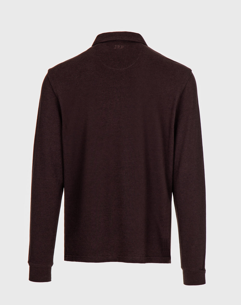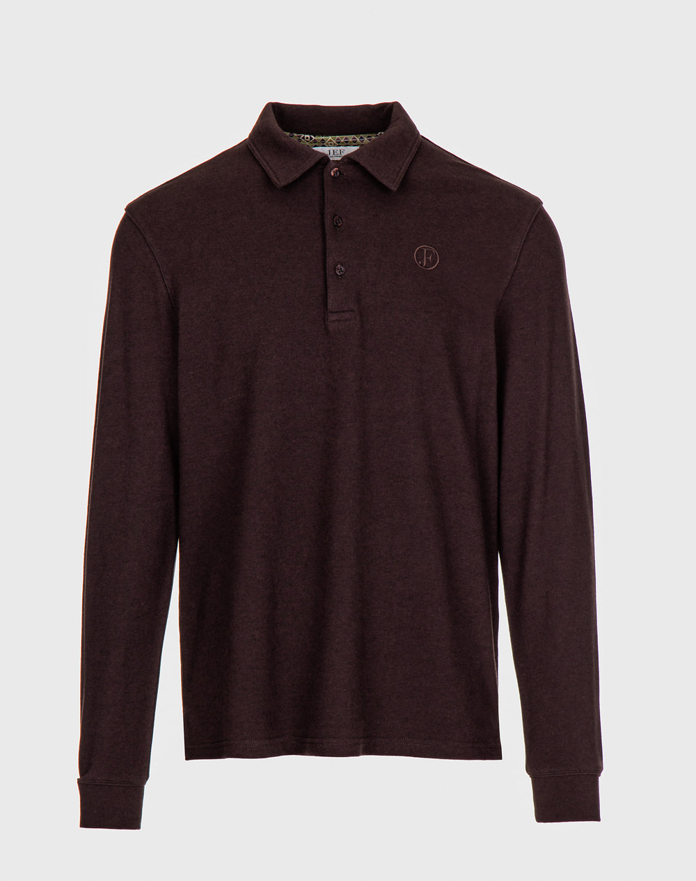 Polo manga comprida em malha orgânica. Abertura no meio-frente através 3 botões. Gola, cavas e punhos com vivos. Logótipo ícon bordado à cor da peça. Logótipo JEF bordado nas costas à cor da peça. Meia-lua em tecido estampado (all-over alusivo ao conceito da coleção). Pequenas rachas nas laterais.