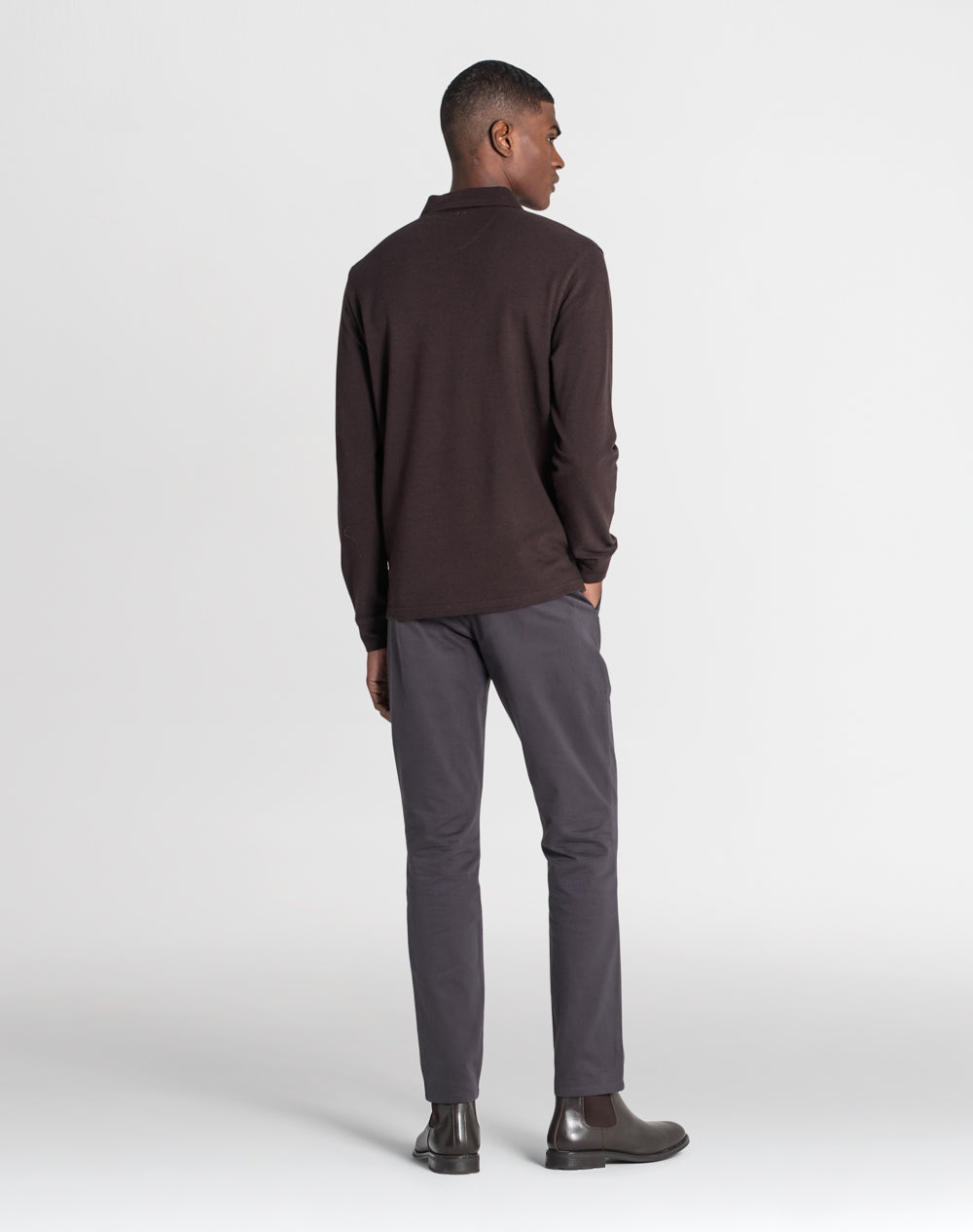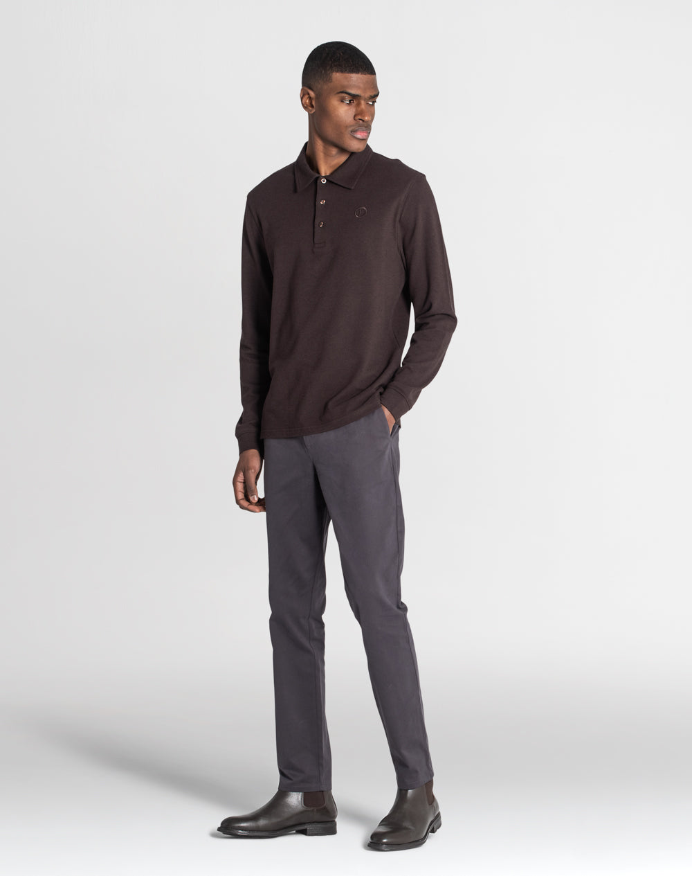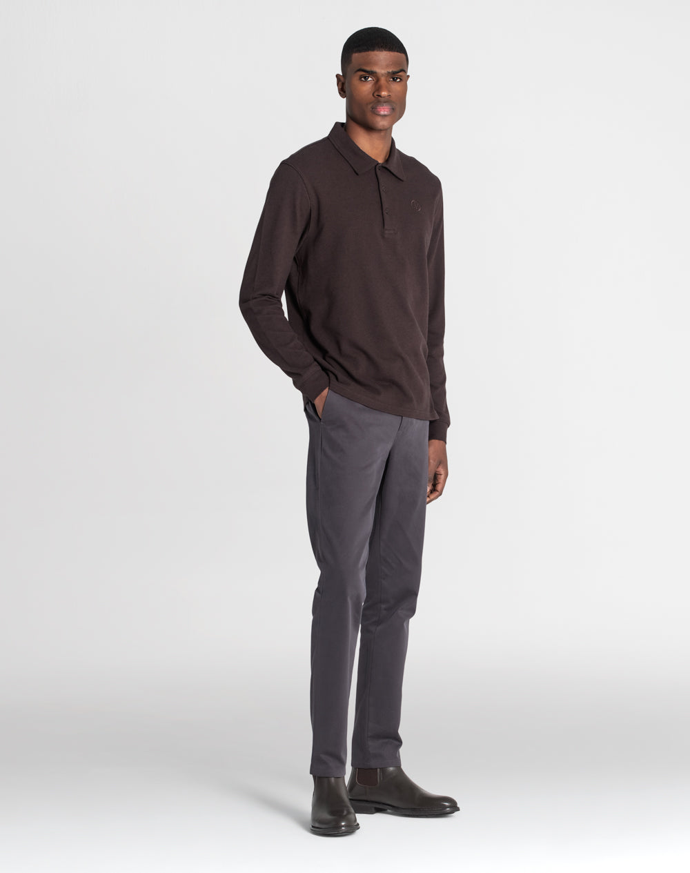 Polo manga comprida em malha orgânica. Abertura no meio-frente através 3 botões. Gola, cavas e punhos com vivos. Logótipo ícon bordado à cor da peça. Logótipo JEF bordado nas costas à cor da peça. Meia-lua em tecido estampado (all-over alusivo ao conceito da coleção). Pequenas rachas nas laterais.