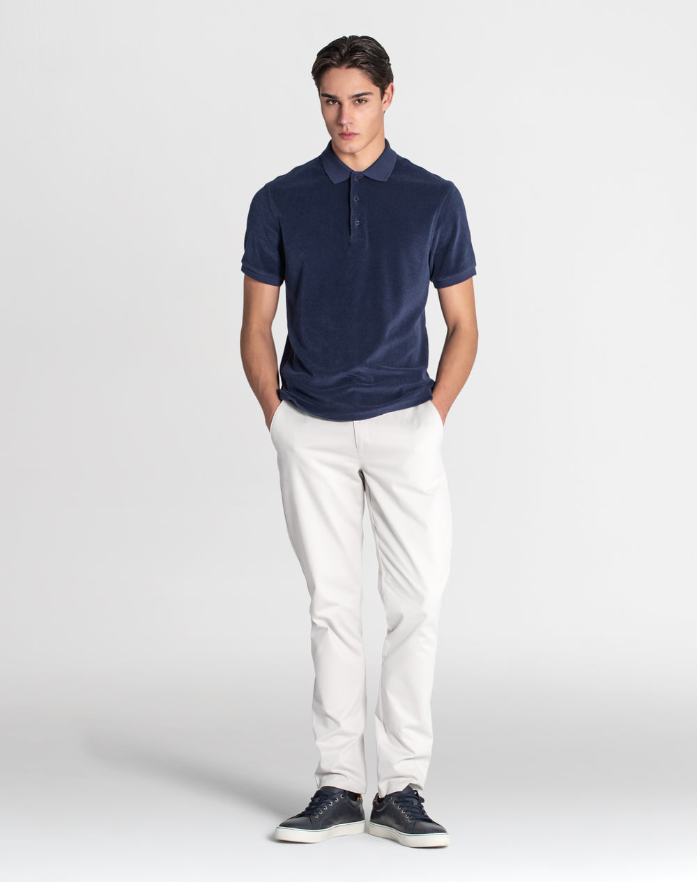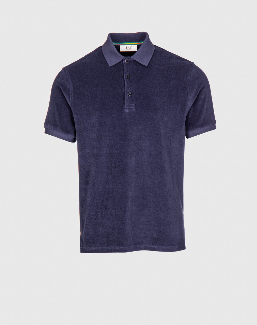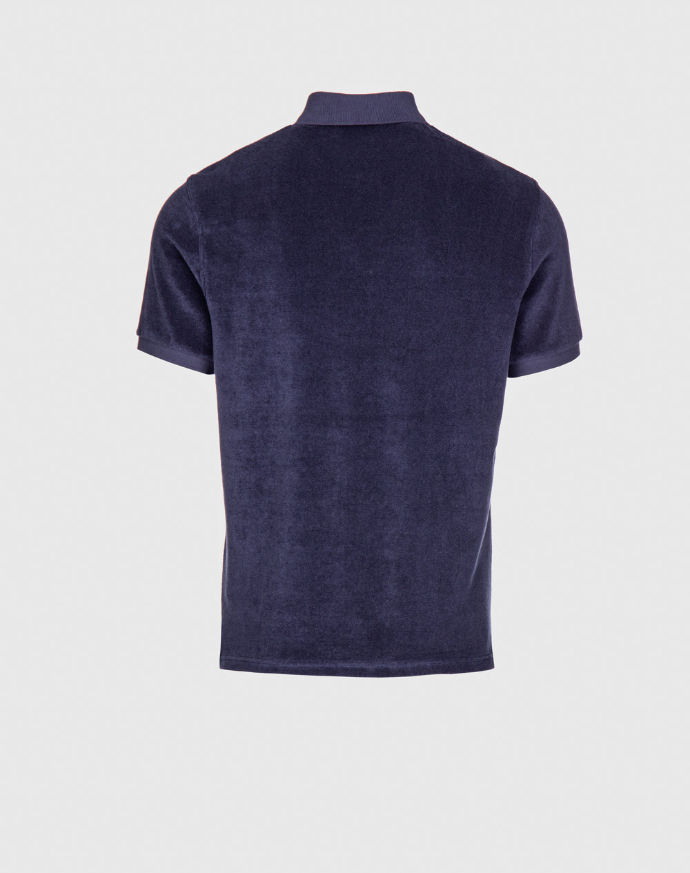Polo básico em peluche com manga curta. Abertura no meio-frente através botões. Tapa-costuras com as cores da marca. Pequenas rachas nas laterais.