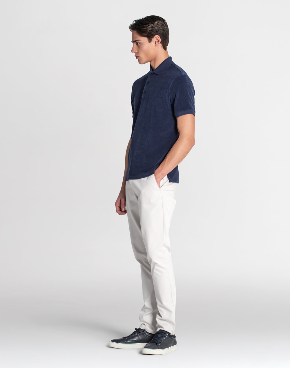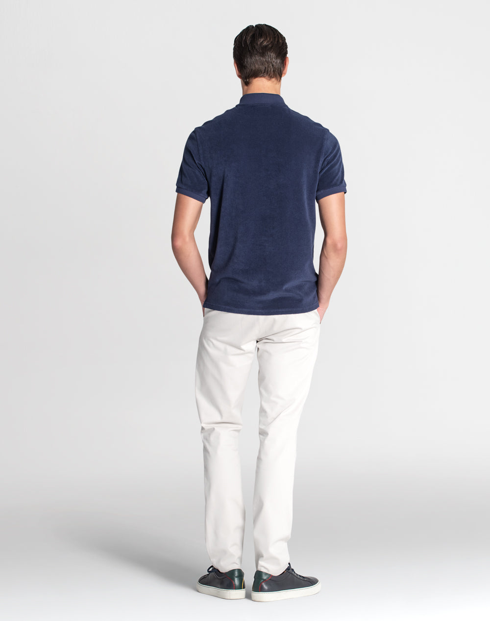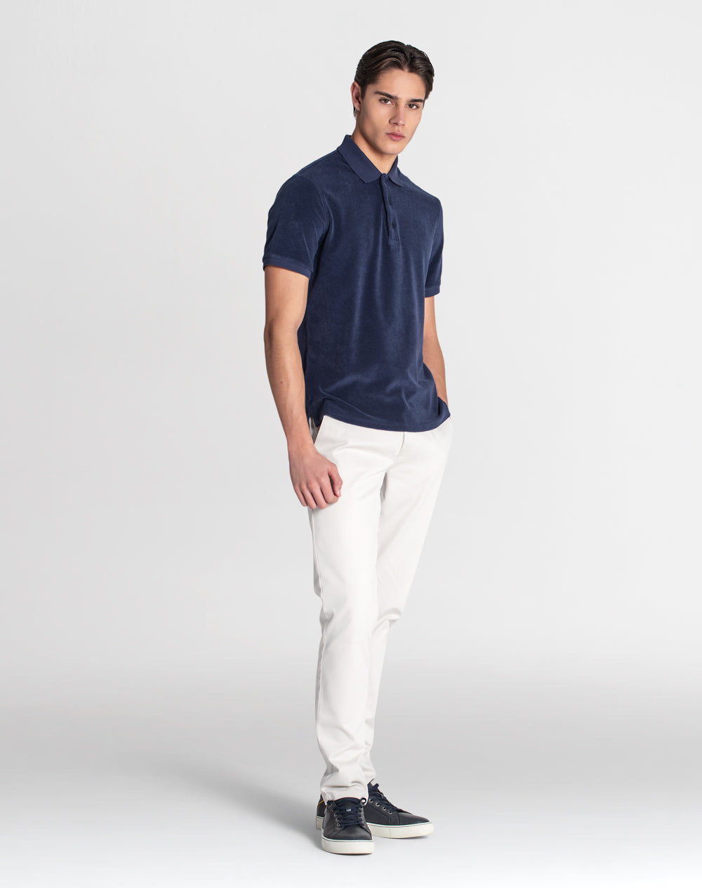 Polo básico em peluche com manga curta. Abertura no meio-frente através botões. Tapa-costuras com as cores da marca. Pequenas rachas nas laterais.