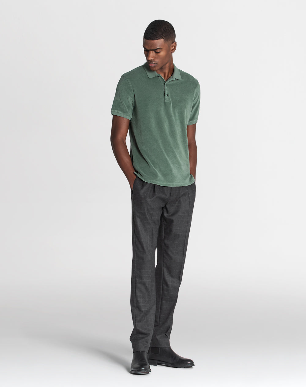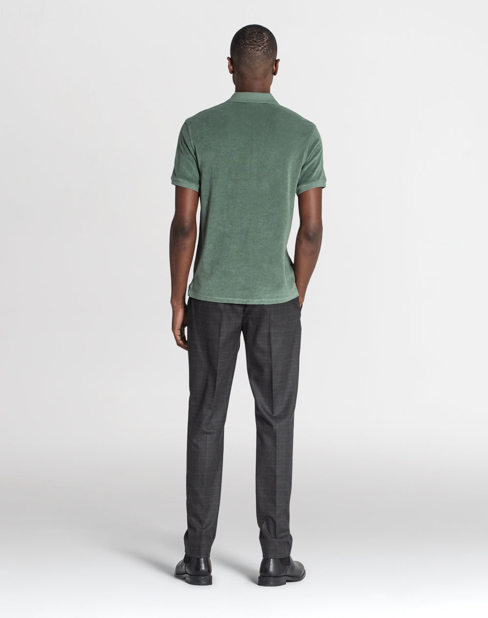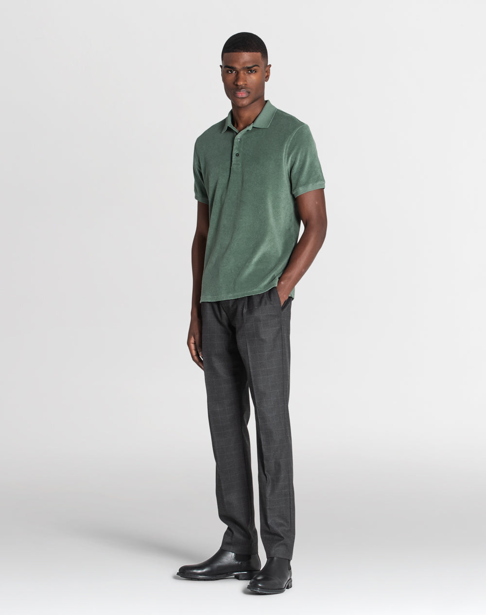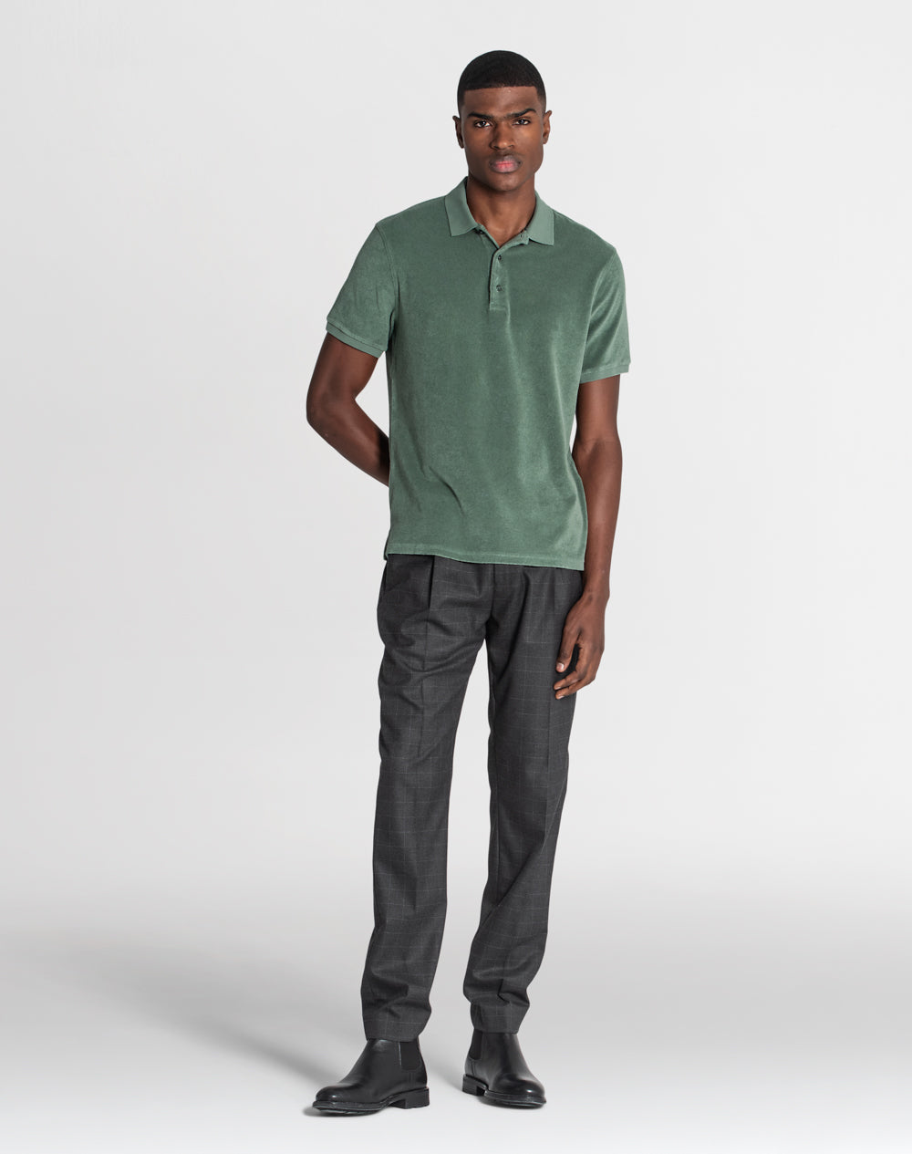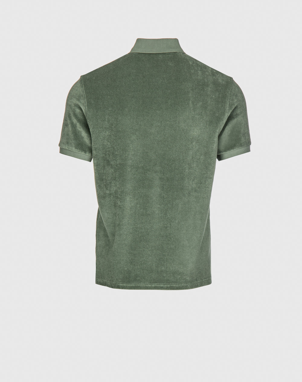 Polo básico em peluche com manga curta. Abertura no meio-frente através botões. Tapa-costuras com as cores da marca. Pequenas rachas nas laterais.