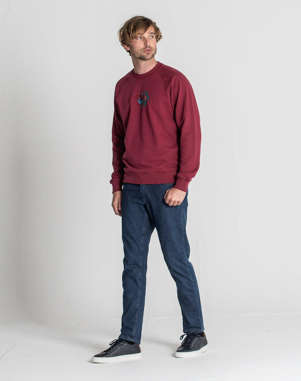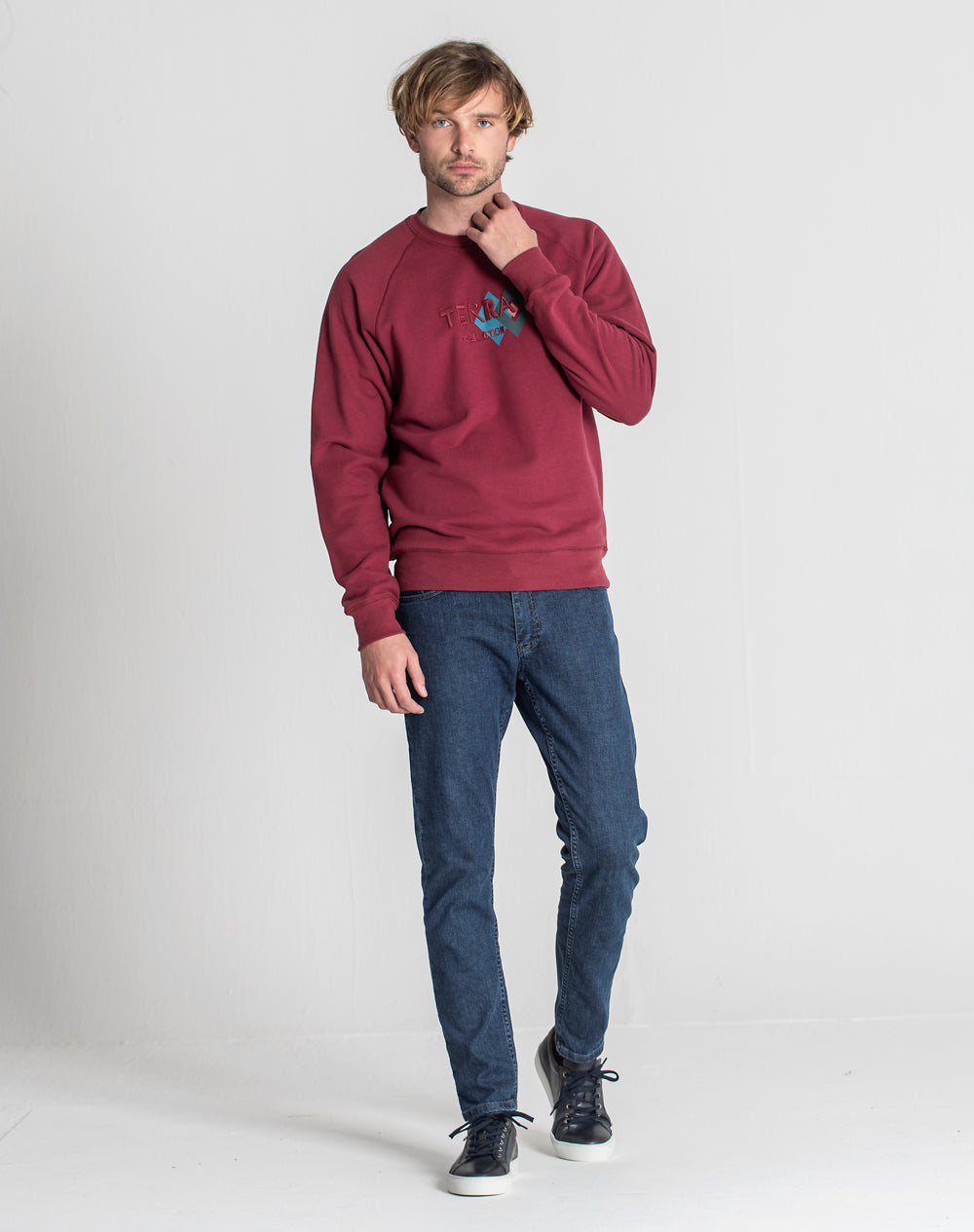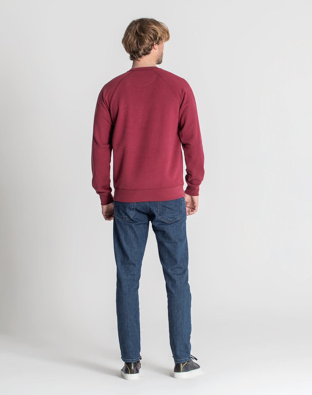 Sweatshirt com manga raglan. Desenho estampado e bordado na frente. Cavas e gola com recobrimento de 3 agulhas. Meia-lua em tecido estampado do all-over alusivo ao conceito da coleção 100% algodão orgânico.
