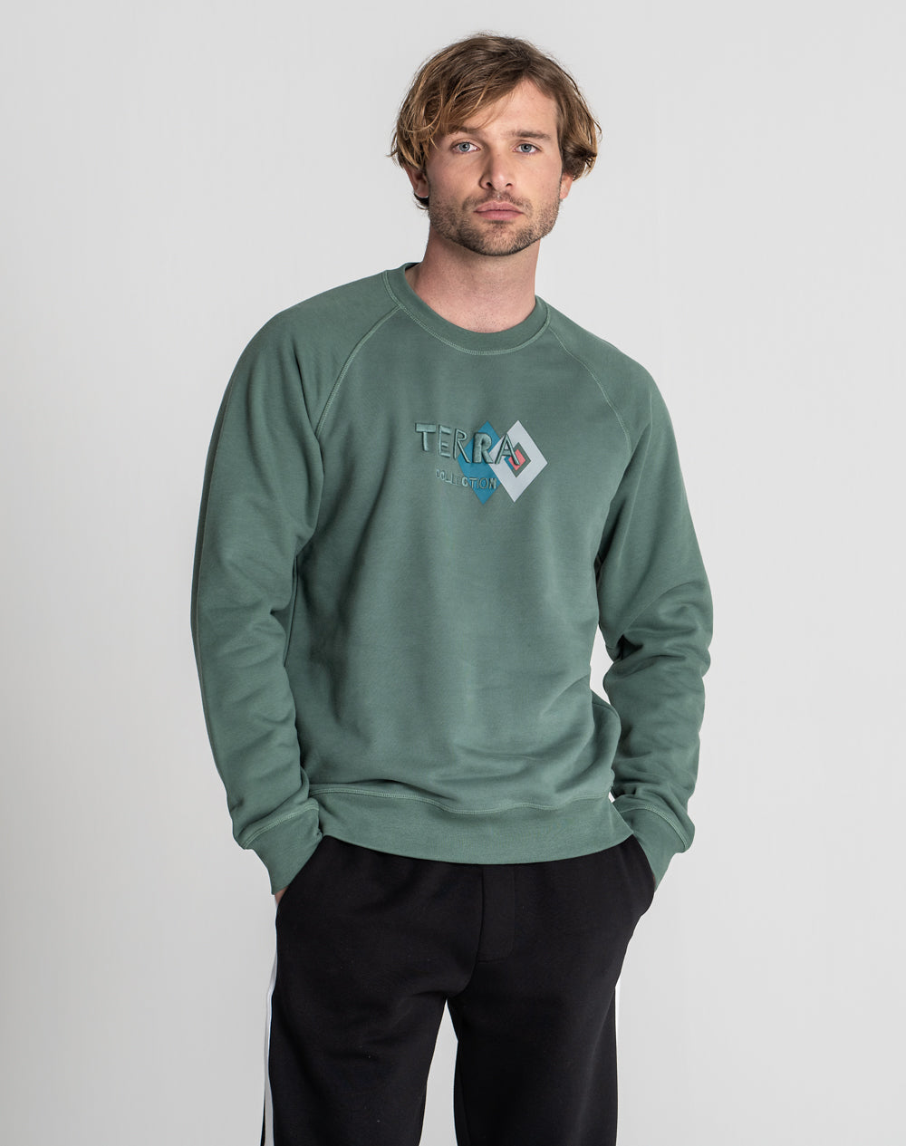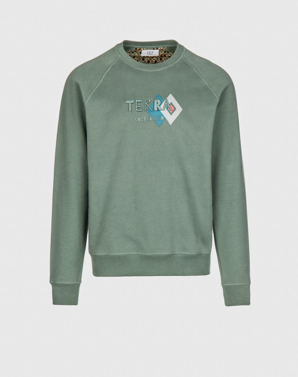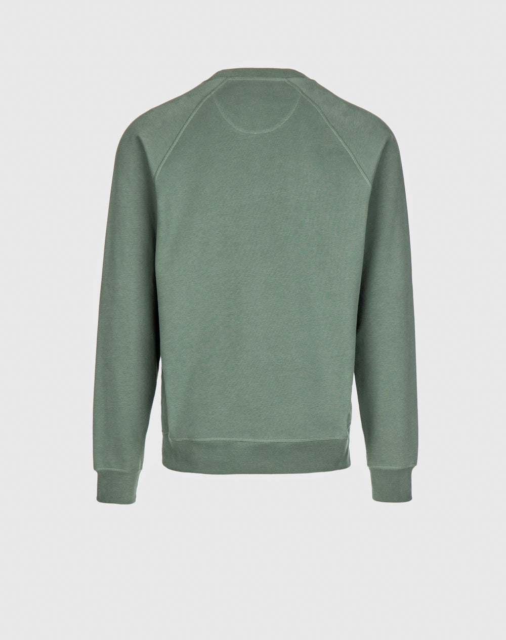 Sweatshirt com manga raglan. Desenho estampado e bordado na frente. Cavas e gola com recobrimento de 3 agulhas. Meia-lua em tecido estampado do all-over alusivo ao conceito da coleção 100% algodão orgânico.