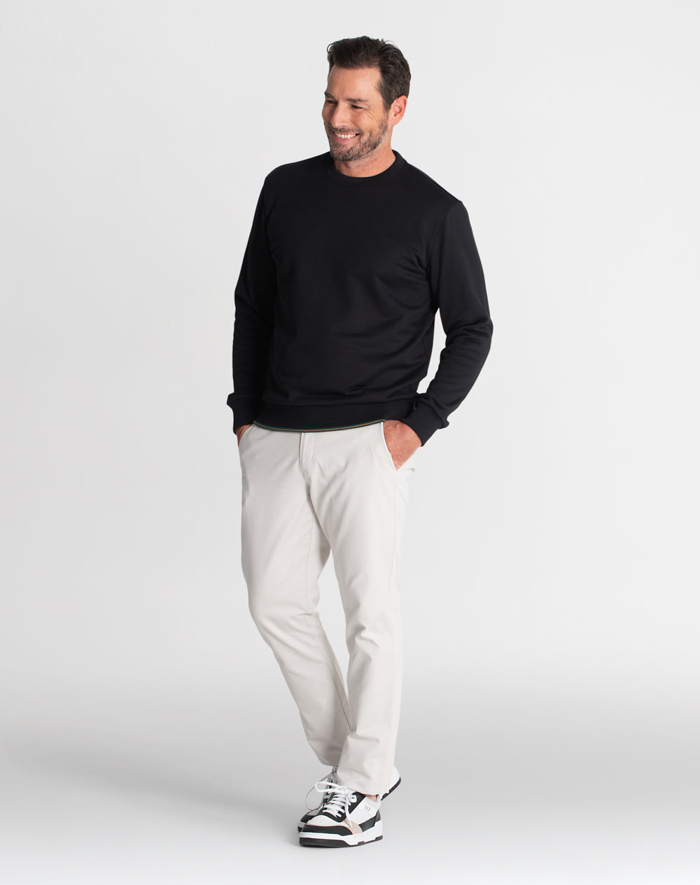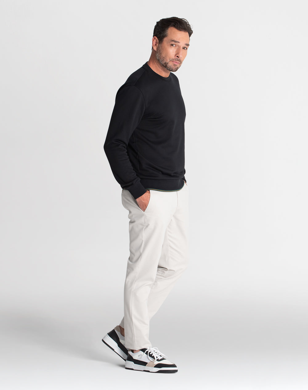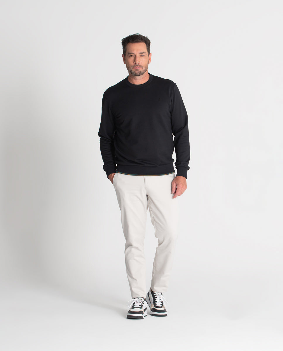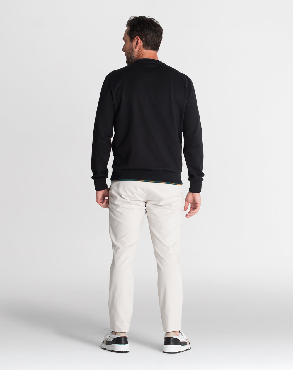 à cor da peça. Tira-reta no cinto com as cores da marca. Tapa-costuras com cores da marca.