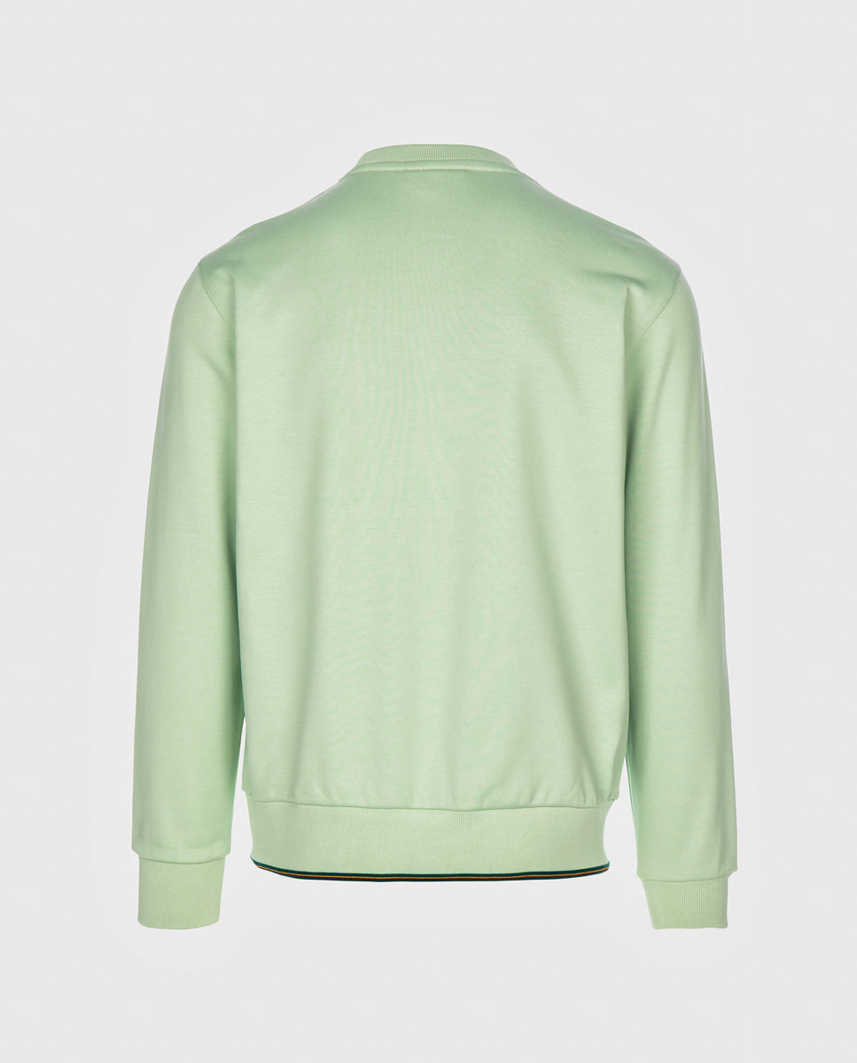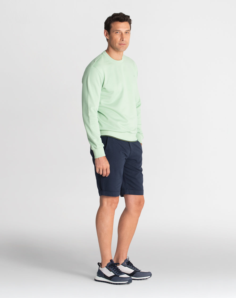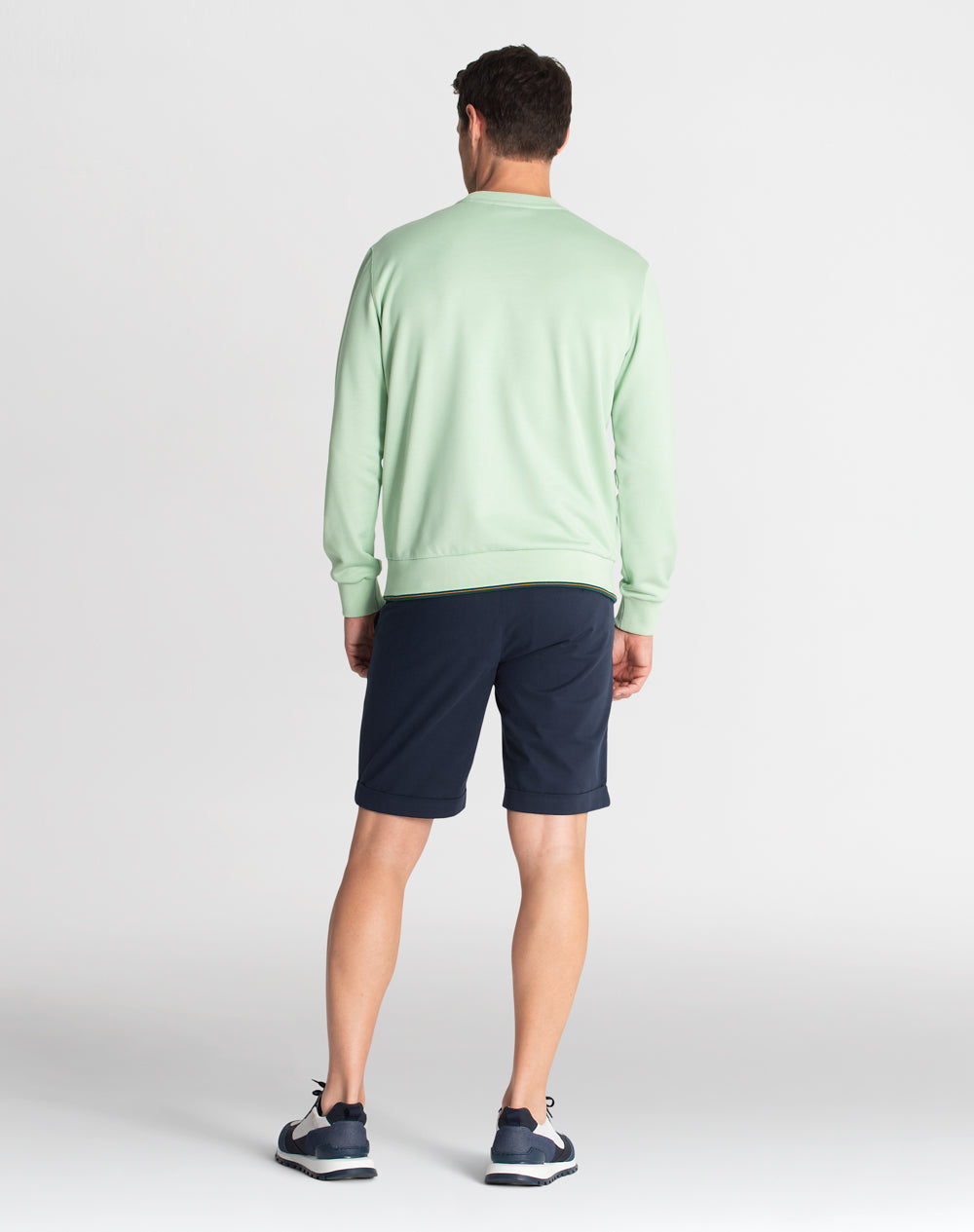 à cor da peça. Tira-reta no cinto com as cores da marca. Tapa-costuras com cores da marca.