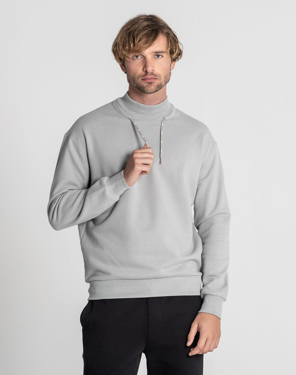 Sweatshirt de gola alta com manga normal ligeiramente mais descida. Túnel com cordão personalizado à volta do decote da gola.