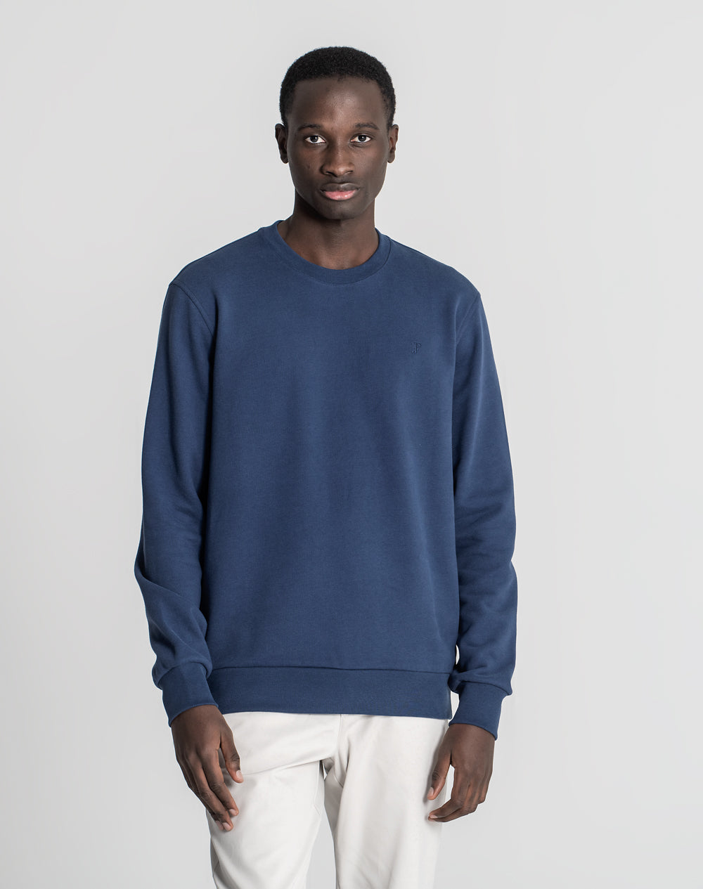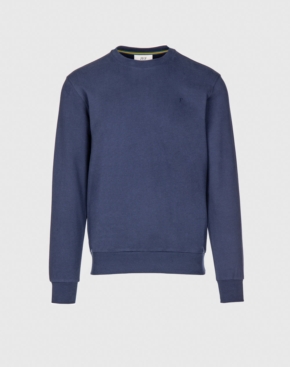Sweatshirt básica de decote redondo. Manga normal. Logótipo bordado à cor da peça. Tapa-costuras através de fita de nastro com as cores da marca.