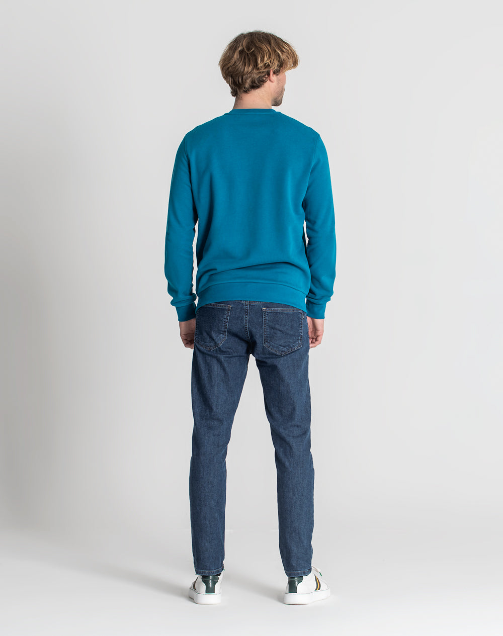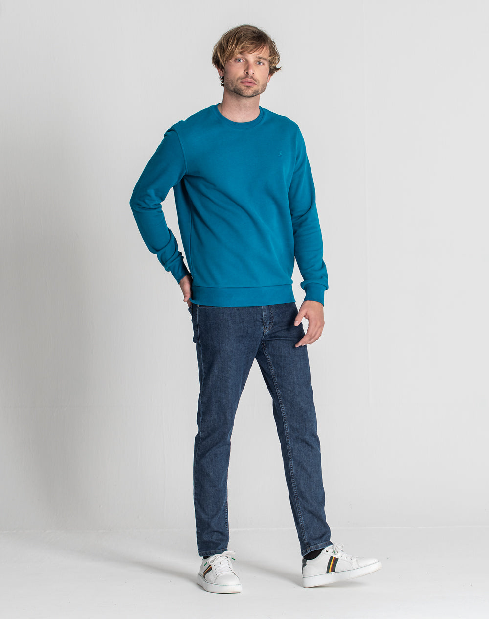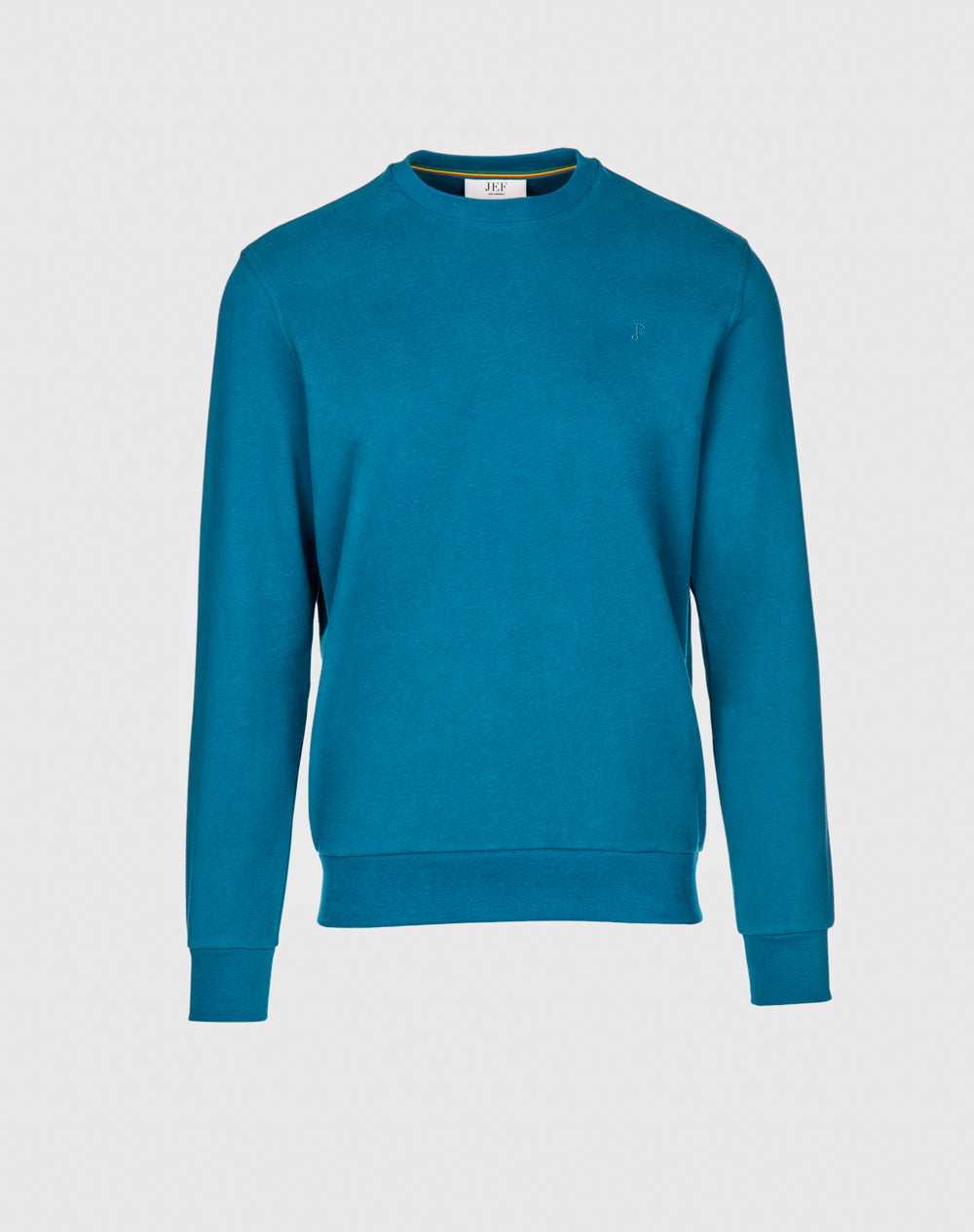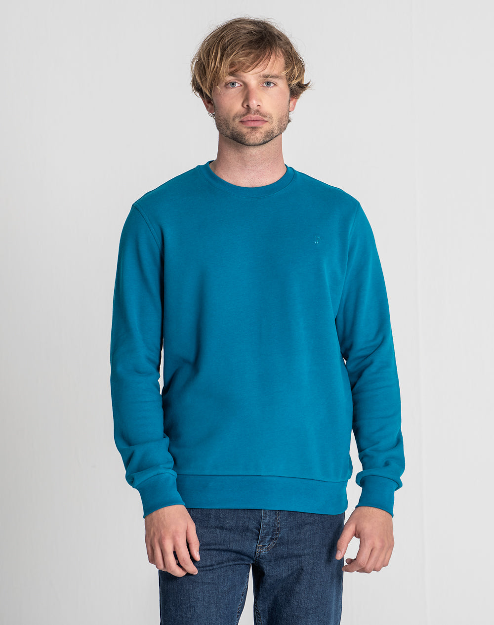Sweatshirt básica de decote redondo. Manga normal. Logótipo bordado à cor da peça. Tapa-costuras através de fita de nastro com as cores da marca.