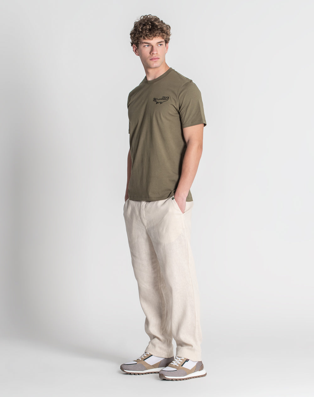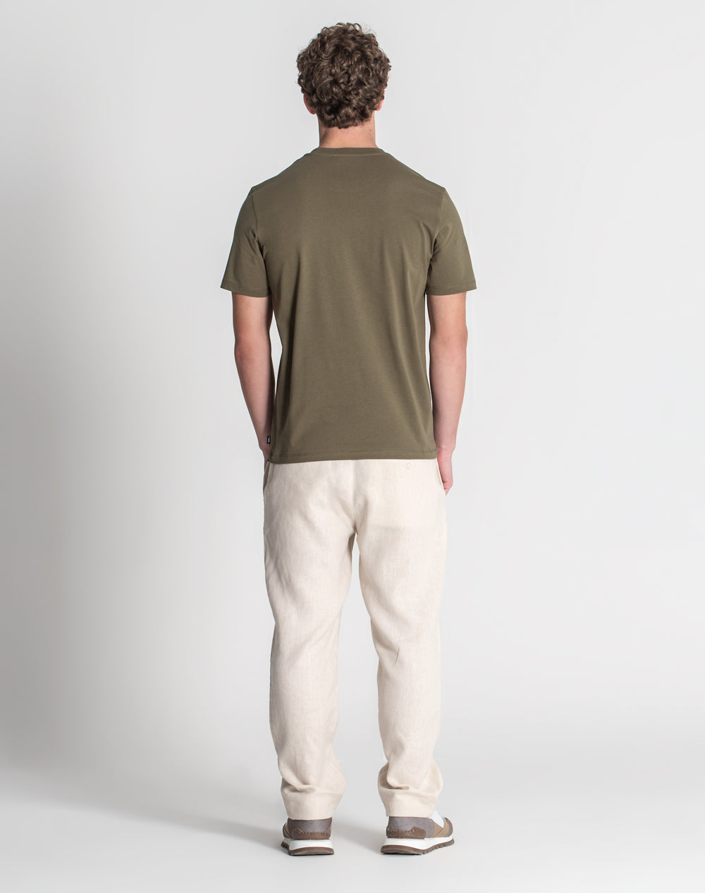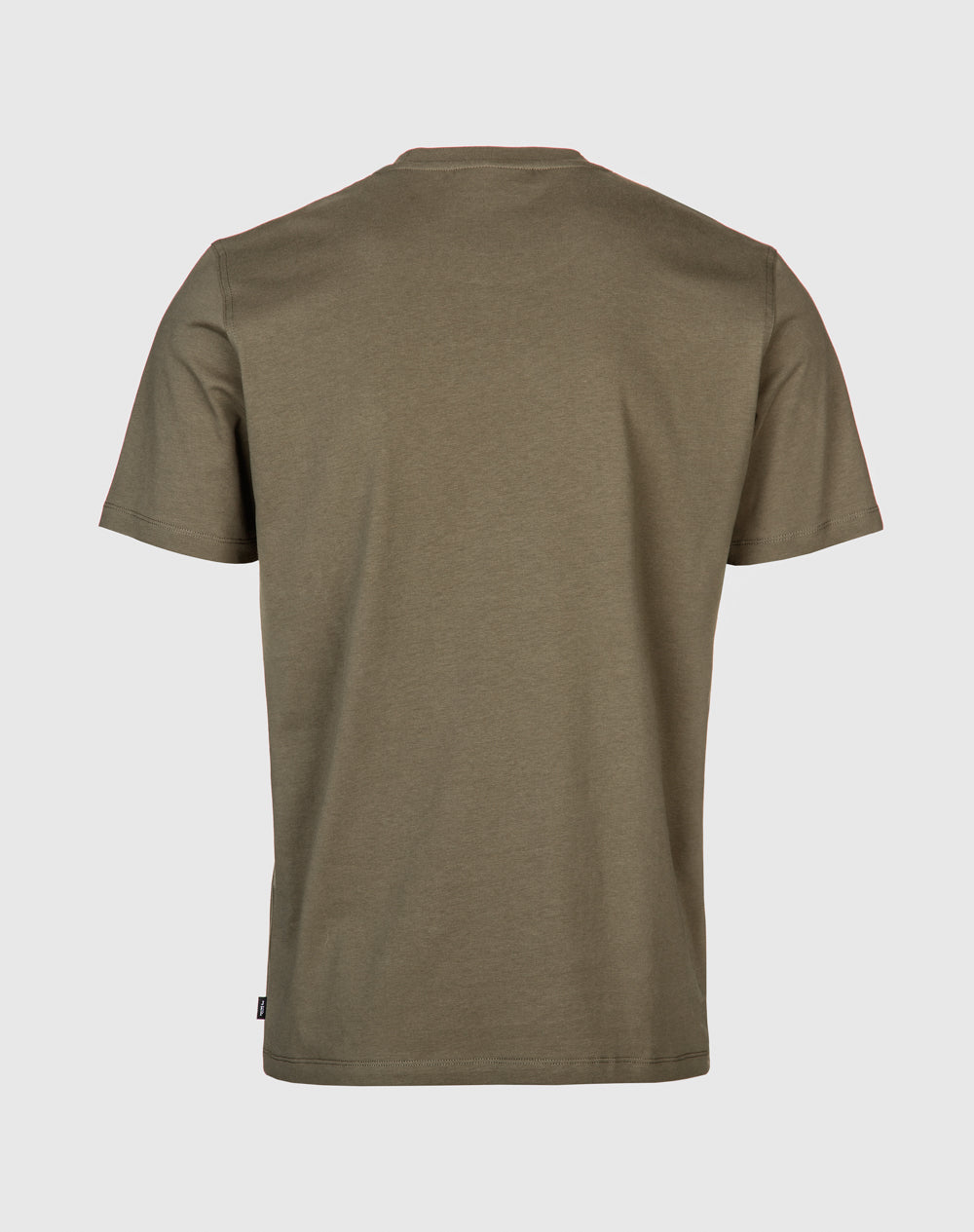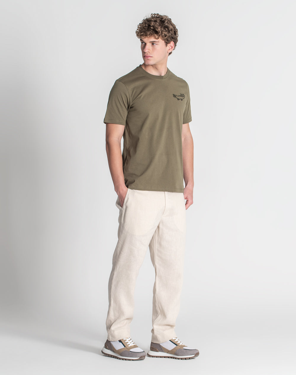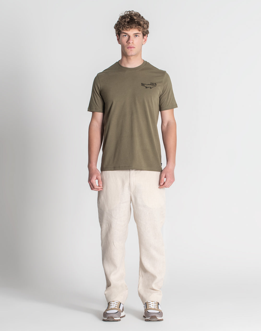 T-shirt em algodão regenagri com decote redondo. Tapa-costuras na própria malha. Logótipo JEF bordado com desenho de crocodilo na frente. Etiqueta JEF preta metida na costura lateral.