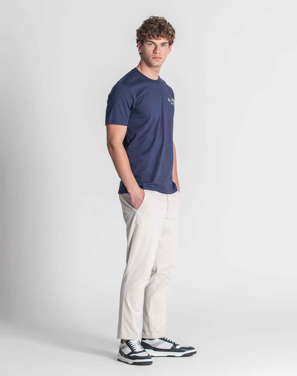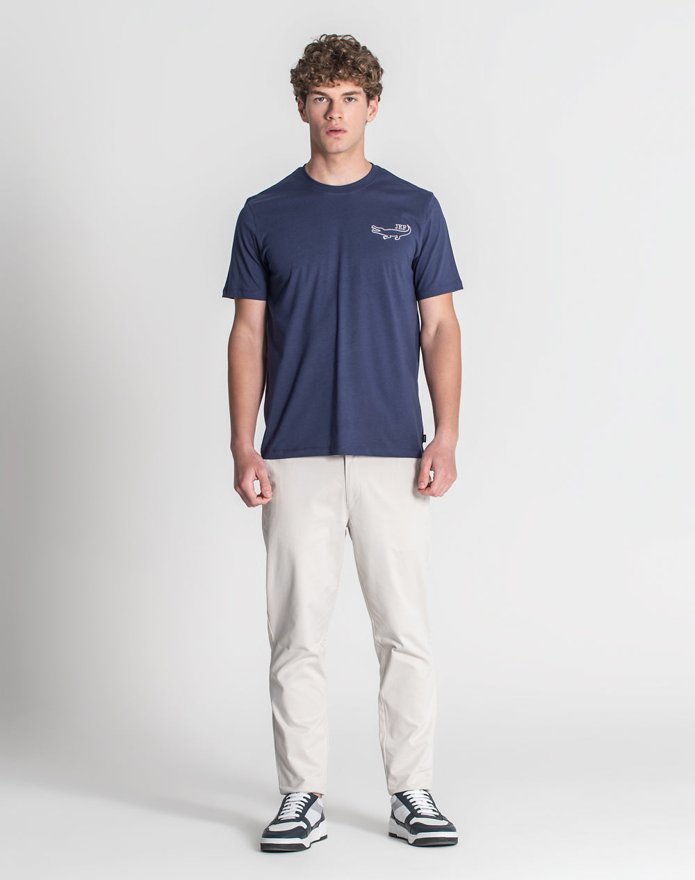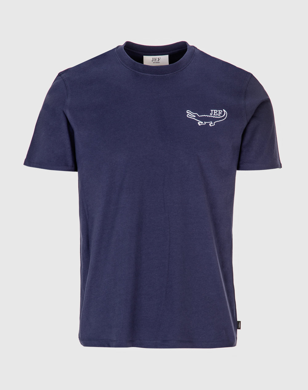 T-shirt em algodão regenagri com decote redondo. Tapa-costuras na própria malha. Logótipo JEF bordado com desenho de crocodilo na frente. Etiqueta JEF preta metida na costura lateral.