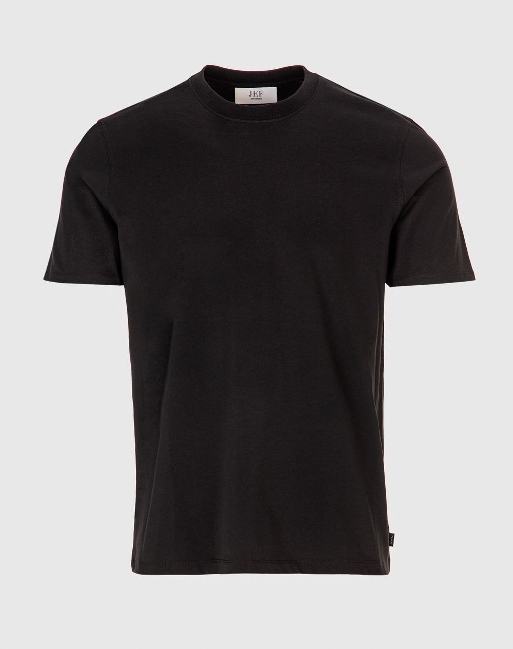 T-shirt em algodão regenagri com decote redondo. Tapa-costuras na própria malha. Desenho de crocodilo nas costas. Etiqueta JEF preta metida na costura lateral.