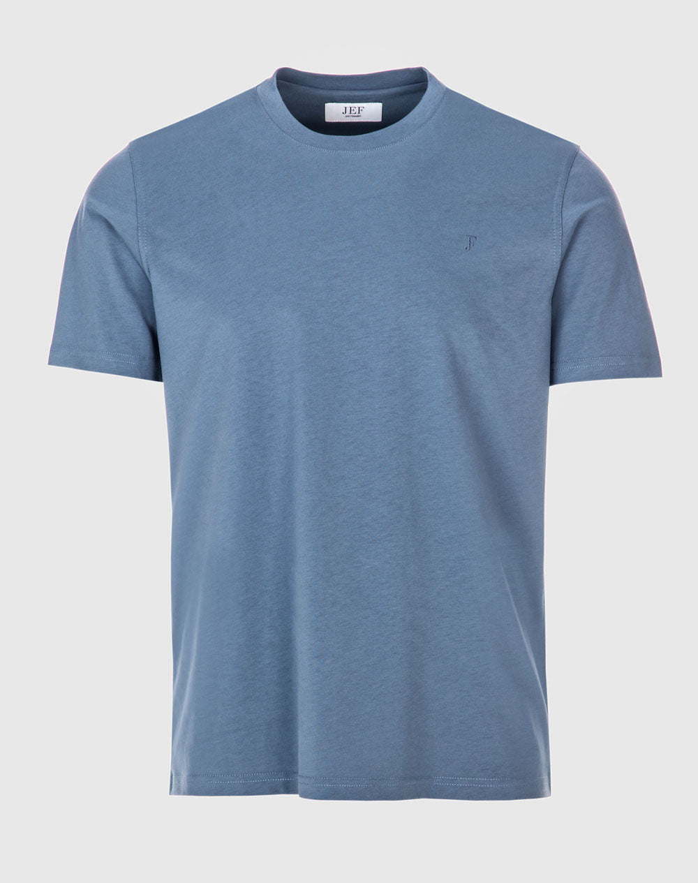 T-shirt em jersey orgânico com decote redondo. Meia-lua nas costas na própria malha com bordado JEF à cor da peça.