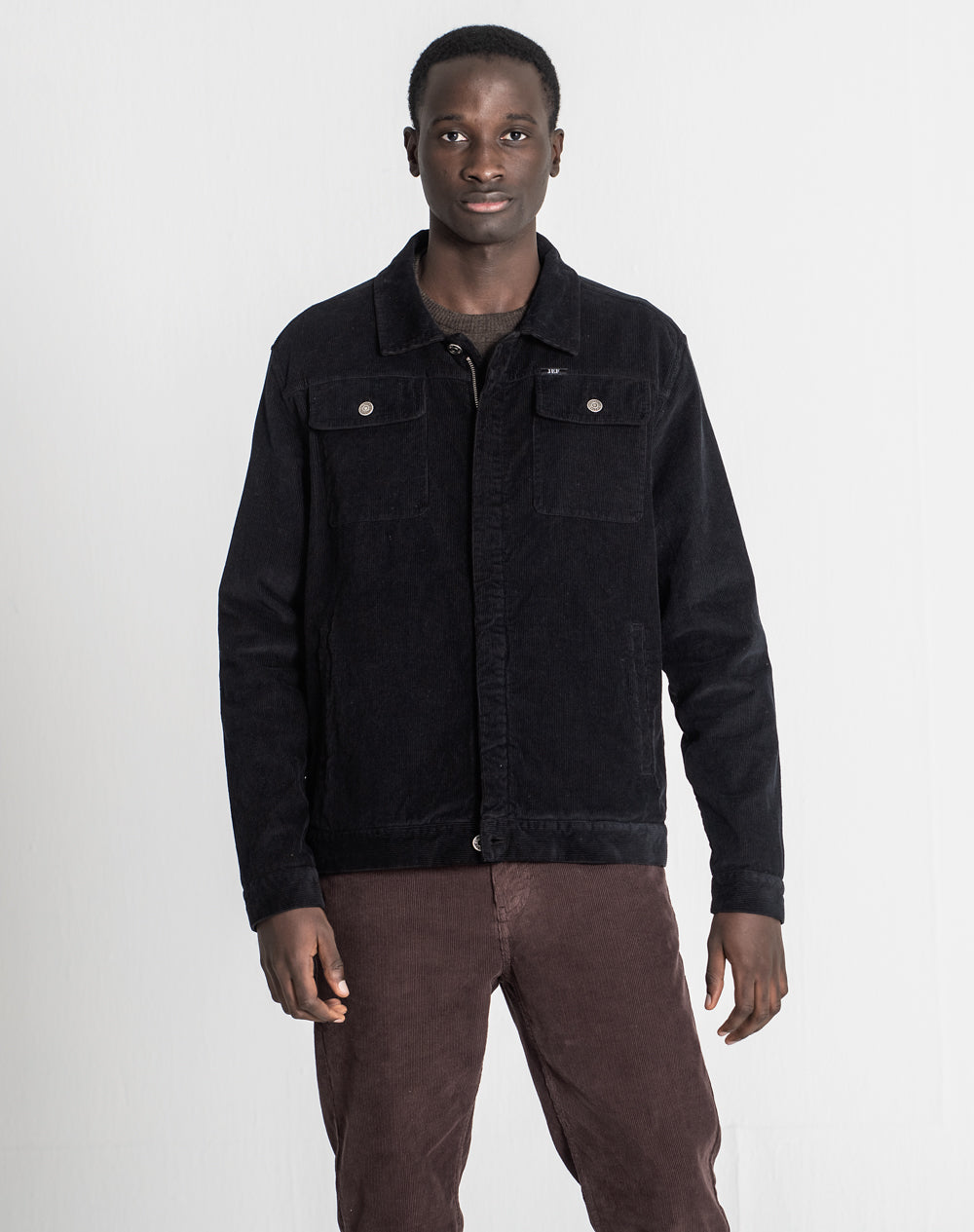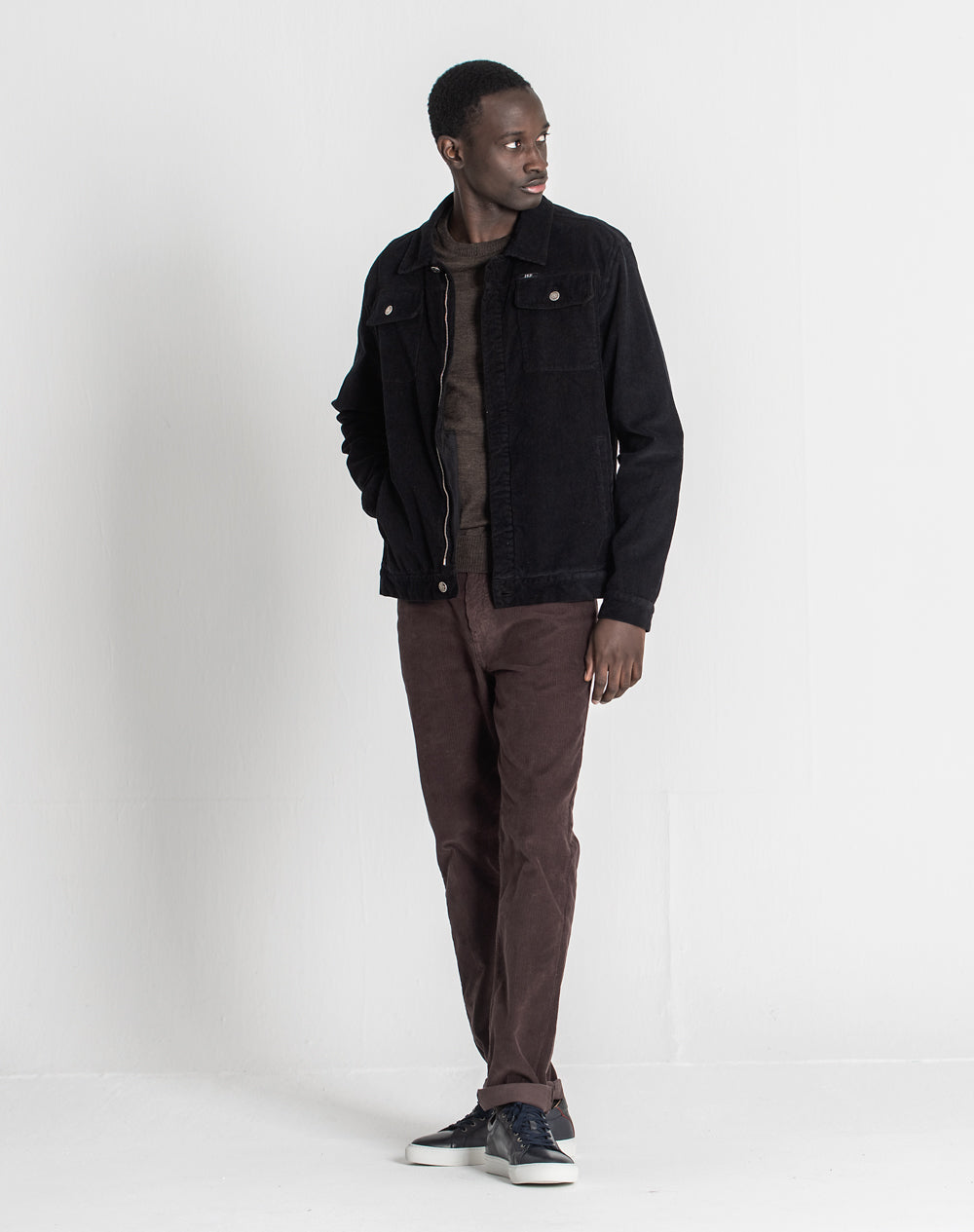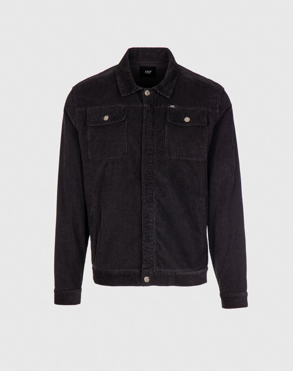 Casaco estilo trucker em bombazine com costuras avivadas em tecido estampado (all-over alusivo ao tema da coleção). Bolsos de chapa com pala. Abertura no meio frente através de botões de prego. Bolsos de vivo nas laterais. Etiqueta JEF na horizontal.