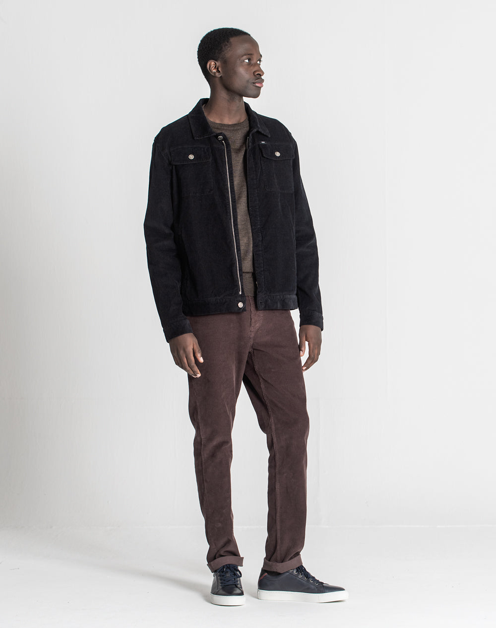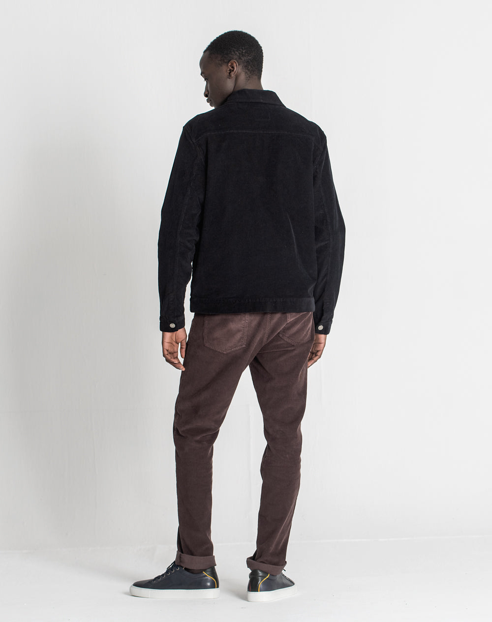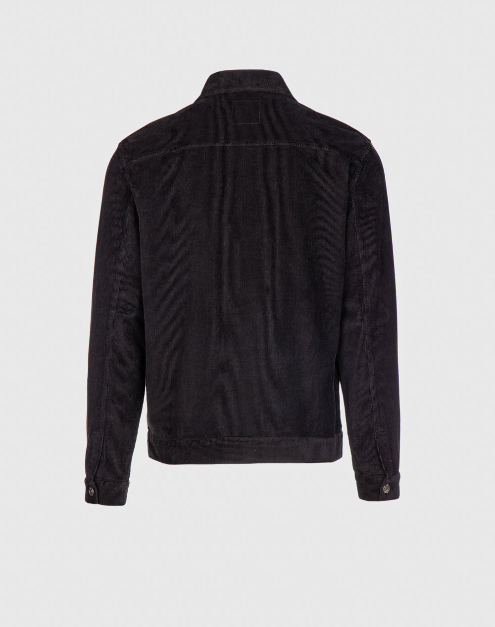 Casaco estilo trucker em bombazine com costuras avivadas em tecido estampado (all-over alusivo ao tema da coleção). Bolsos de chapa com pala. Abertura no meio frente através de botões de prego. Bolsos de vivo nas laterais. Etiqueta JEF na horizontal.