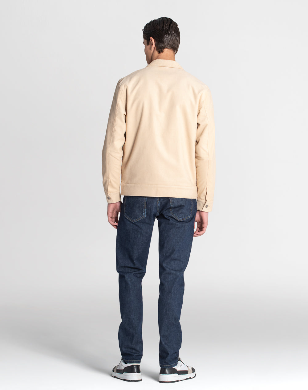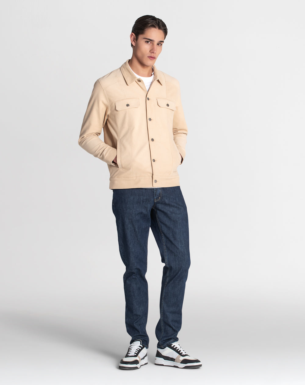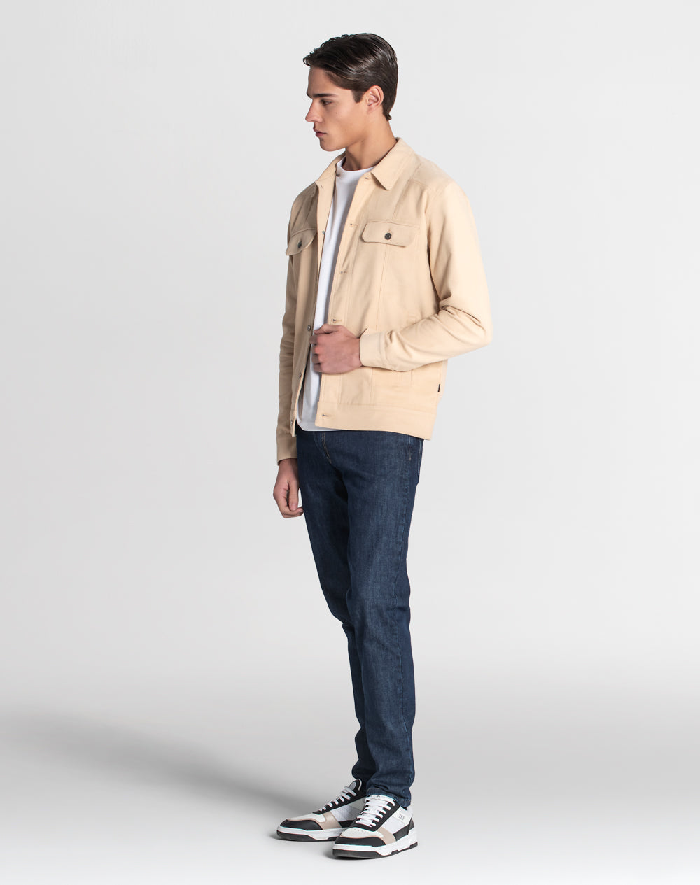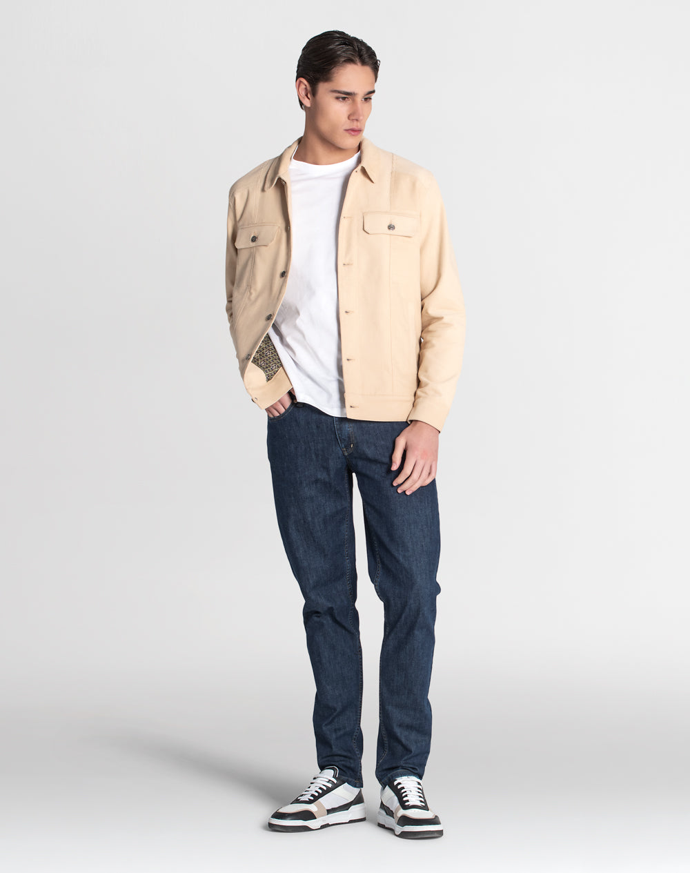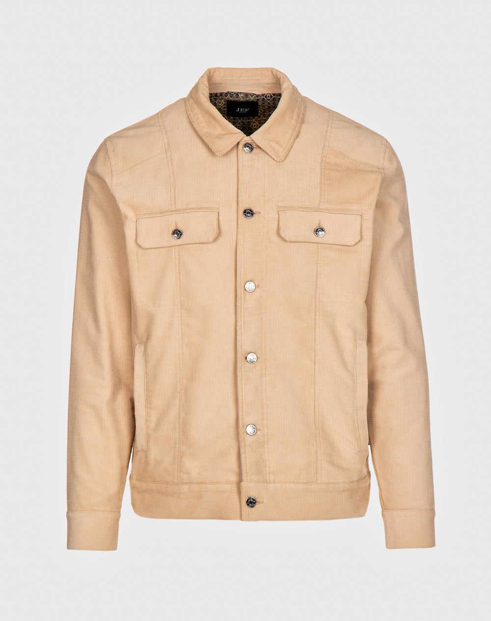 Casaco estilo trucker 100% algodão orgânico com efeito waffle. Estilo regular fit. Bolsos de chapa com pala. Abertura no meio frente através de botões de prego. Bolsos de vivo nas laterais. Etiqueta JEF preta na vertical pregada na lateral. Interior da peça forrado em tecido estampado (all-over alusivo ao conceito da coleção).