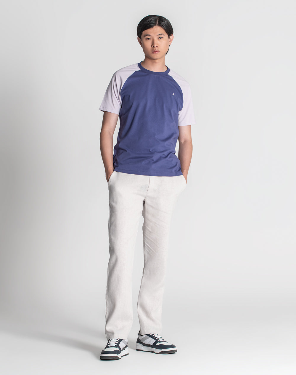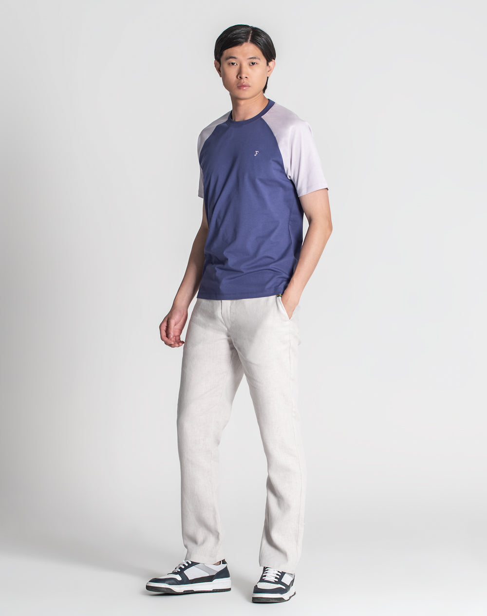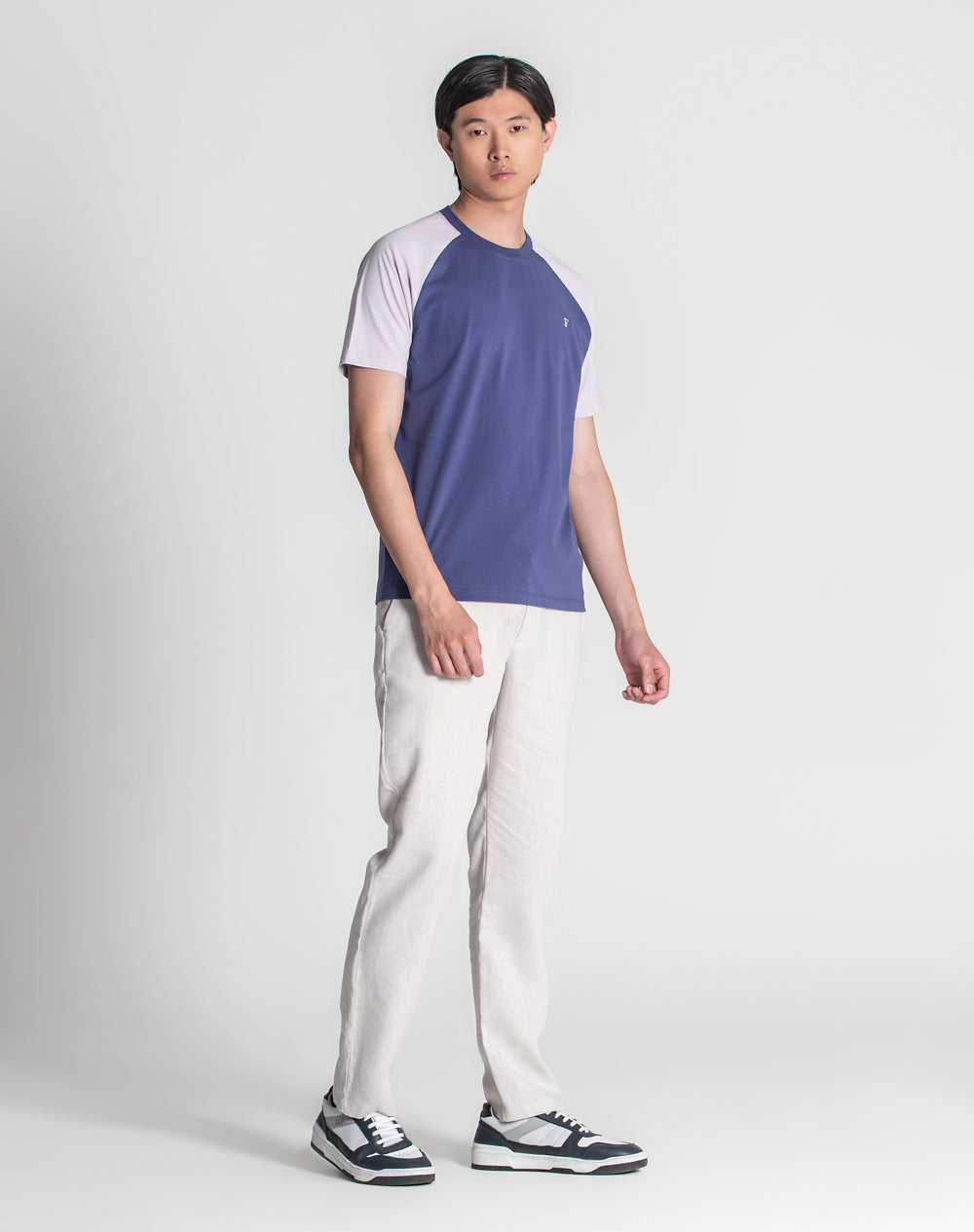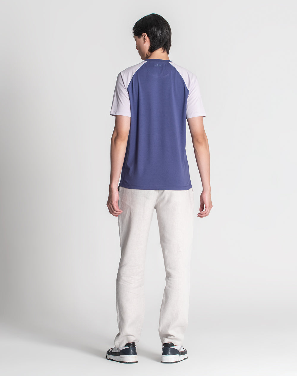 T-shirt em algodão regenagri com decote redondo. Manga raglan a contrastar com restante peça. Logótipo ícon da marca na frente bordado na cor de contraste. Meia-lua em tecido estampado alusivo ao tema da coleção. Logótipo JEF bordado nas costas à cor da peça.