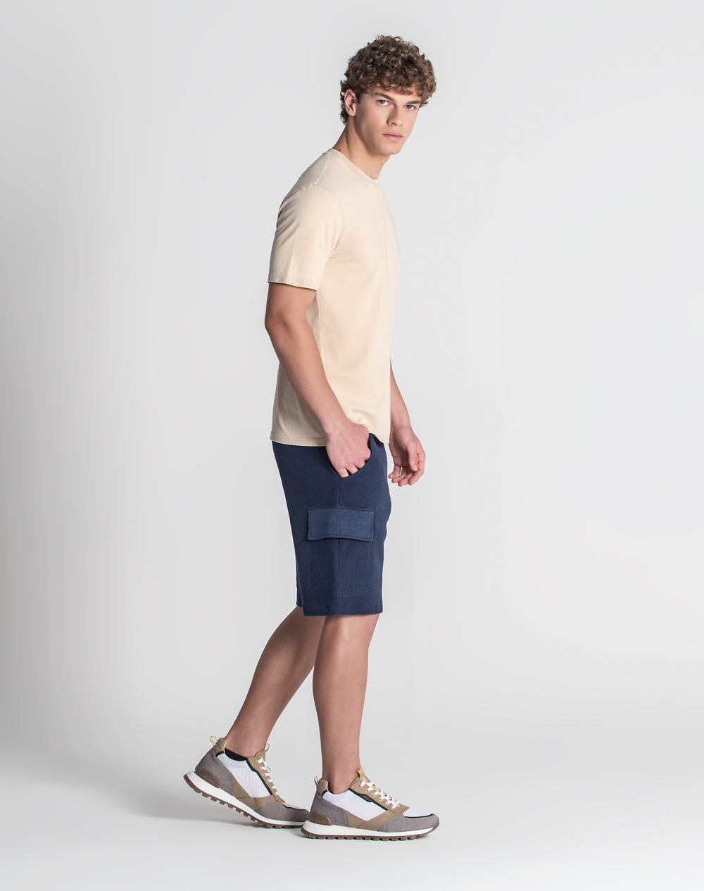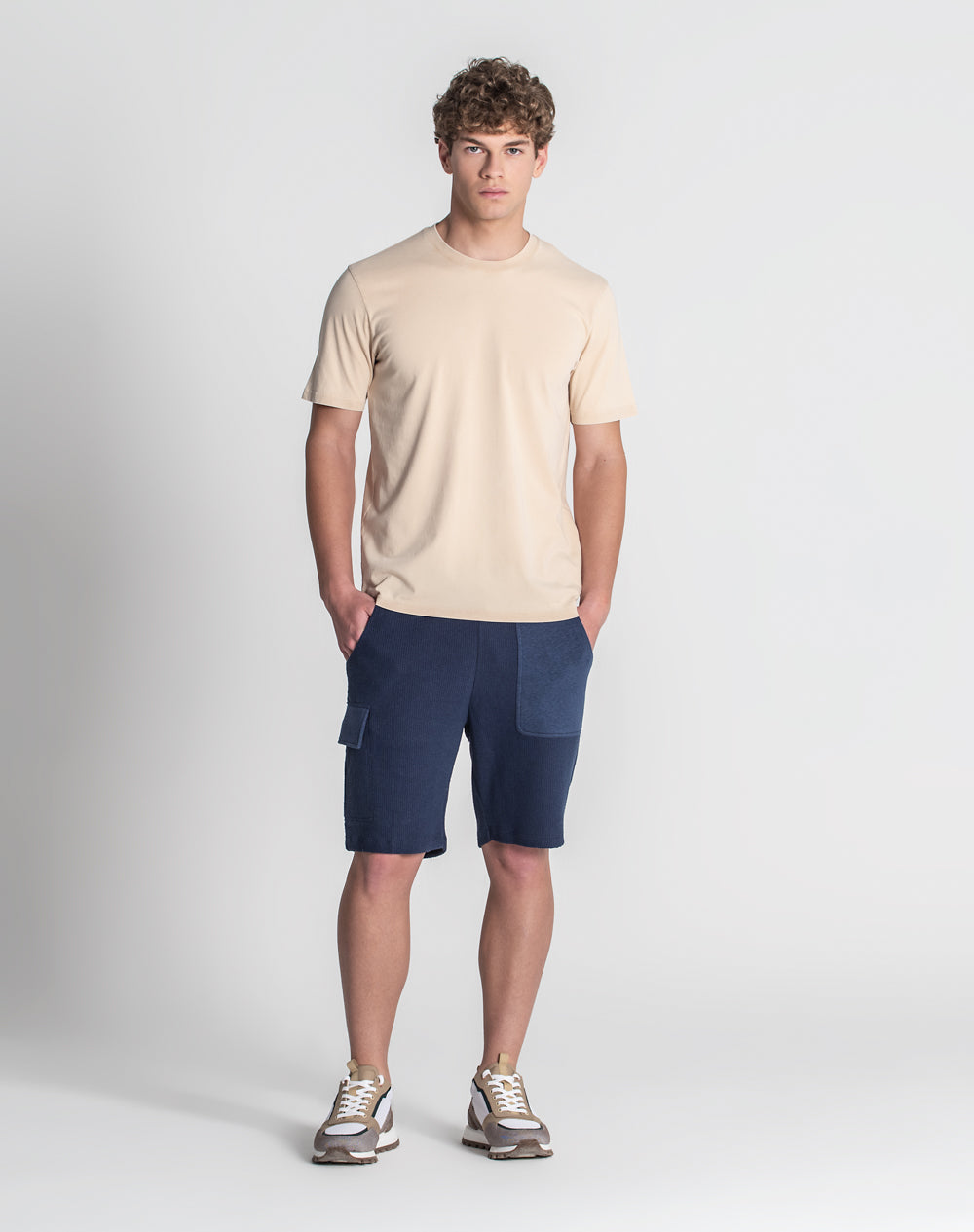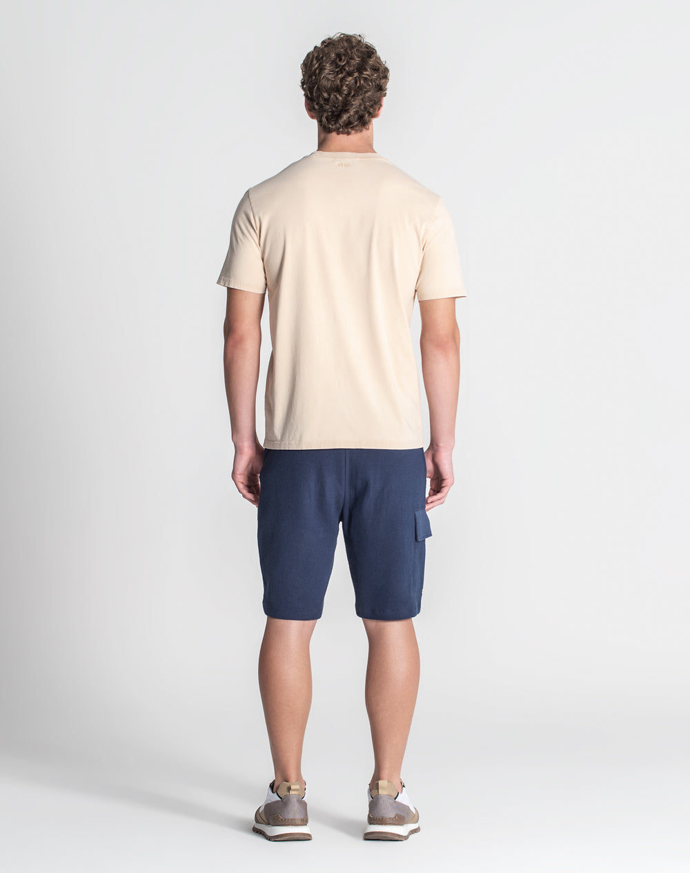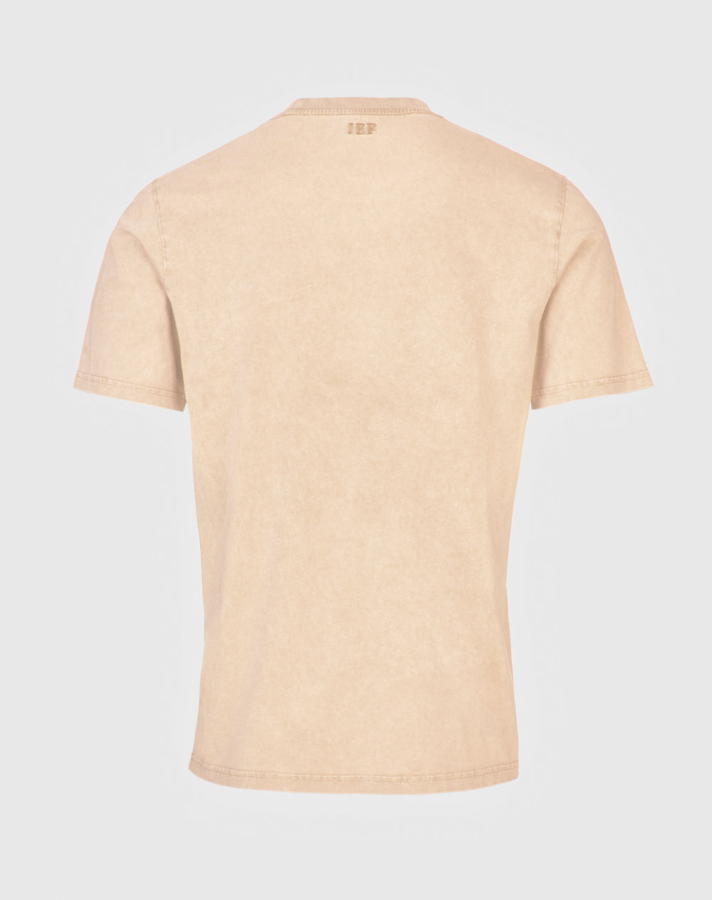 T-shirt em jersey orgânico com decote redondo. Acabamento de desgaste por toda a peça. Tapa-costuras na própria malha. Logótipo JEF bordado nas costas à cor da peça. Etiqueta JEF preta metida na costura lateral.