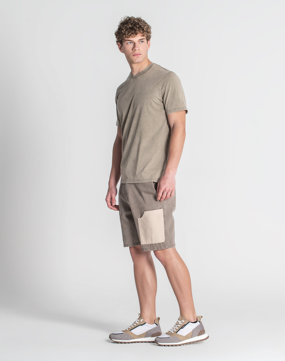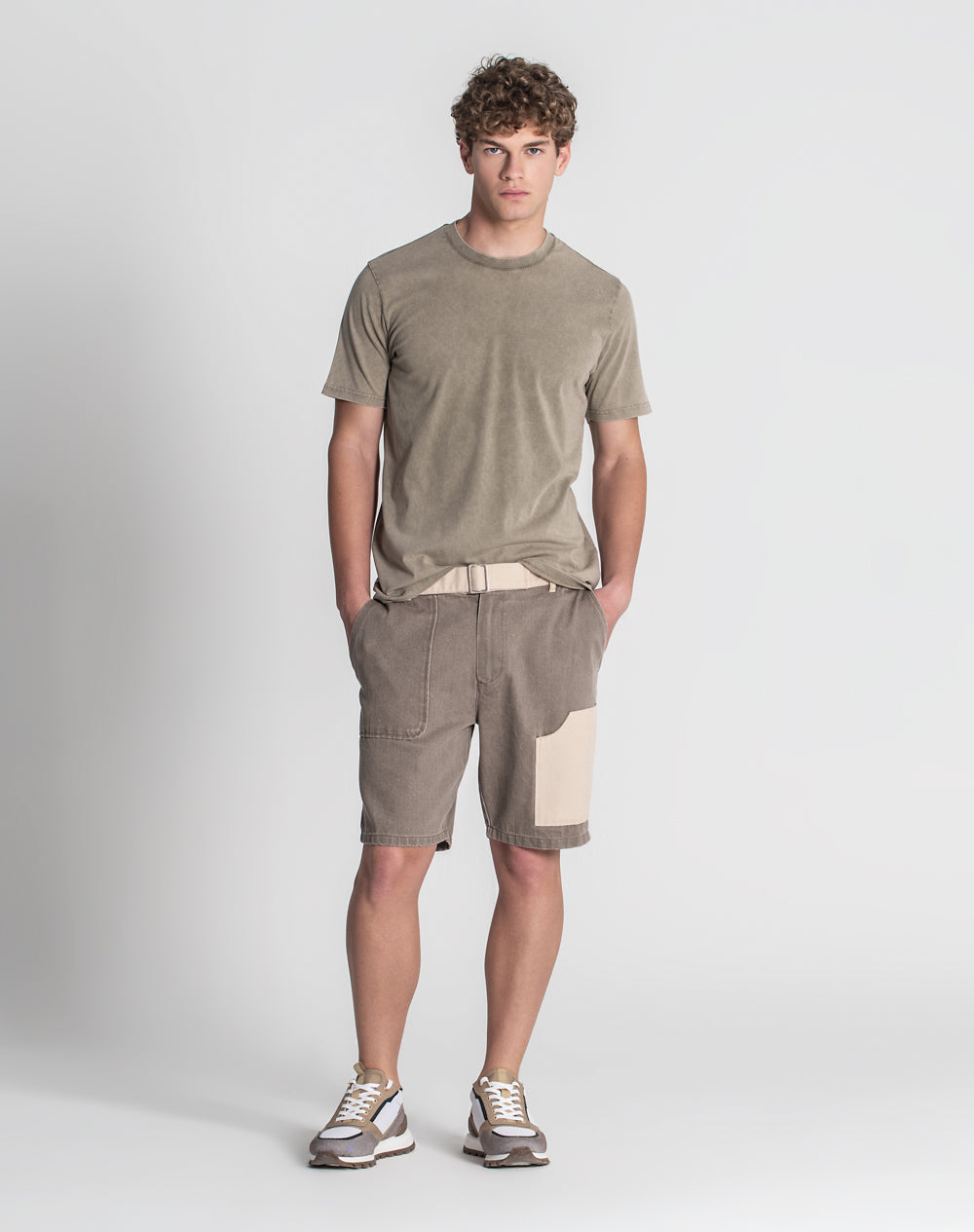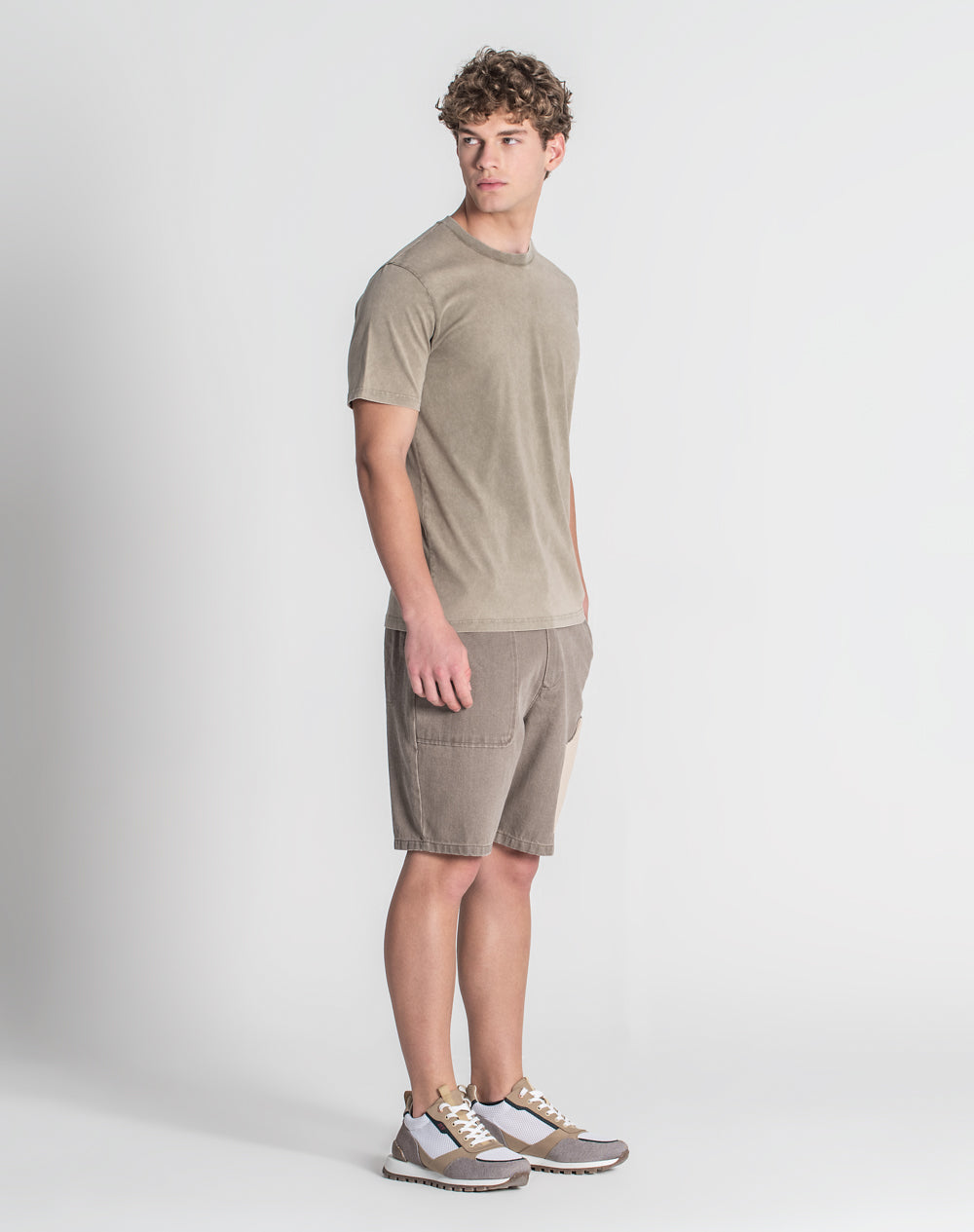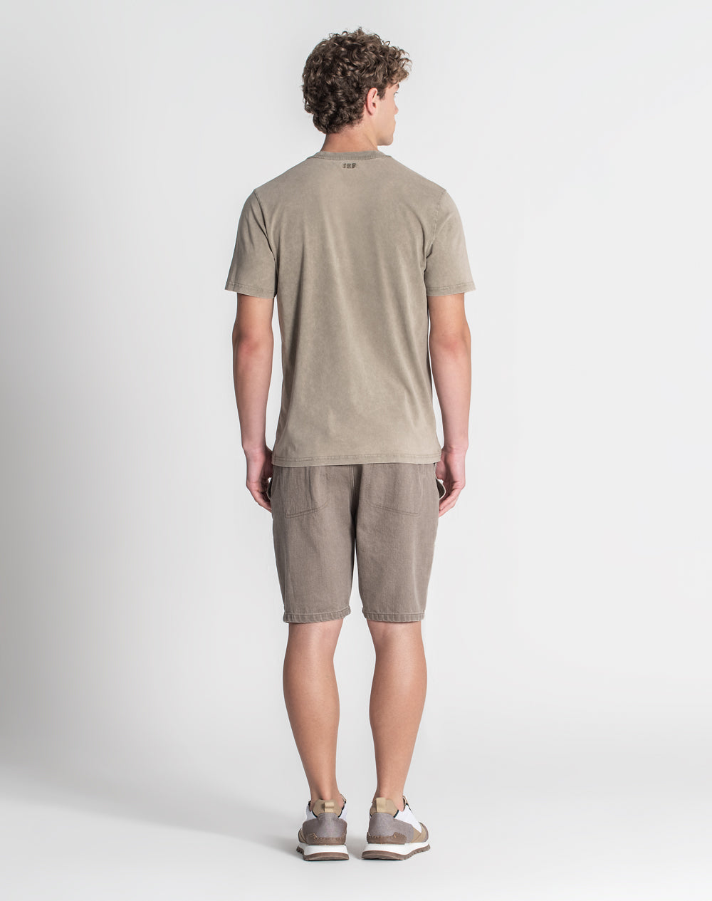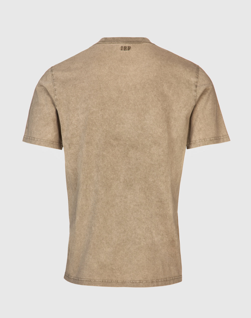 T-shirt em jersey orgânico com decote redondo. Acabamento de desgaste por toda a peça. Tapa-costuras na própria malha. Logótipo JEF bordado nas costas à cor da peça. Etiqueta JEF preta metida na costura lateral.