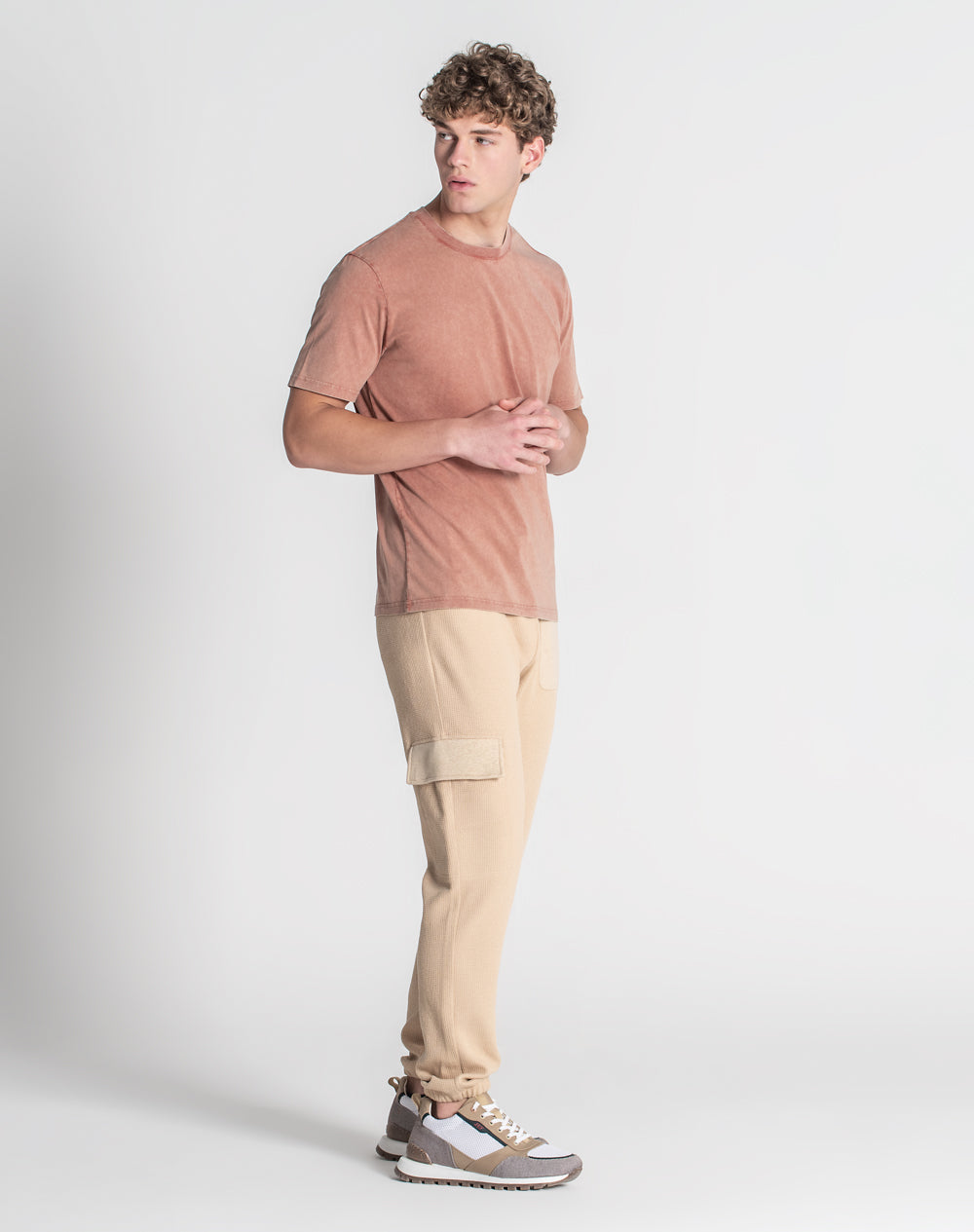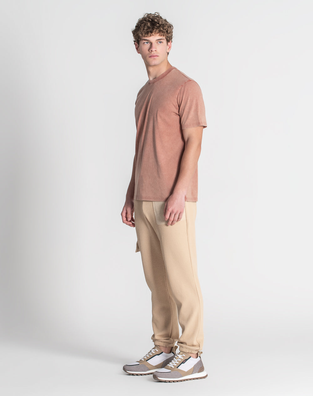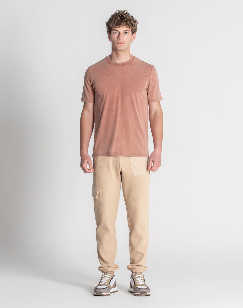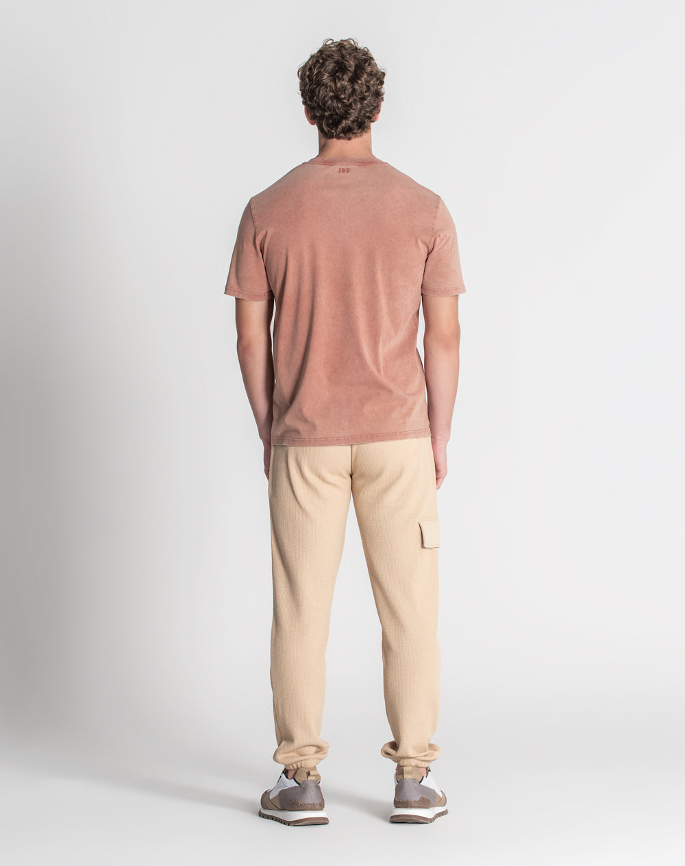 T-shirt em jersey orgânico com decote redondo. Acabamento de desgaste por toda a peça. Tapa-costuras na própria malha. Logótipo JEF bordado nas costas à cor da peça. Etiqueta JEF preta metida na costura lateral.