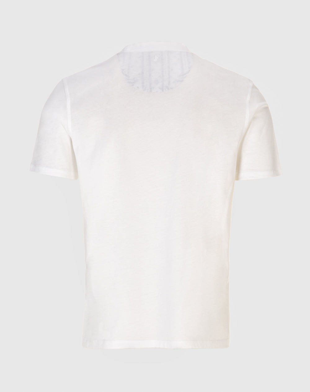 T-shirt em algodão regenagri com decote redondo. Logótipo JEF na frente bordado à cor da peça. Meia-lua em tecido estampado alusivo ao tema da coleção. Logótipo da marca bordado nas costas à cor da peça.
