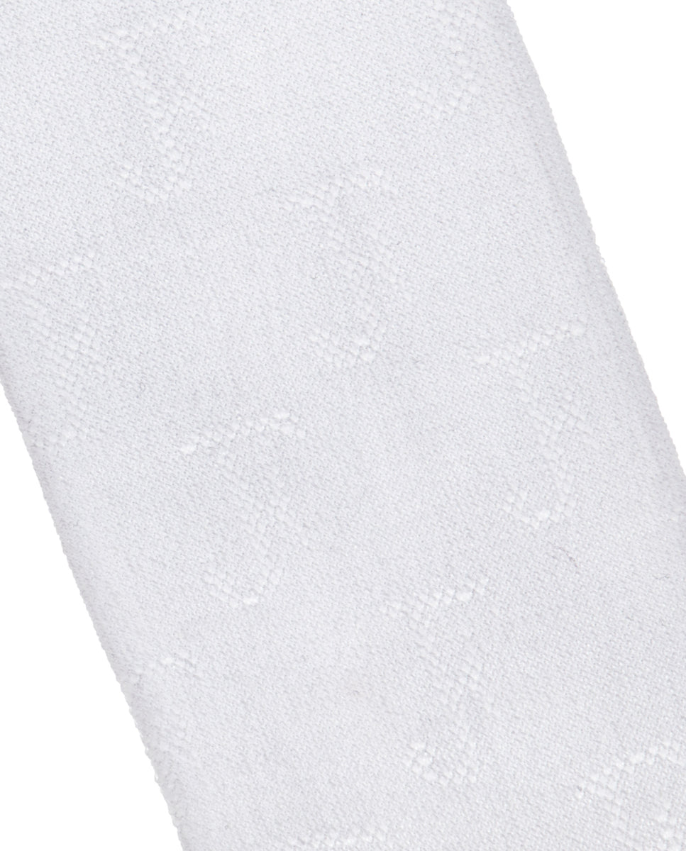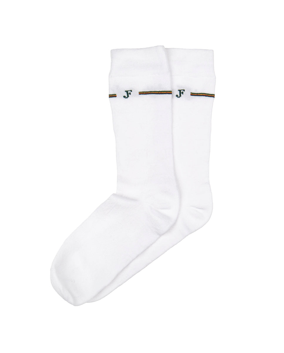 Meias em algodão PGM com logótipo da marca através da técnica de pontos de respiração (piquet). Riscas com cores da marca na parte superior. Acabamento silicone. Tratamento de eliminação das impurezas existentes do algodão com efeito brilhante.