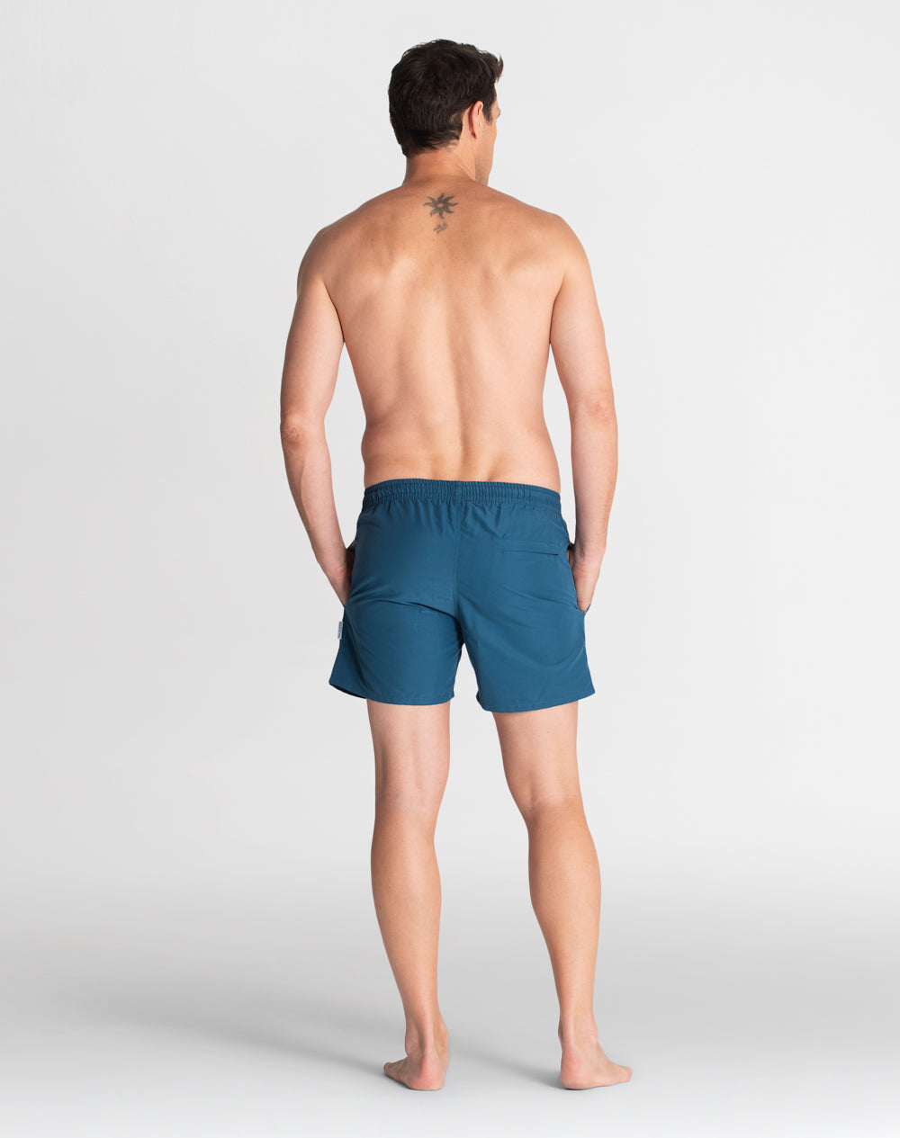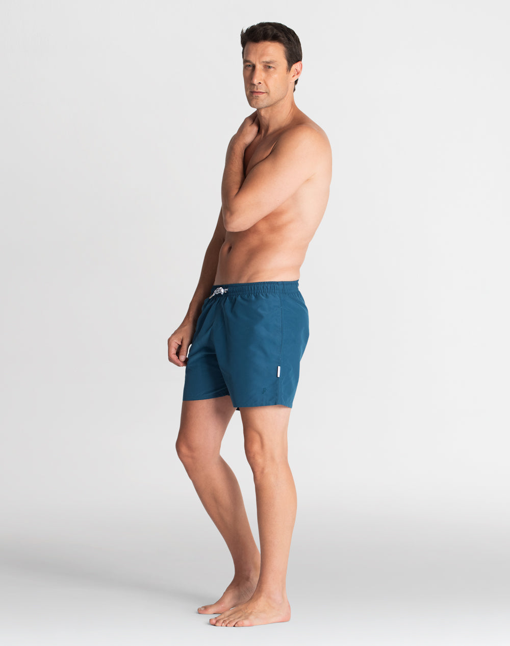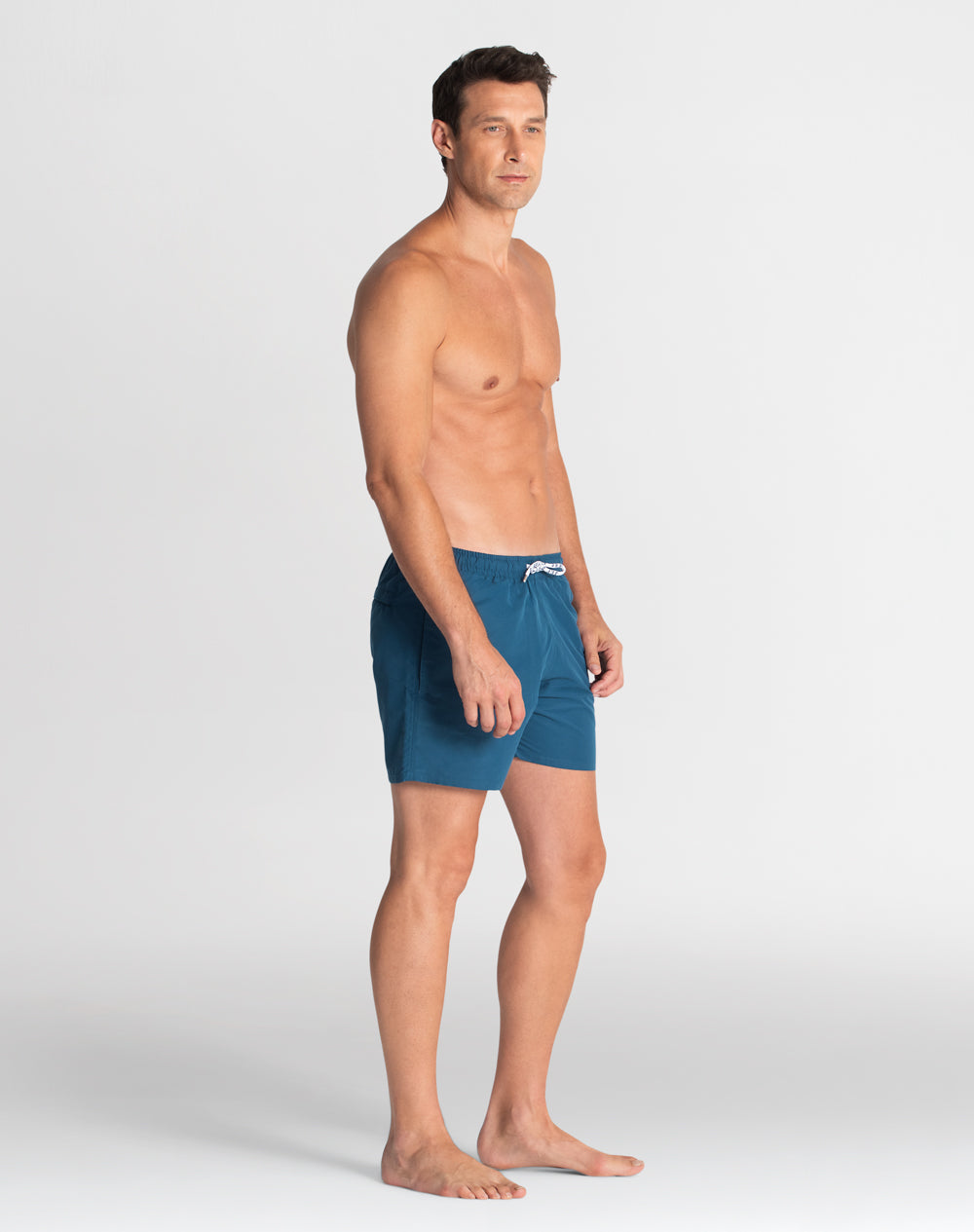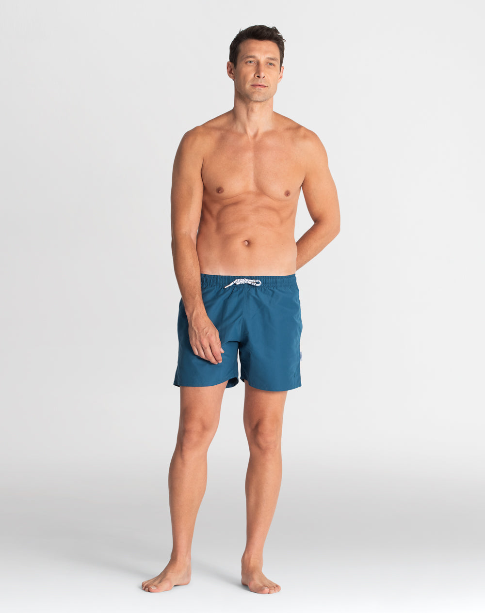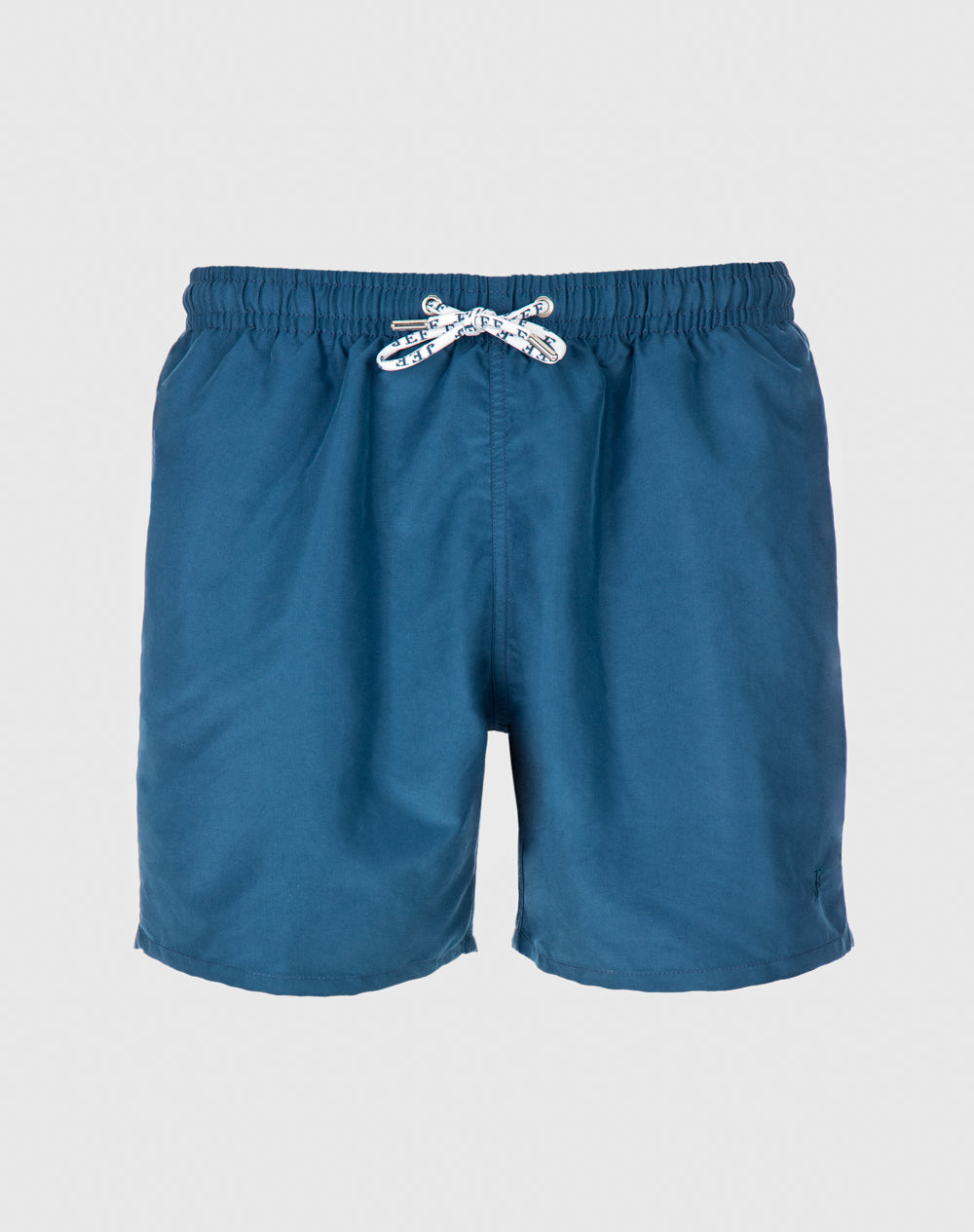 Calção de banho sustentável com elástico no cinto. Bolsos metidos na costura. Bolso de vivo nas costas. Interior forrado com rede para melhor conforto. Cordões brancos e ponteiras em metal personalizadas. Aplicação de borracha com logótipo da marca.