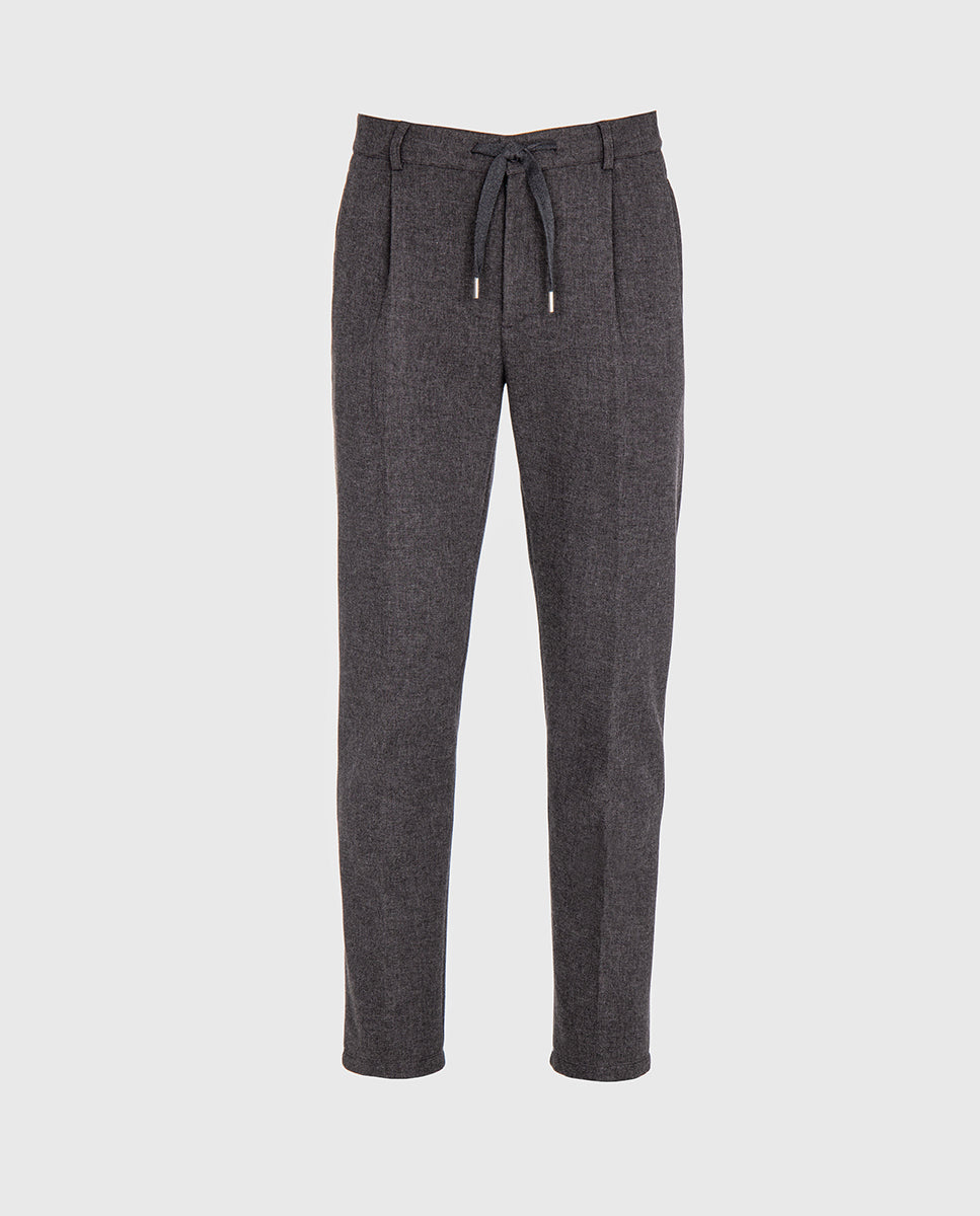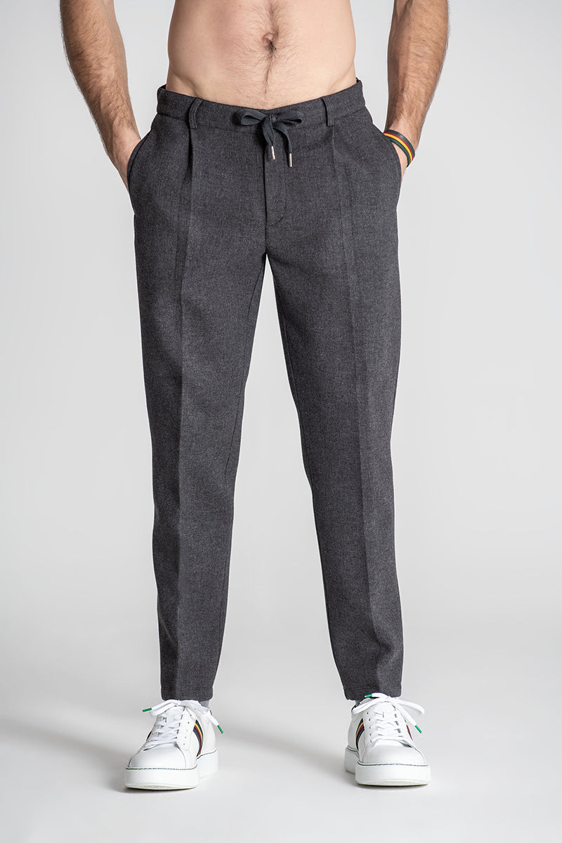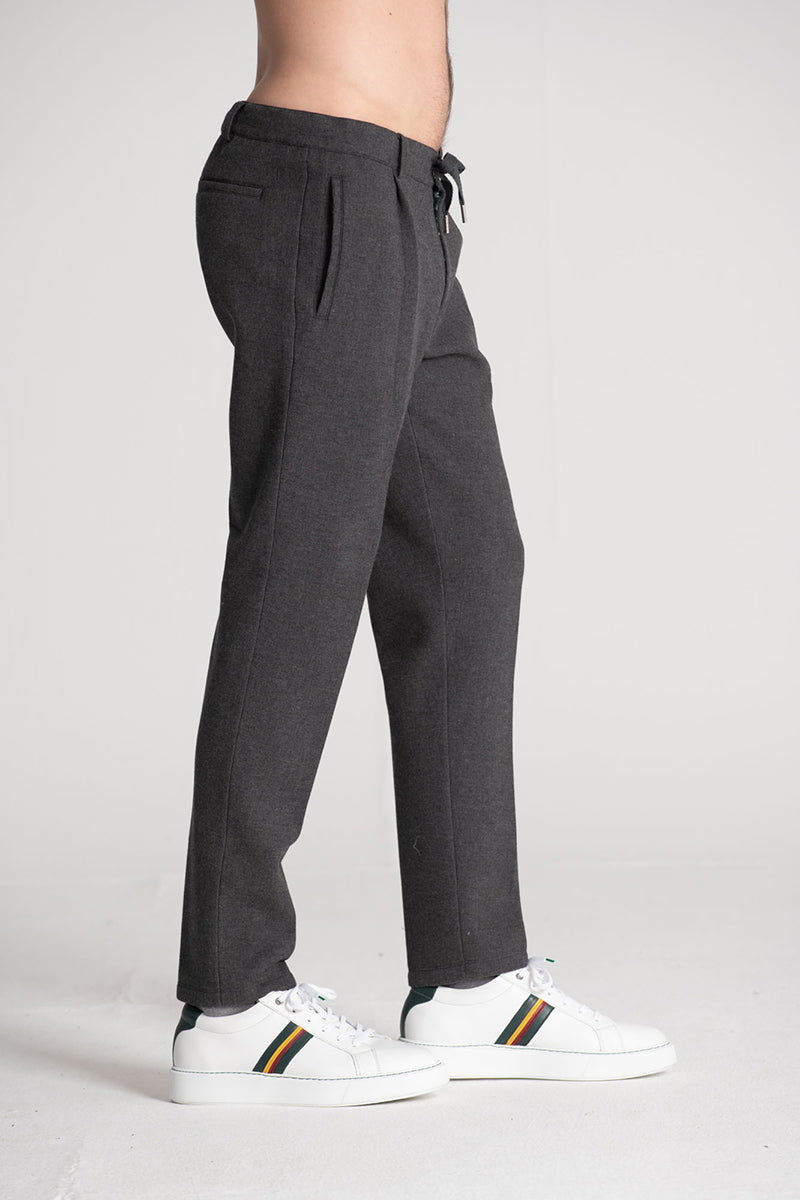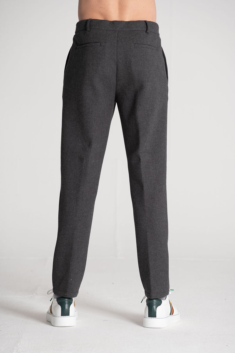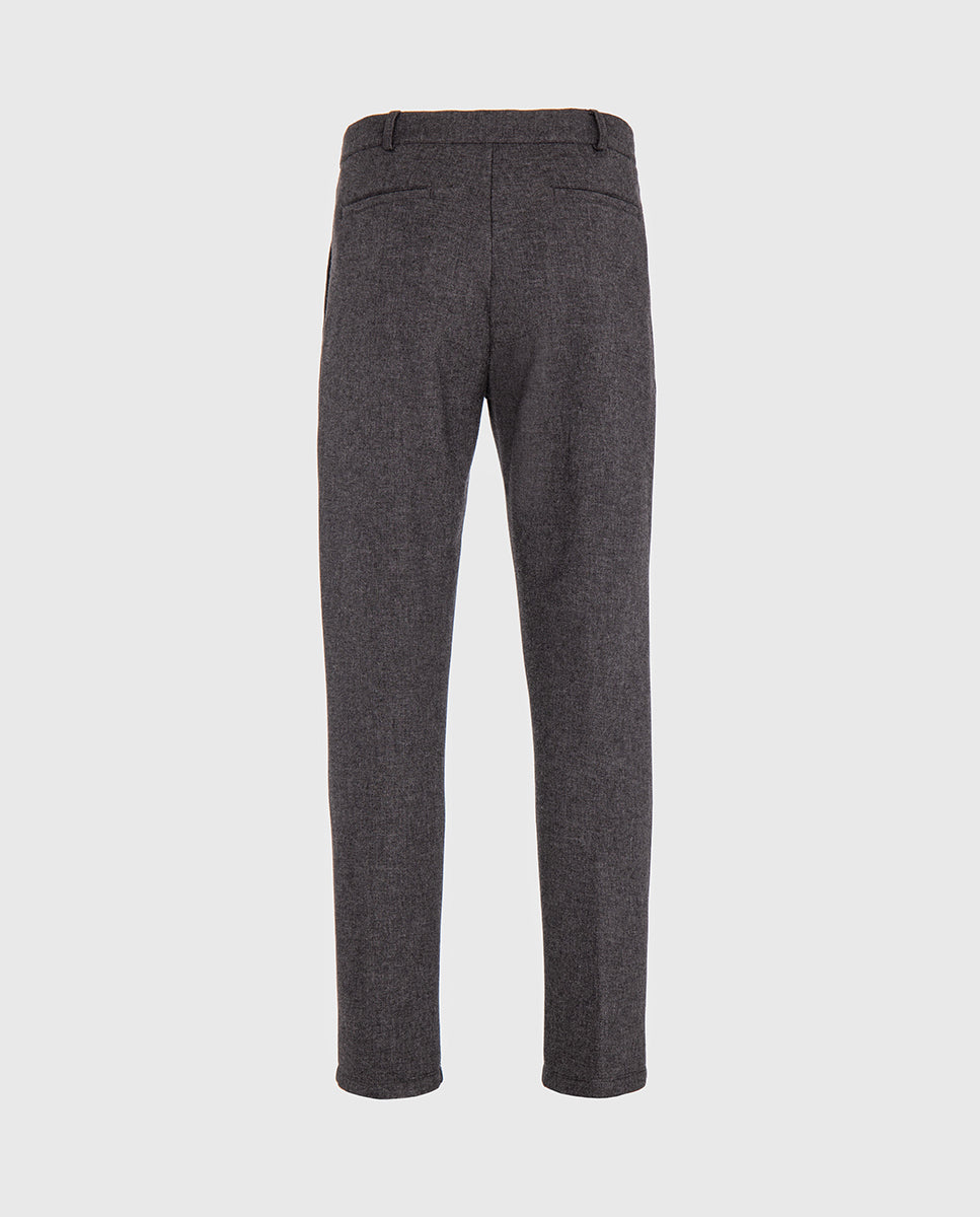 Calças tipo chino em malha com pinças. Pinças na frente confere estilo mais clássico. Bolsos de vivo nas laterais da frente e nas costas. Cinto com cordões retangulares e ponteira metálica personalizada. Logótipo bordado à cor da peça nas costas. Interior forrado em tecido estampado do all-over alusivo ao conceito da coleção 100% algodão orgânico.