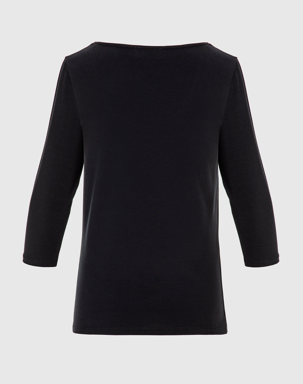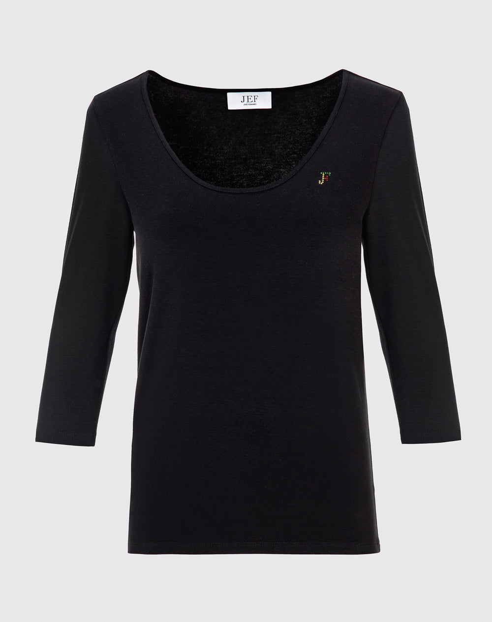 Camisola manga ¾ em lyocell. Decote redondo. Logótipo da marca em pedras brilhantes com as cores da marca.
