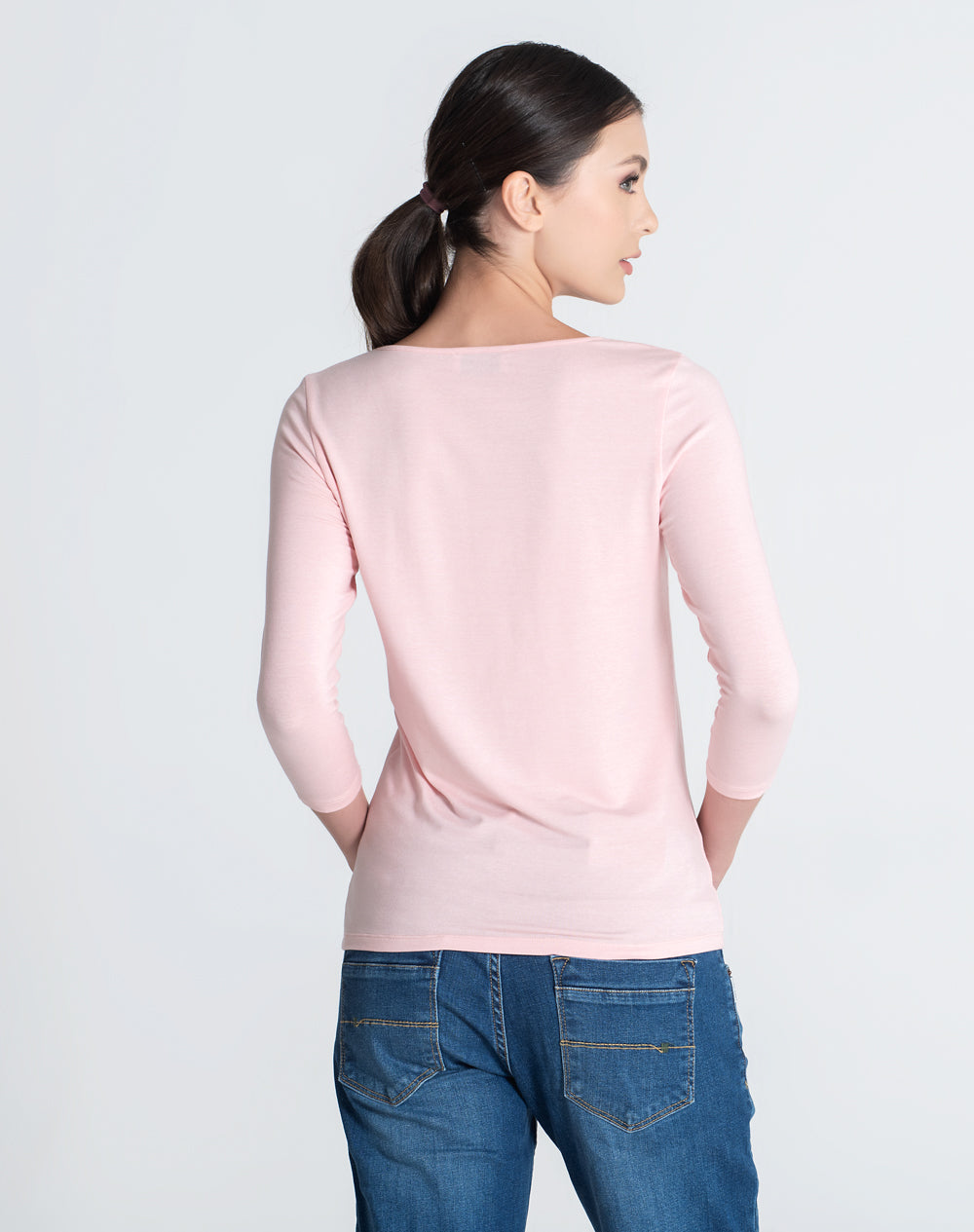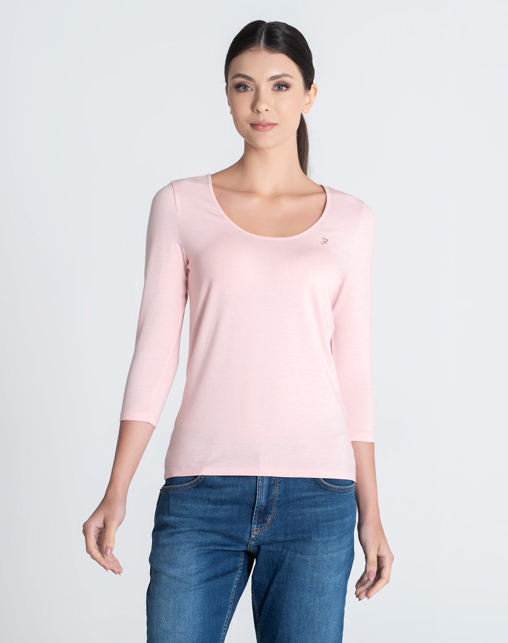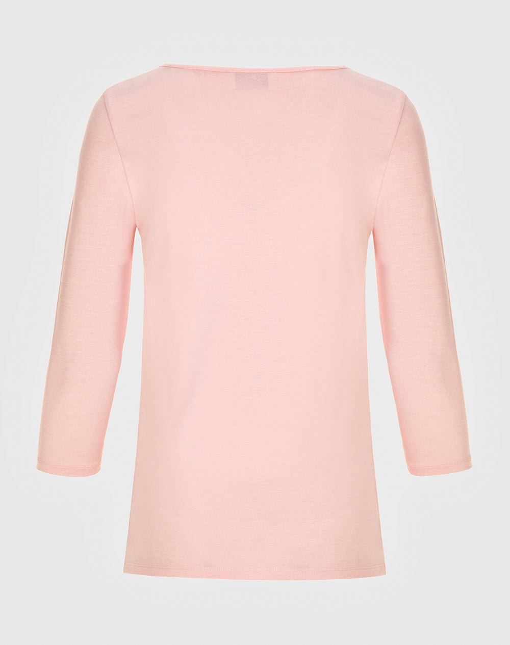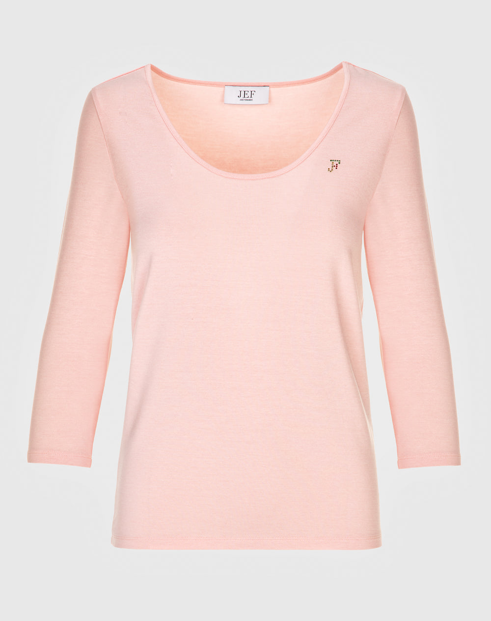 Camisola manga ¾ em lyocell. Decote redondo. Logótipo da marca em pedras brilhantes com as cores da marca.