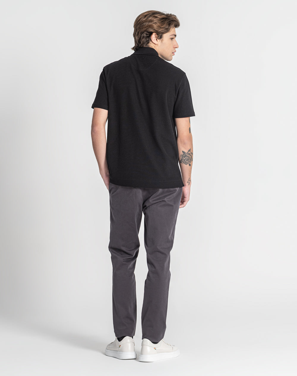 Polo manga curta estilo regular fit. Abertura no meio-frente através 3 botões. Gola em rib. Logótipo JEF bordado nas costas à cor da peça. Meia-lua em tecido estampado alusivo ao tema da coleção. Etiqueta JEF preta na vertical metida na costura lateral.