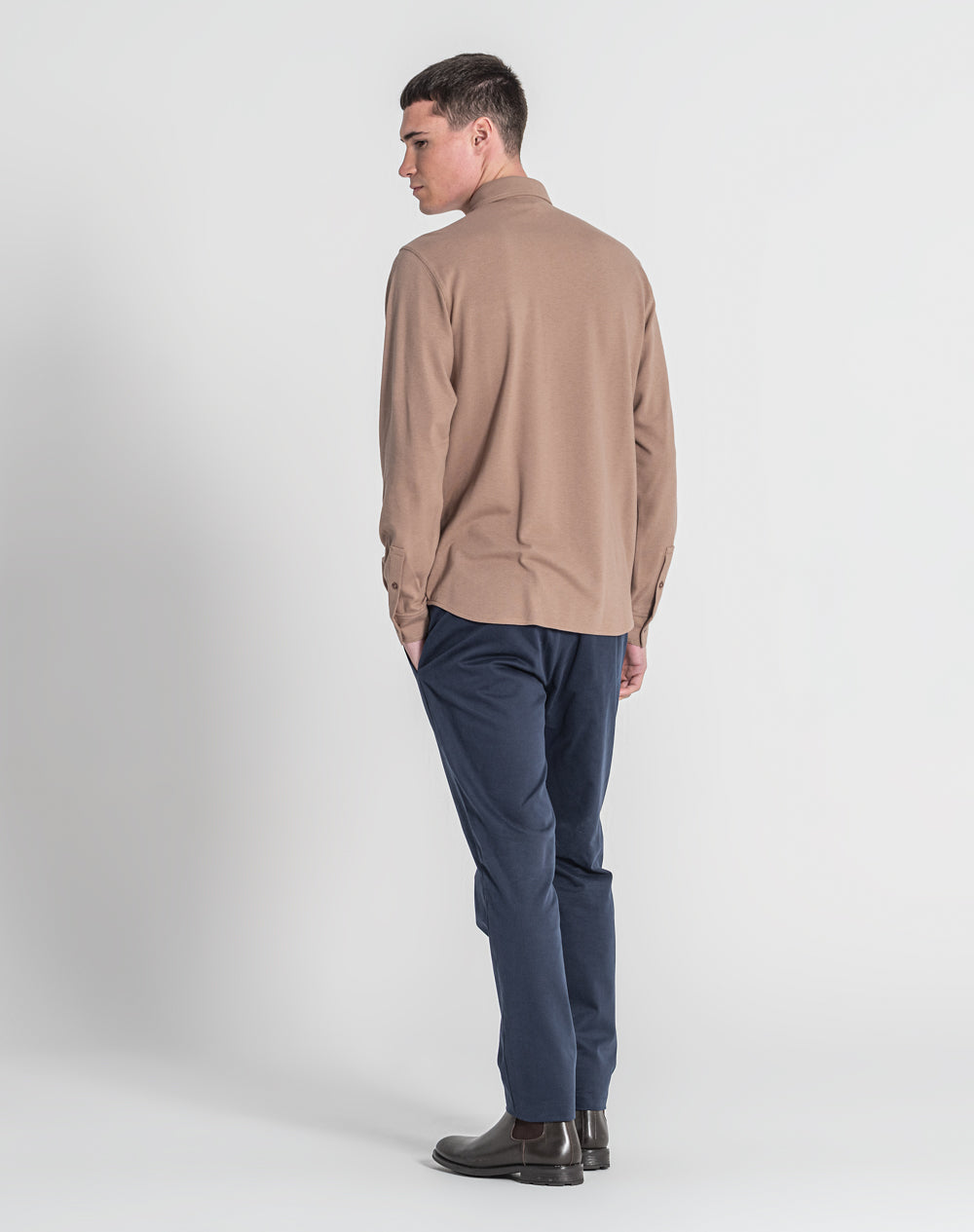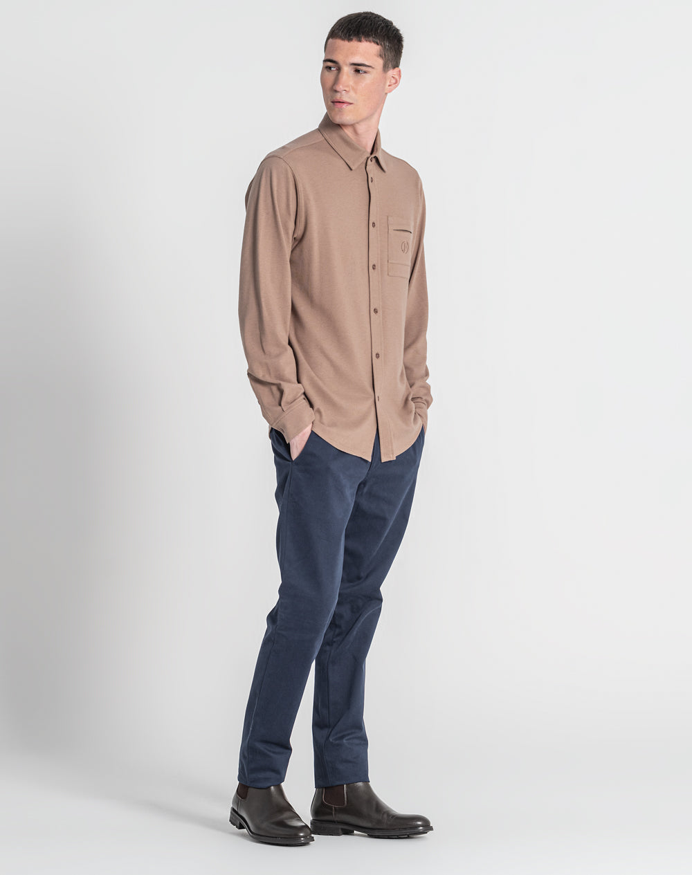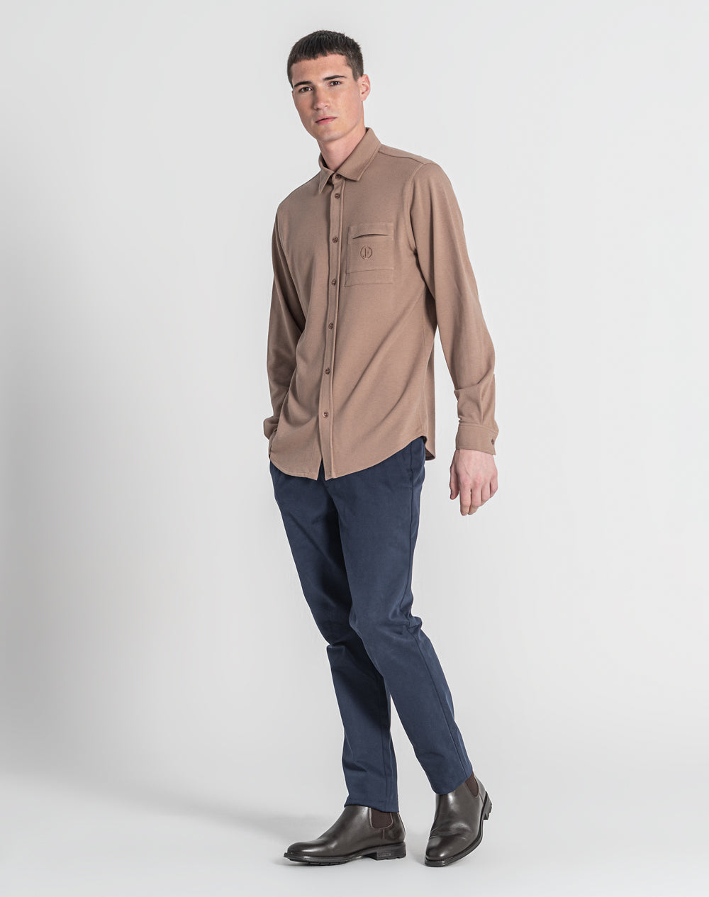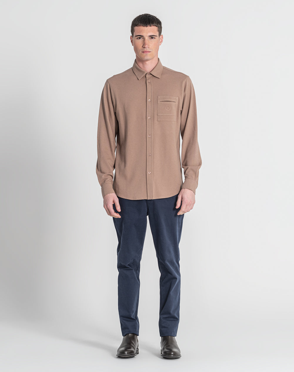 Camisa manga comprida estilo regular fit. Abertura da camisa é feita através de 7 botões. Malhete simples com nervuras. Bolso de chapa com logótipo da marca bordado à cor da peça.