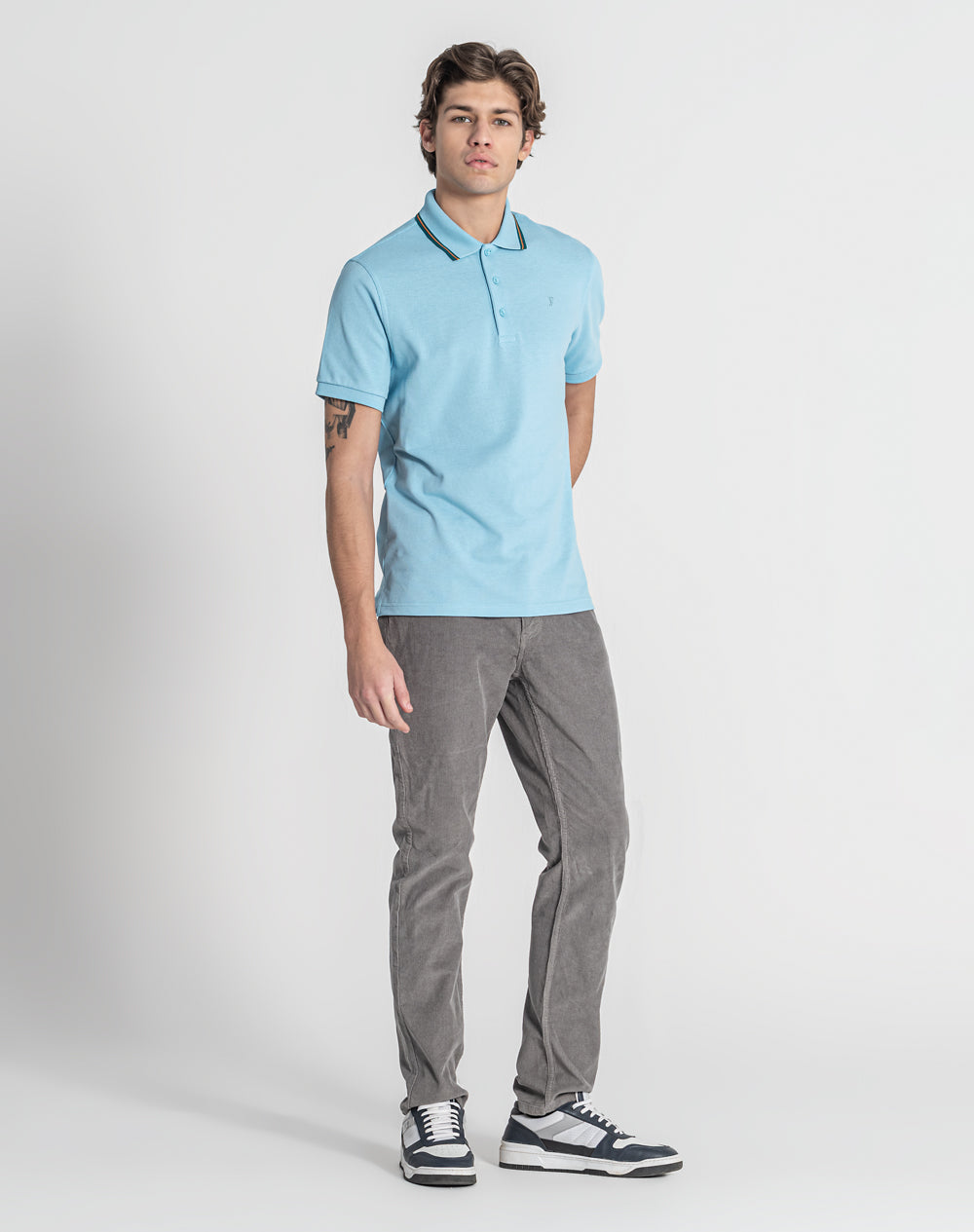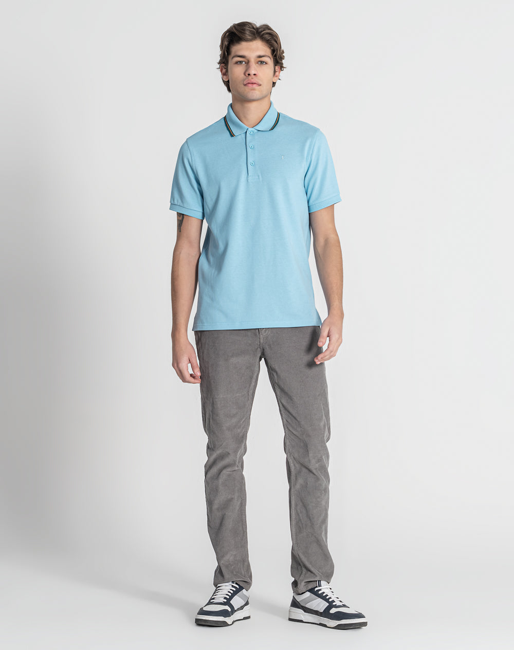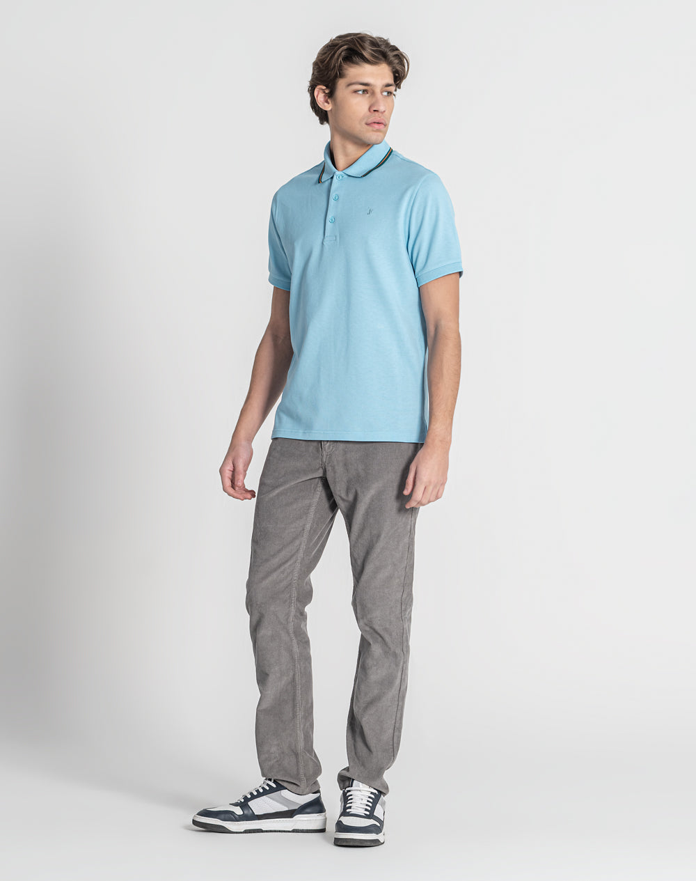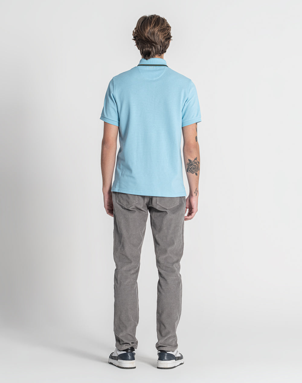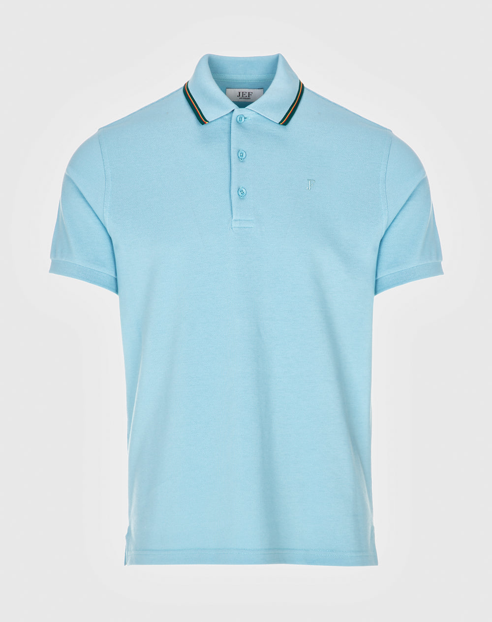 Polo manga curta em algodão orgânico. Abotoado por 3 botões no meio frente. Gola em tira-reta com as cores da marca. Meia-lua na própria malha. Logótipo ícon bordado à cor da peça. Logótipo JEF bordado à cor da peça nas costas. Pequenas rachas nas laterais.
