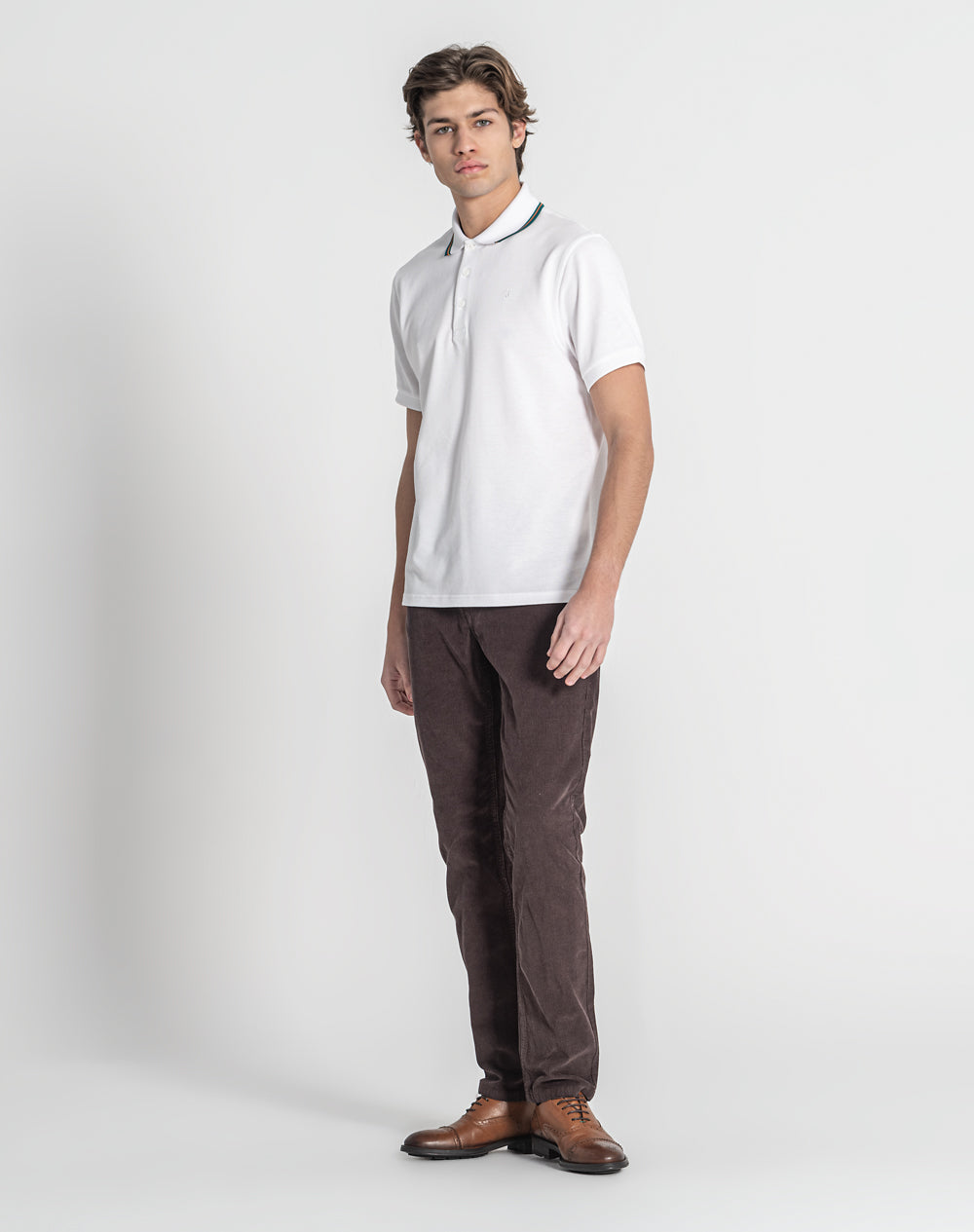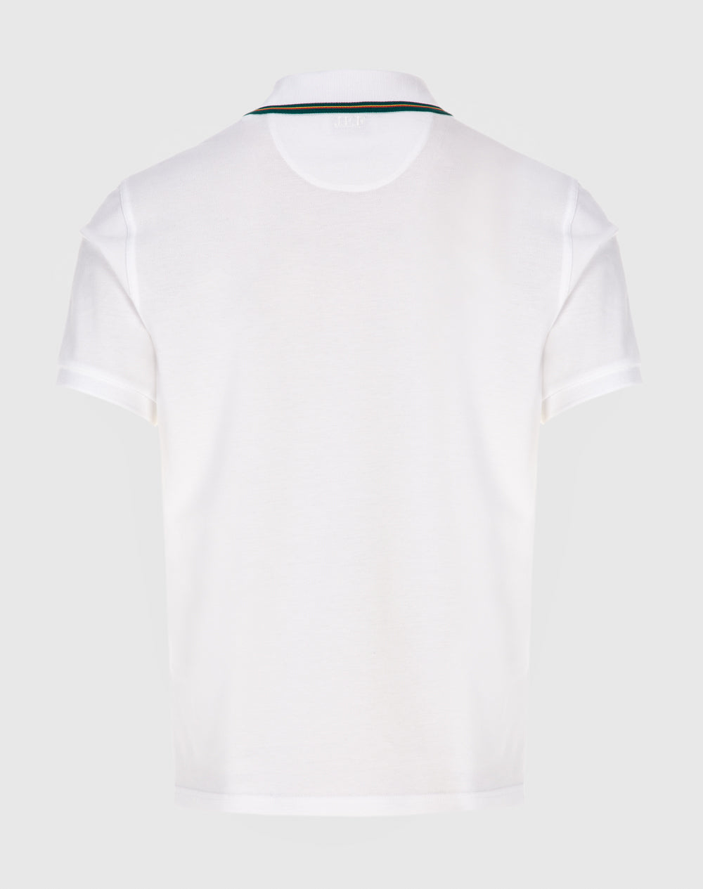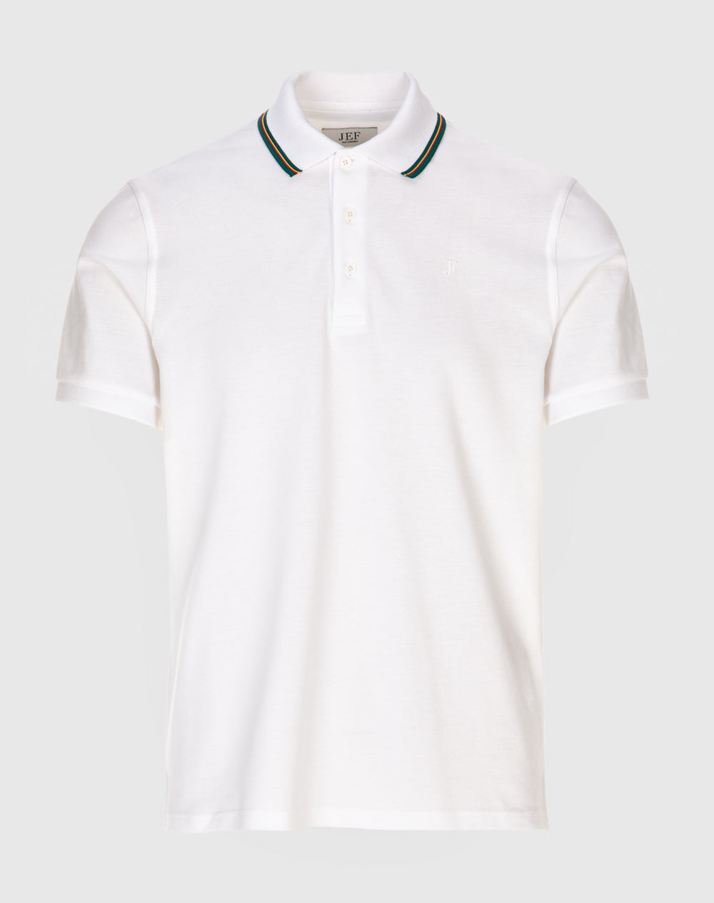 Polo manga curta em algodão orgânico. Abotoado por 3 botões no meio frente. Gola em tira-reta com as cores da marca. Meia-lua na própria malha. Logótipo ícon bordado à cor da peça. Logótipo JEF bordado à cor da peça nas costas. Pequenas rachas nas laterais.