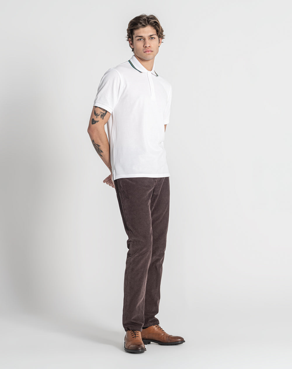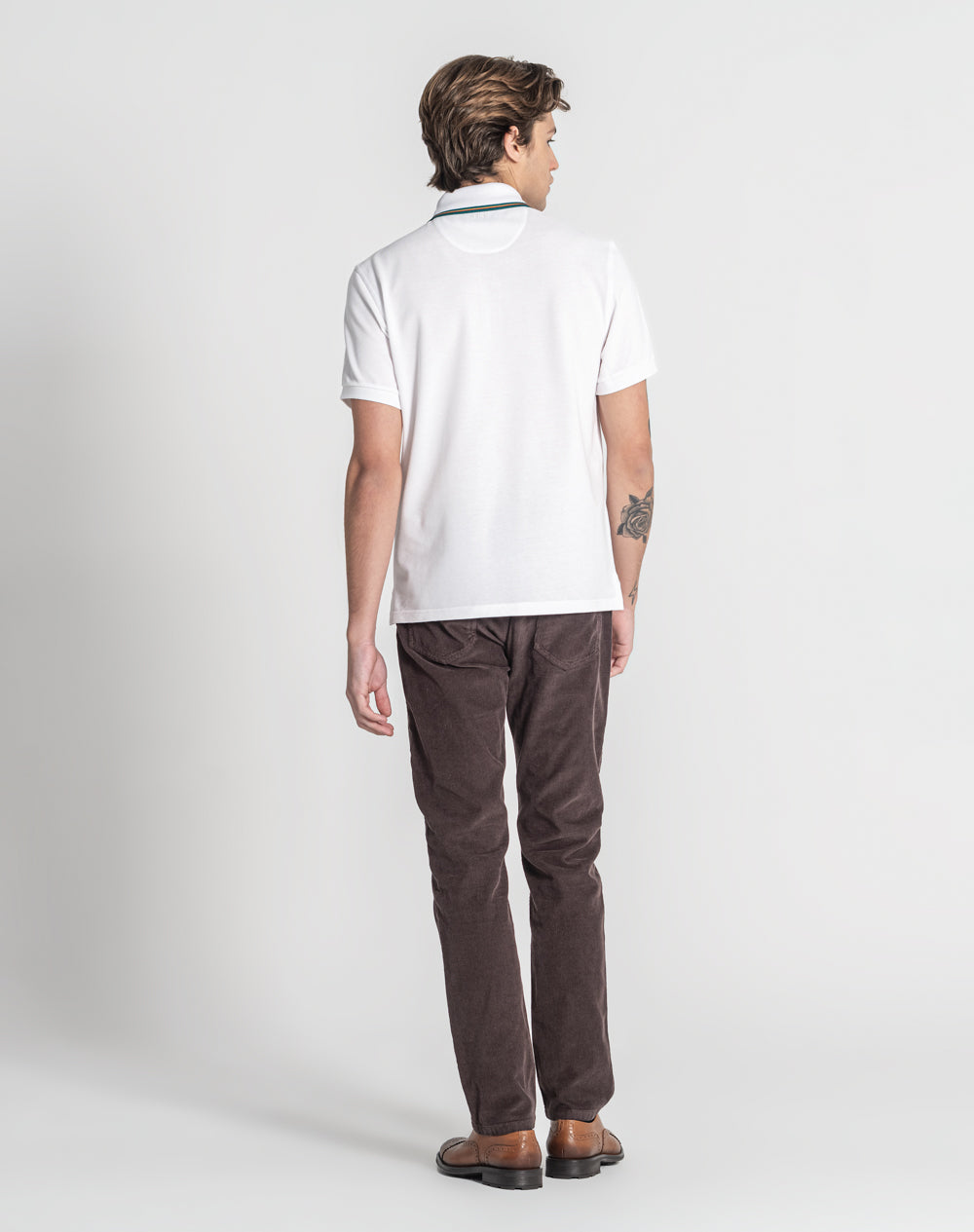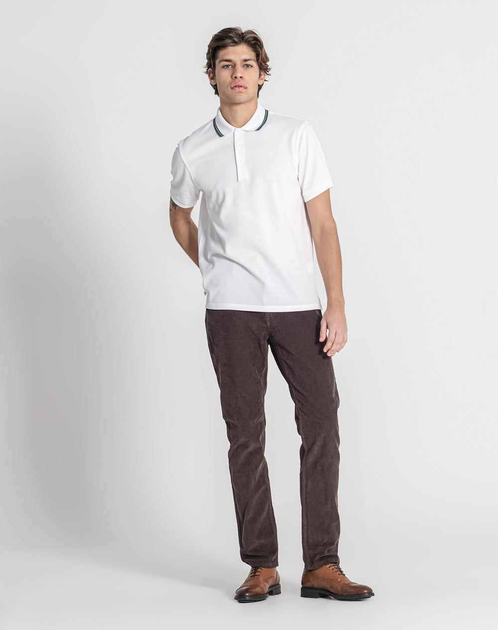 Polo manga curta em algodão orgânico. Abotoado por 3 botões no meio frente. Gola em tira-reta com as cores da marca. Meia-lua na própria malha. Logótipo ícon bordado à cor da peça. Logótipo JEF bordado à cor da peça nas costas. Pequenas rachas nas laterais.