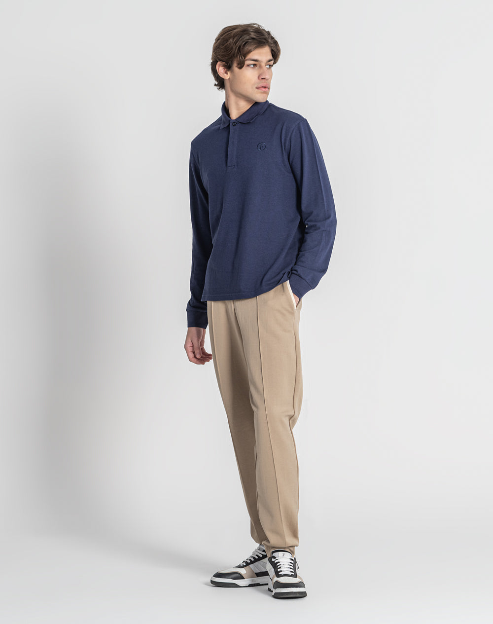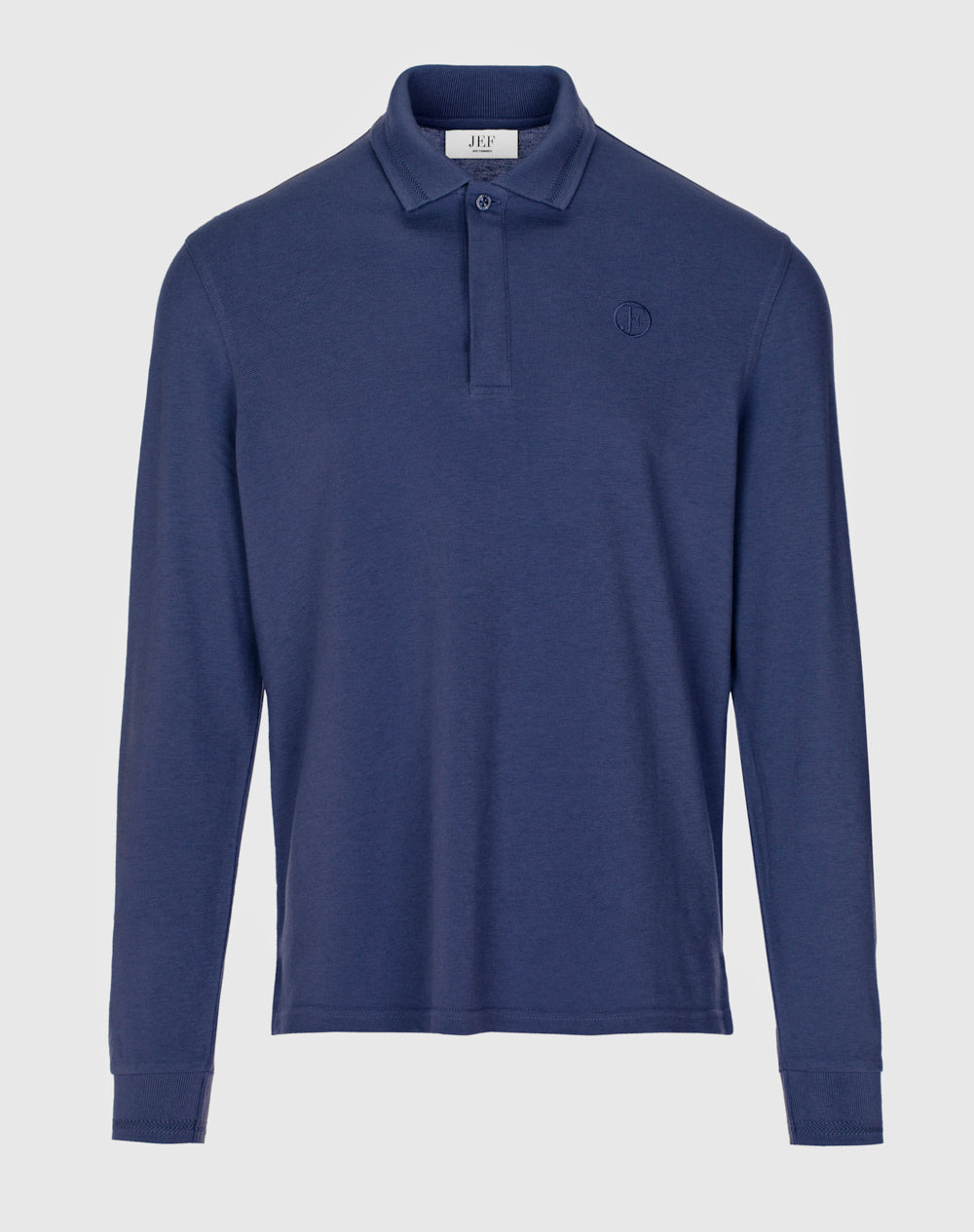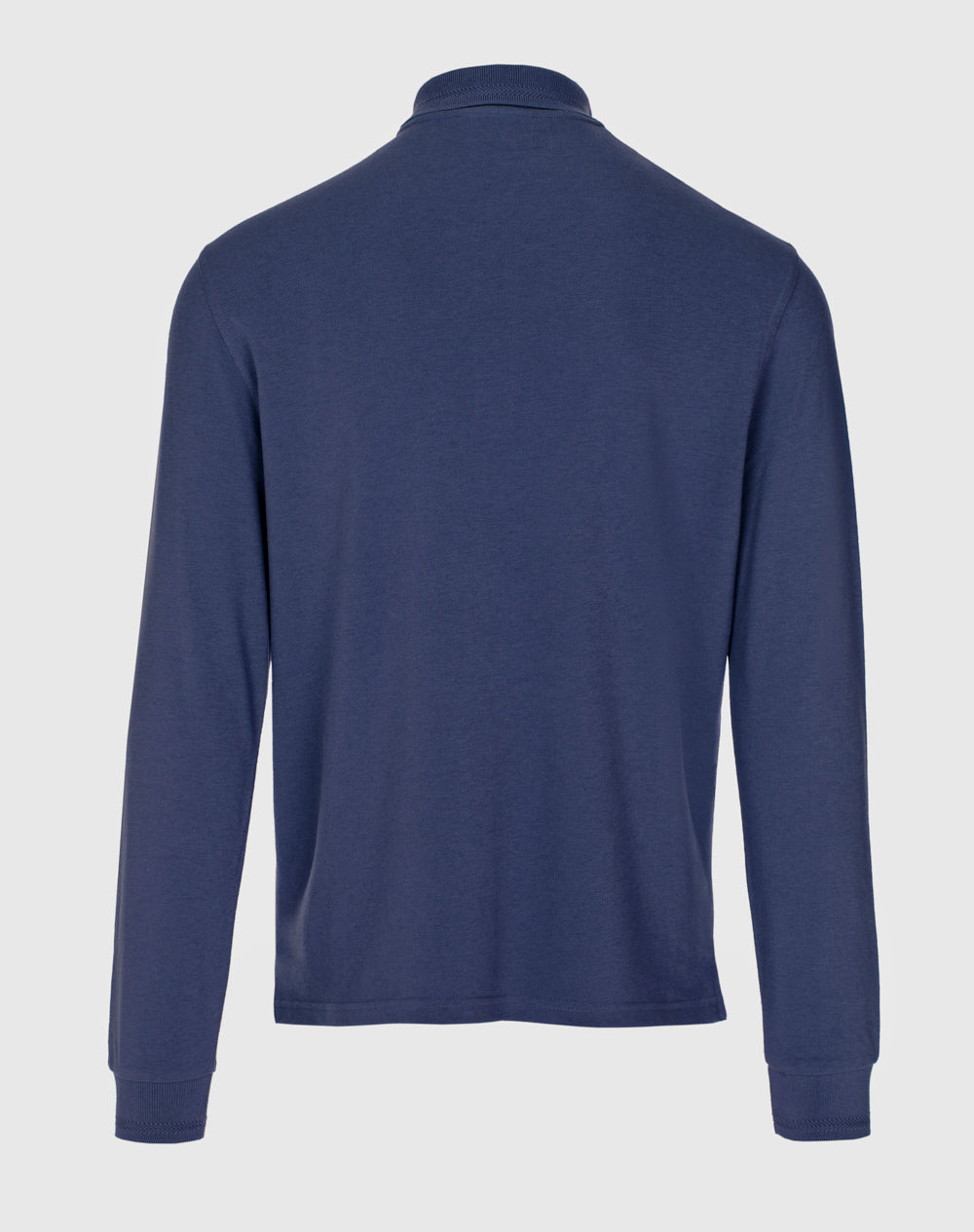 Polo manga comprida com gola e punhos em tira-reta espinhada. Abotoado por 3 botões no meio frente escondidos, apenas 1 visível. Tapa-costuras no interior da peça na própria malha. Logótipo da marca bordado à cor da peça. Pequenas rachas nas laterais.
