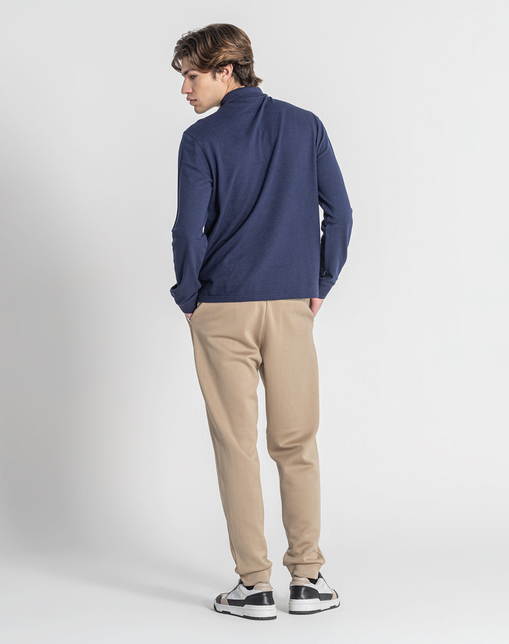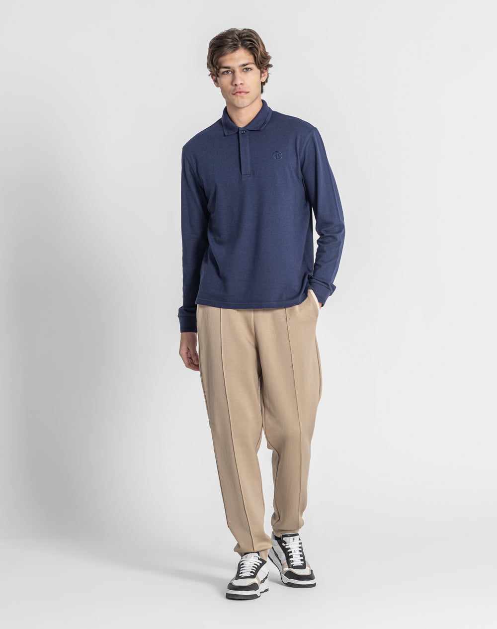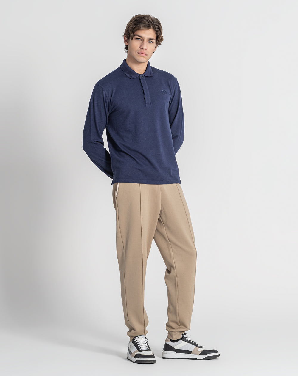 Polo manga comprida com gola e punhos em tira-reta espinhada. Abotoado por 3 botões no meio frente escondidos, apenas 1 visível. Tapa-costuras no interior da peça na própria malha. Logótipo da marca bordado à cor da peça. Pequenas rachas nas laterais.