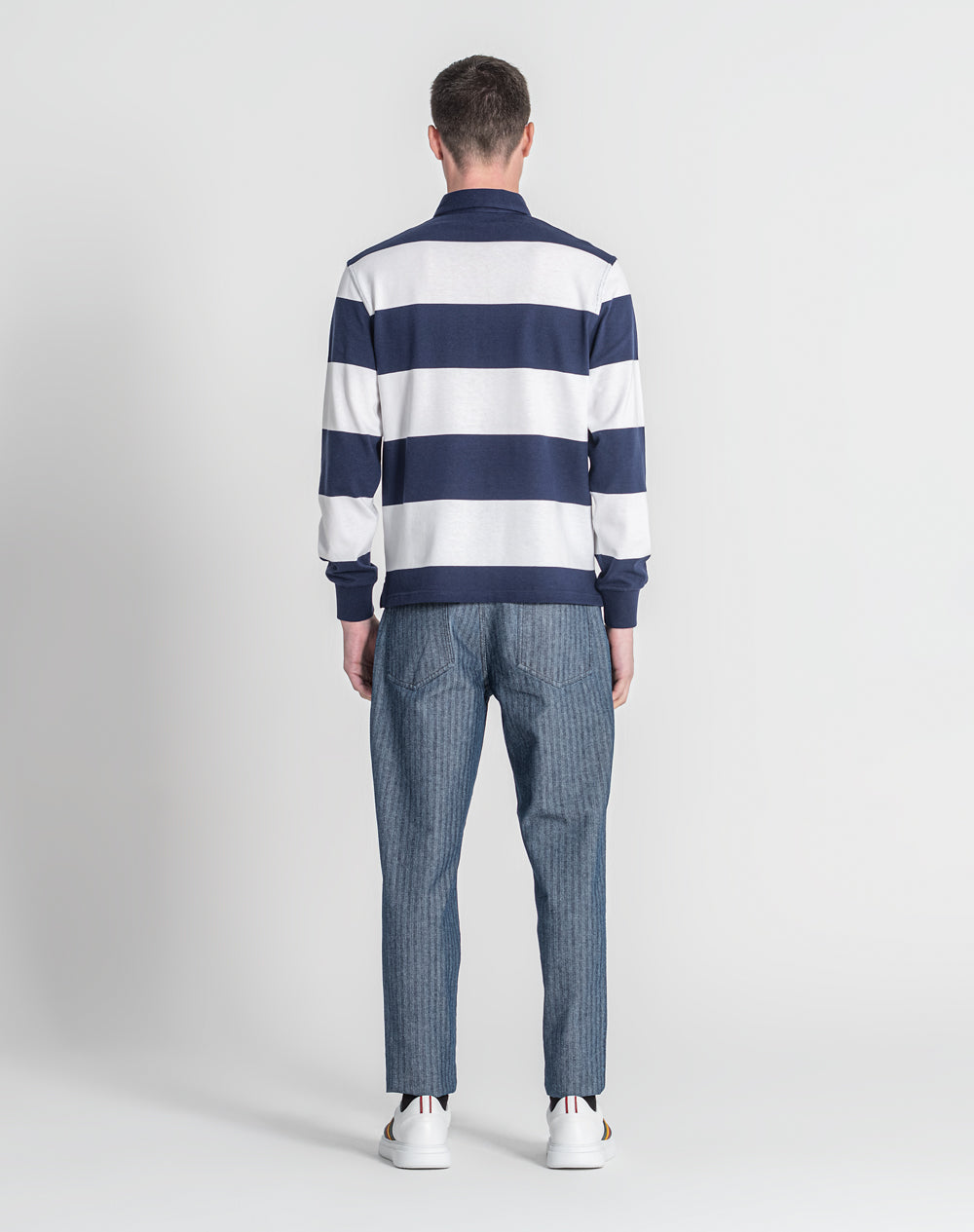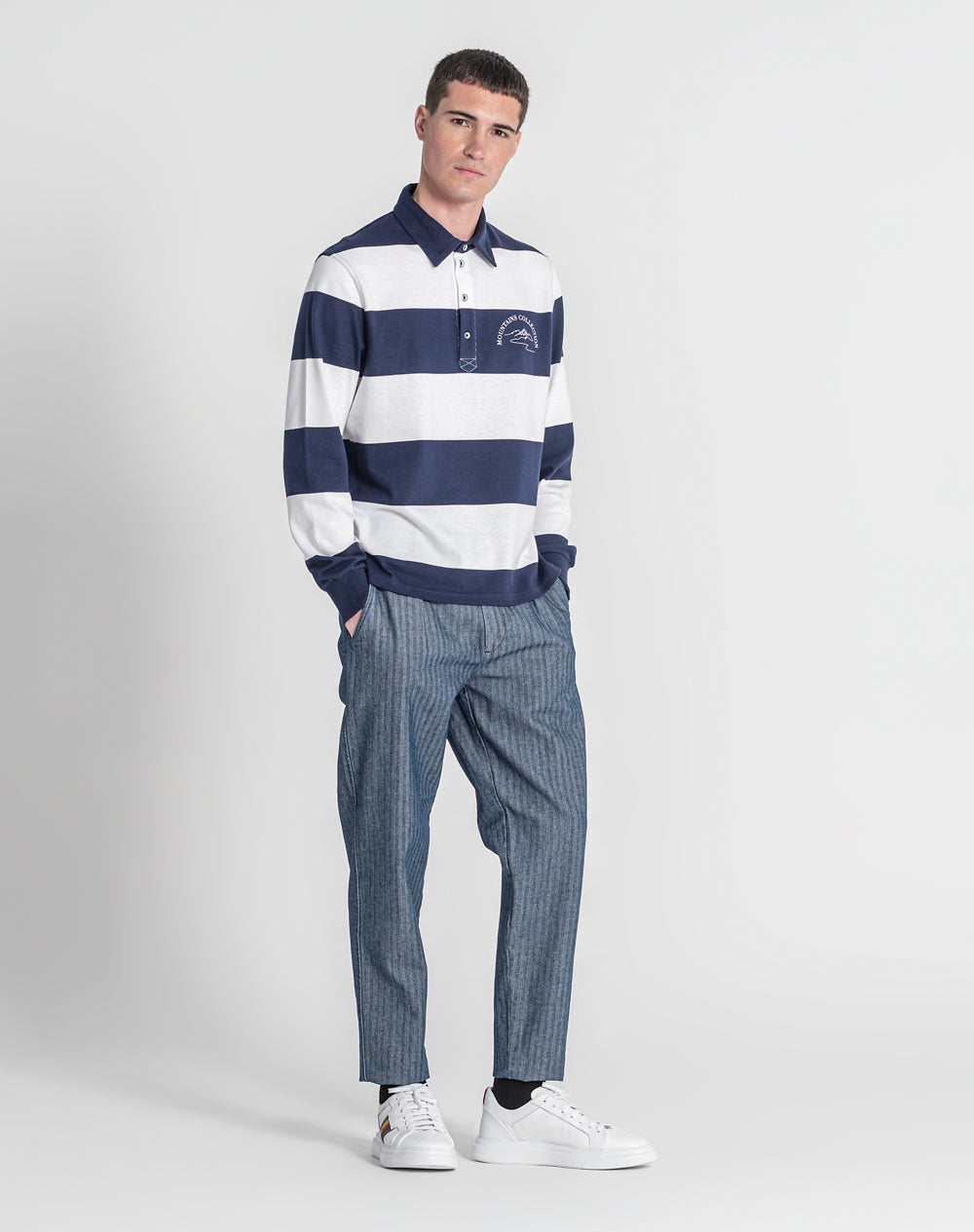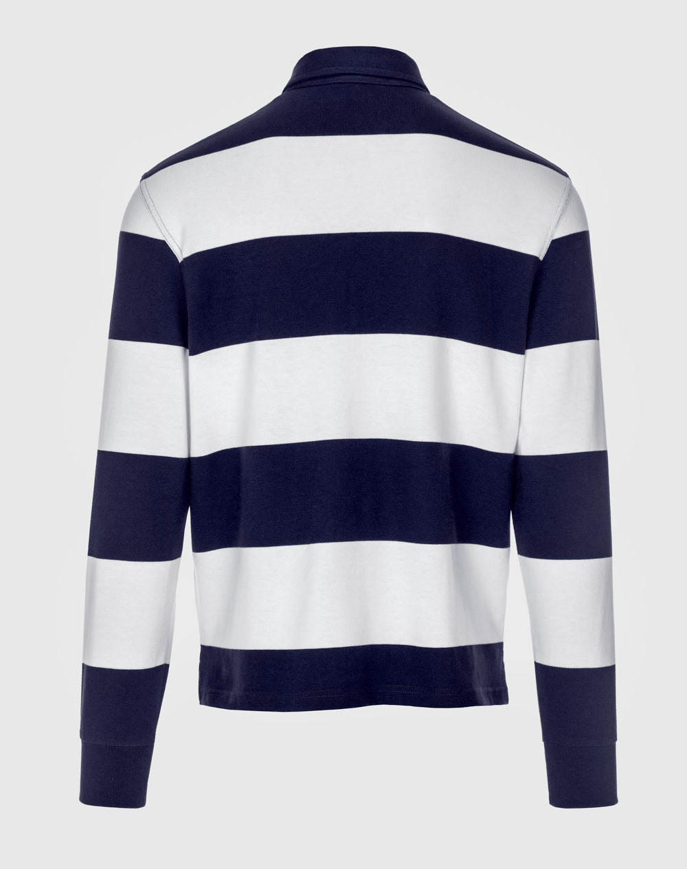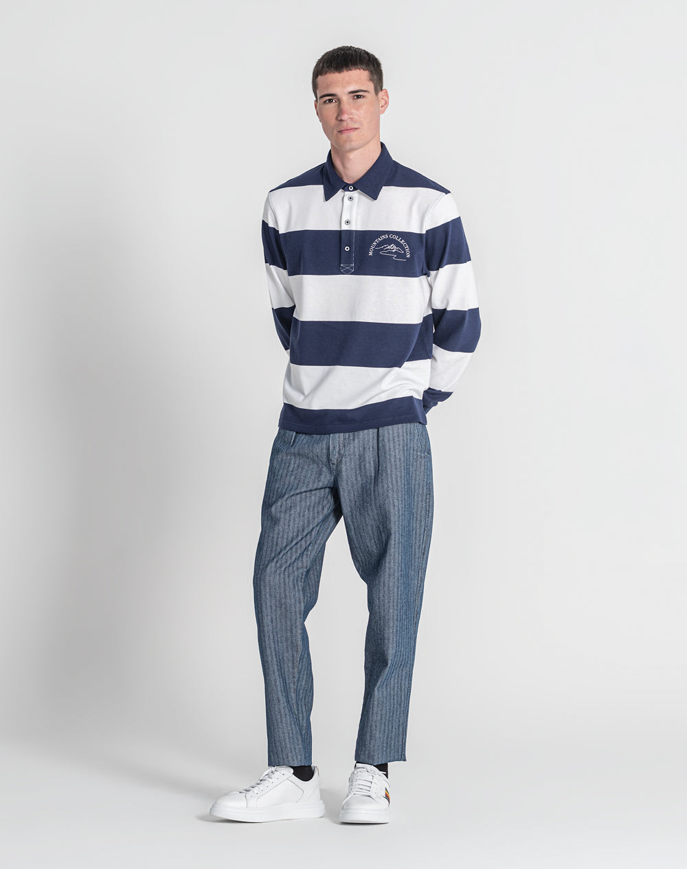 Polo de manga comprida de riscas estilo rubgy. Abertura no meio-frente através 3 botões. Pequenas rachas nas laterais. Desenho MOUNTAINS COLLECTION estampado.