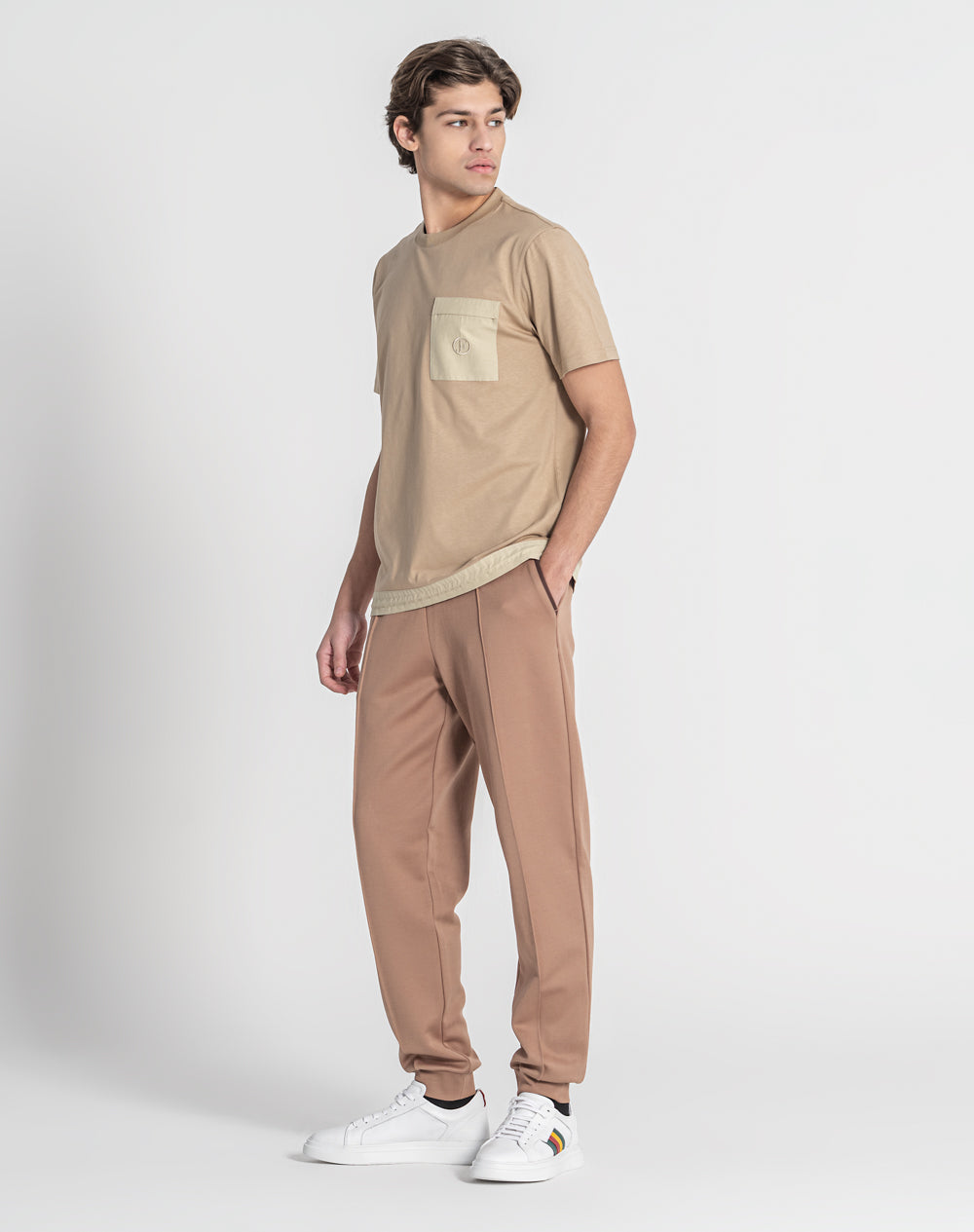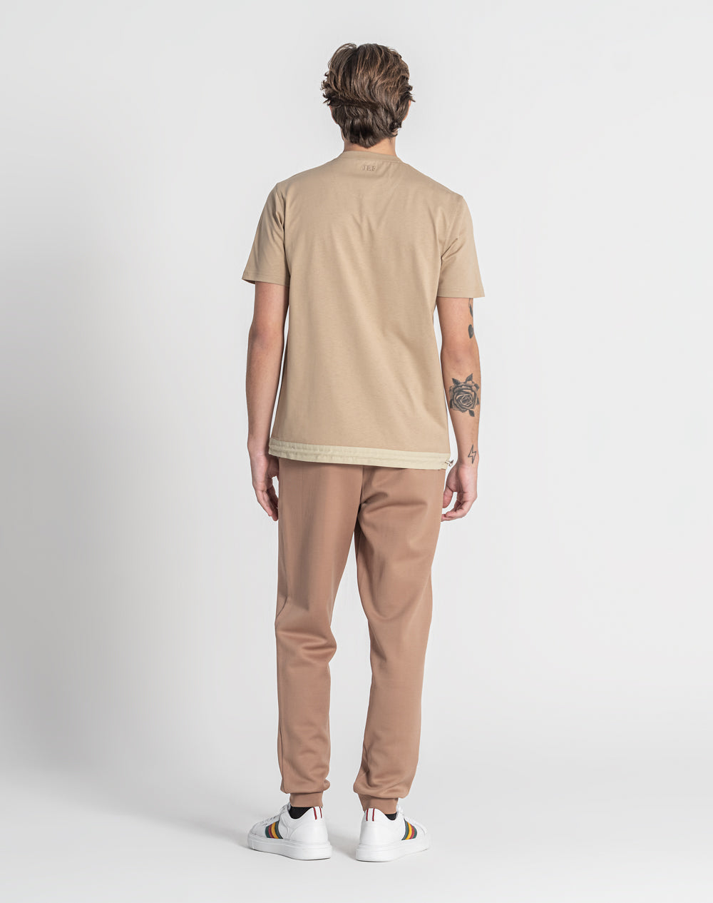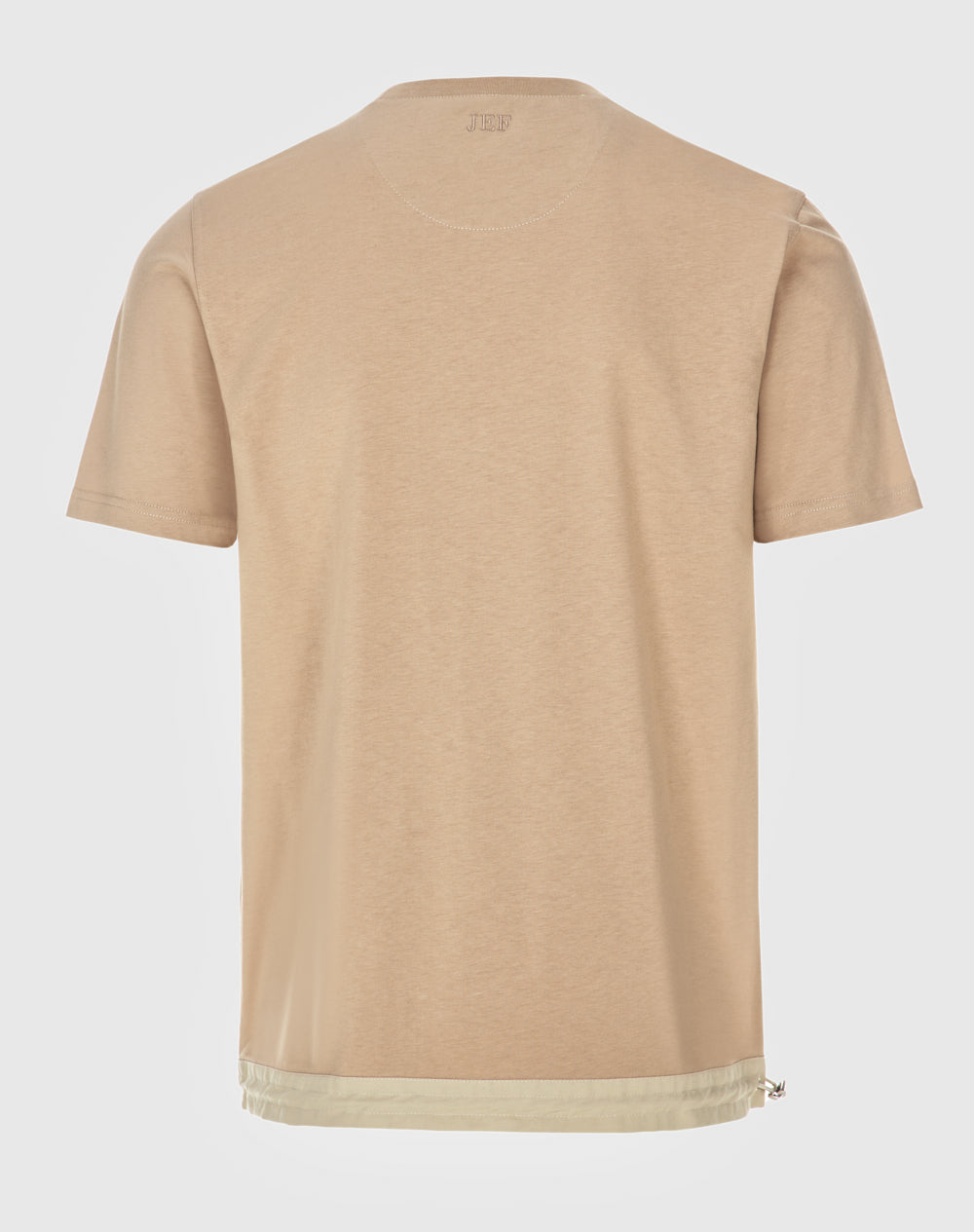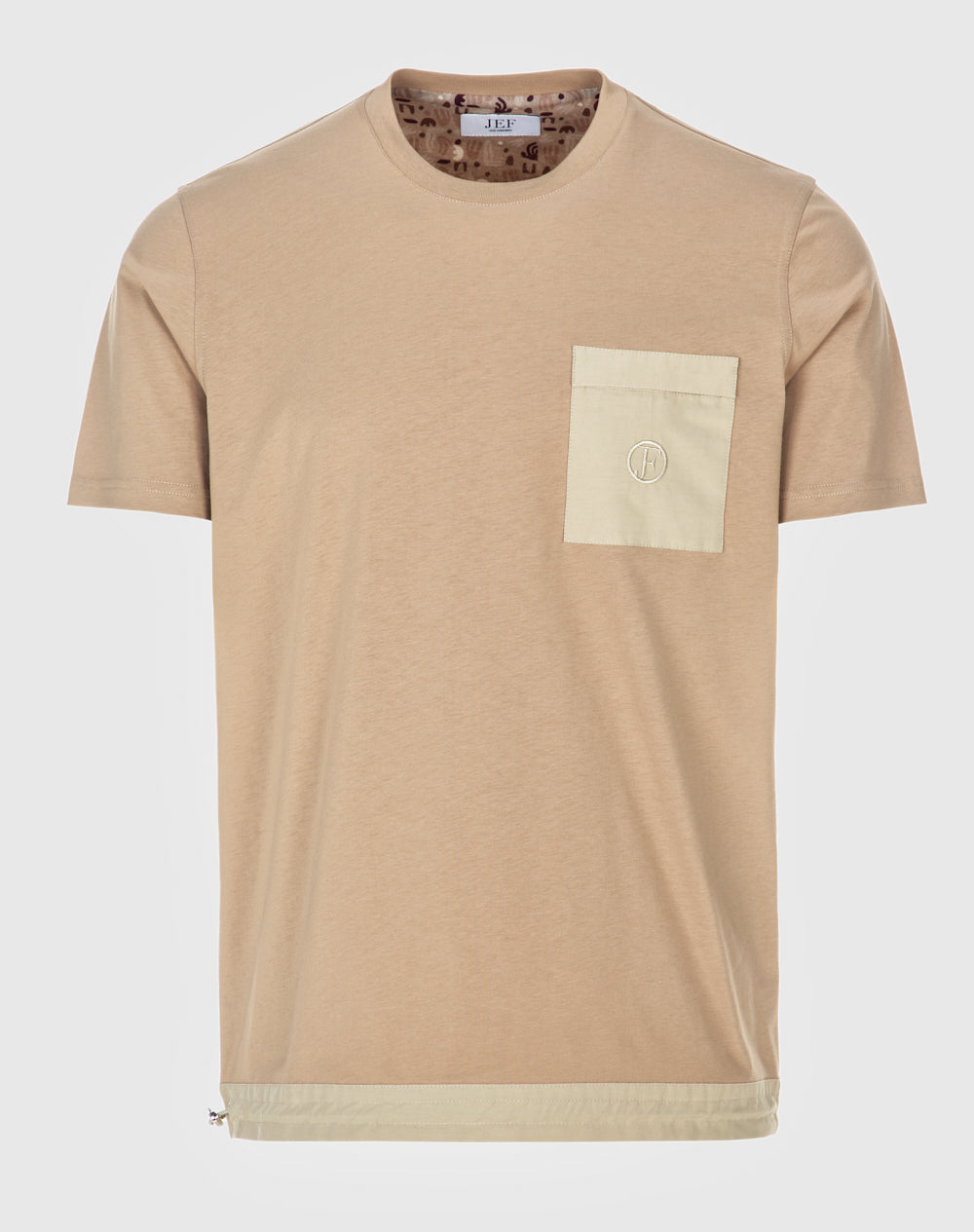 T-shirt com decote redondo. Meia-lua em tecido estampo alusivo ao tema da coleção. Bolso de chapa com pala com logótipo da marca bordado. Cinto com elástico interior e regulador. Logótipo JEF bordado nas costas à cor da peça.