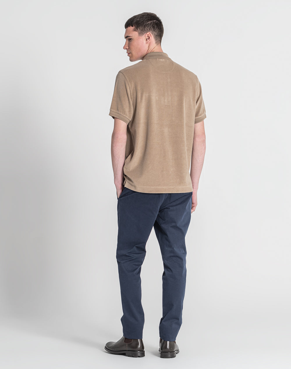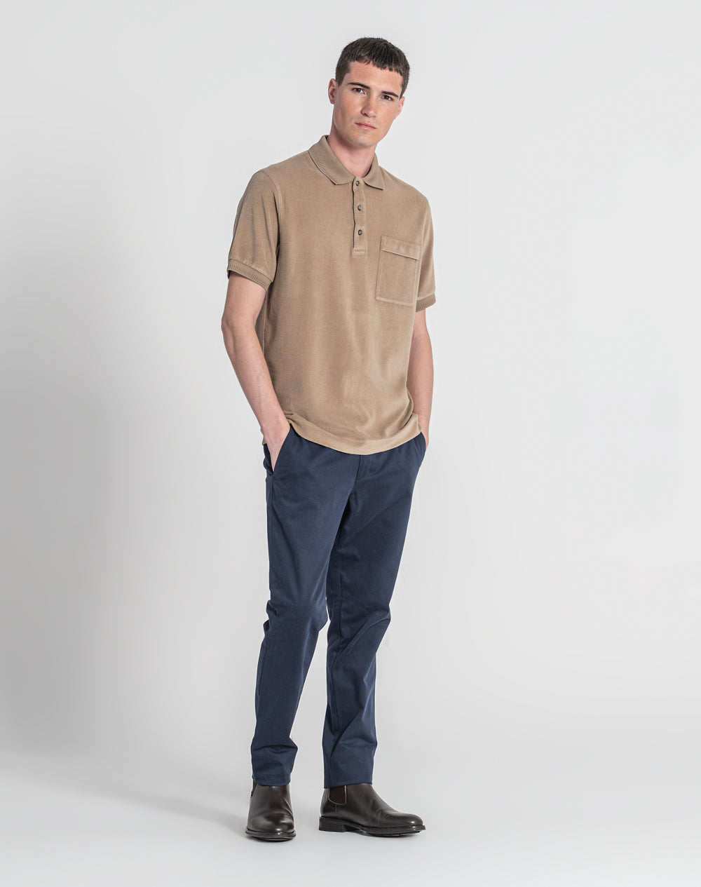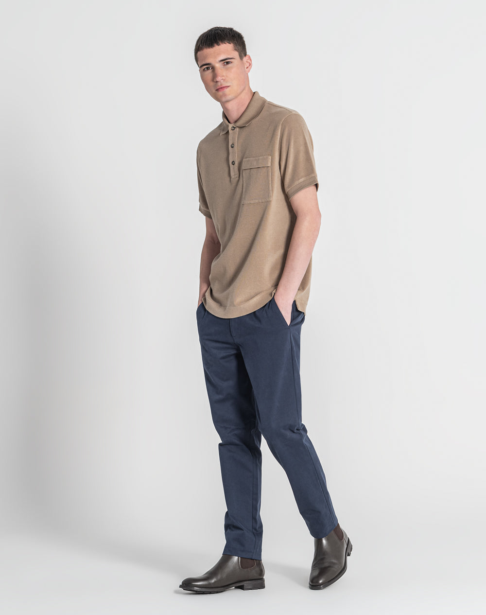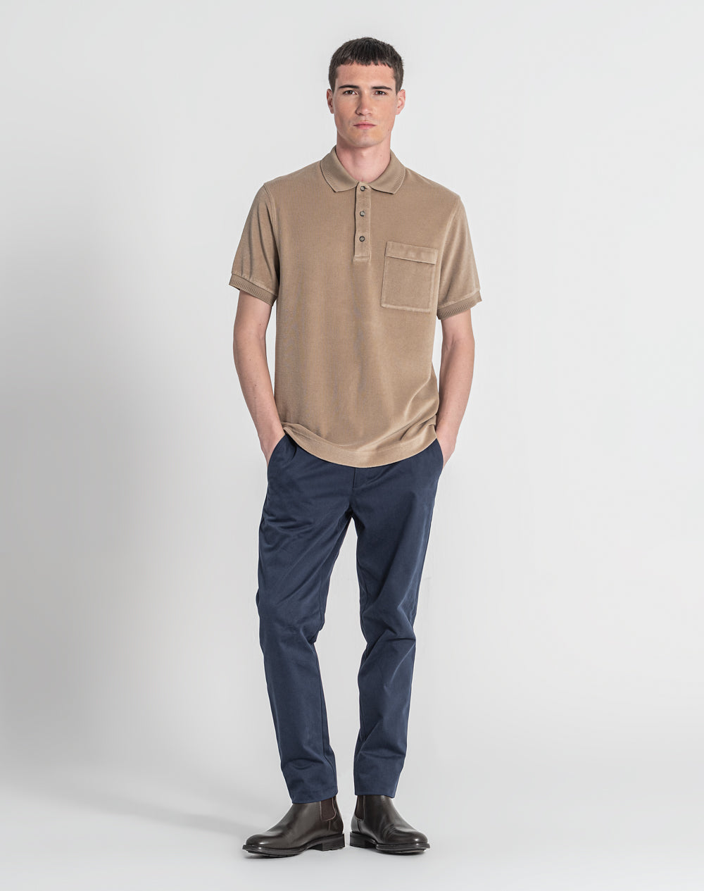 Polo manga curta em algodão PGM e algodão orgânico. Bolso de chapa com pala. Abertura no meio-frente através 3 botões. Gola e punhos em tira-reta. Logótipo JEF bordado nas costas à cor da peça. Meia-lua na própria malha. Pequenas rachas nas laterais.