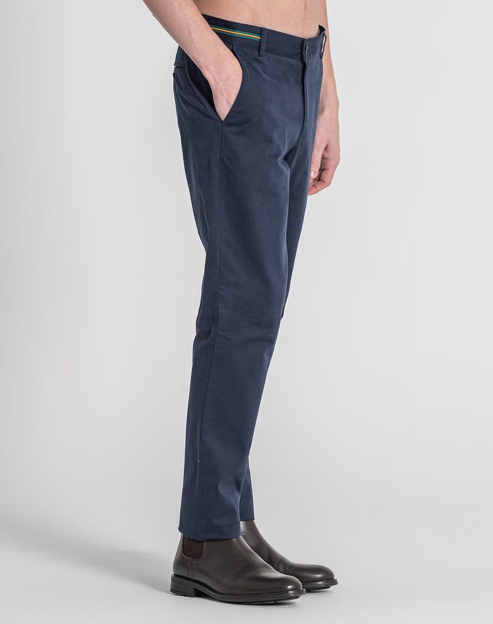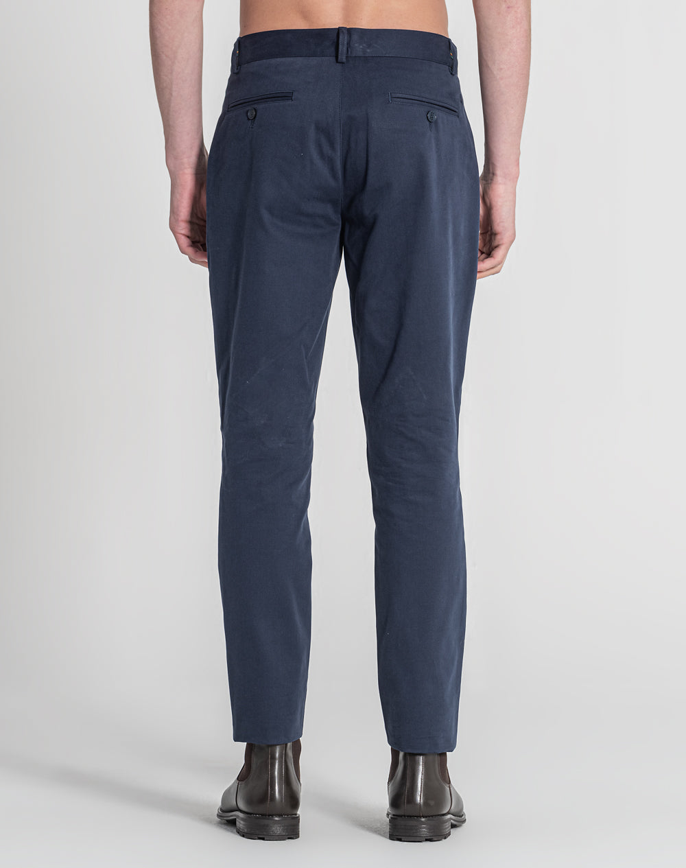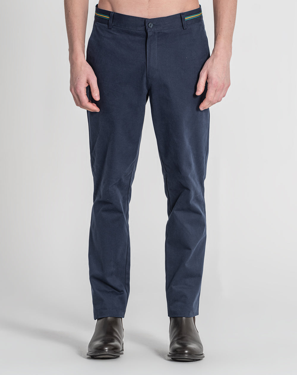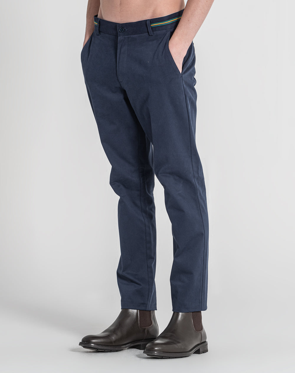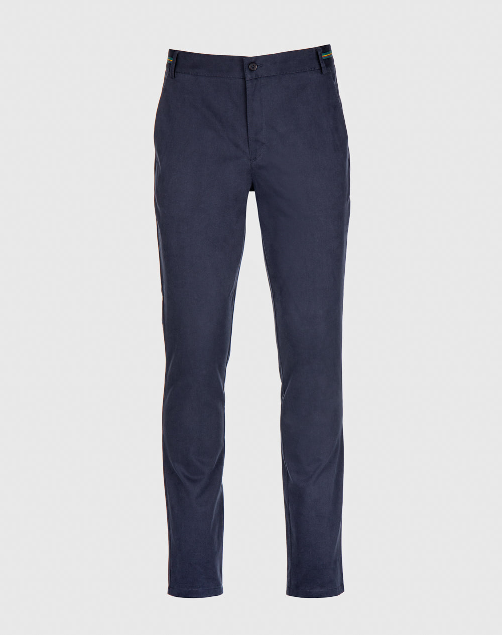 Calça clássica em sarja. Bolsos de faca nas laterais. Bolsos de vivo nas costas com botão. Cinto, interior dos bolsos e costuras limpas com tecido estampado (popelina orgânica com acabamento seda) alusivo ao conceito da coleção. Cinto com fita de nastro com as cores da marca.