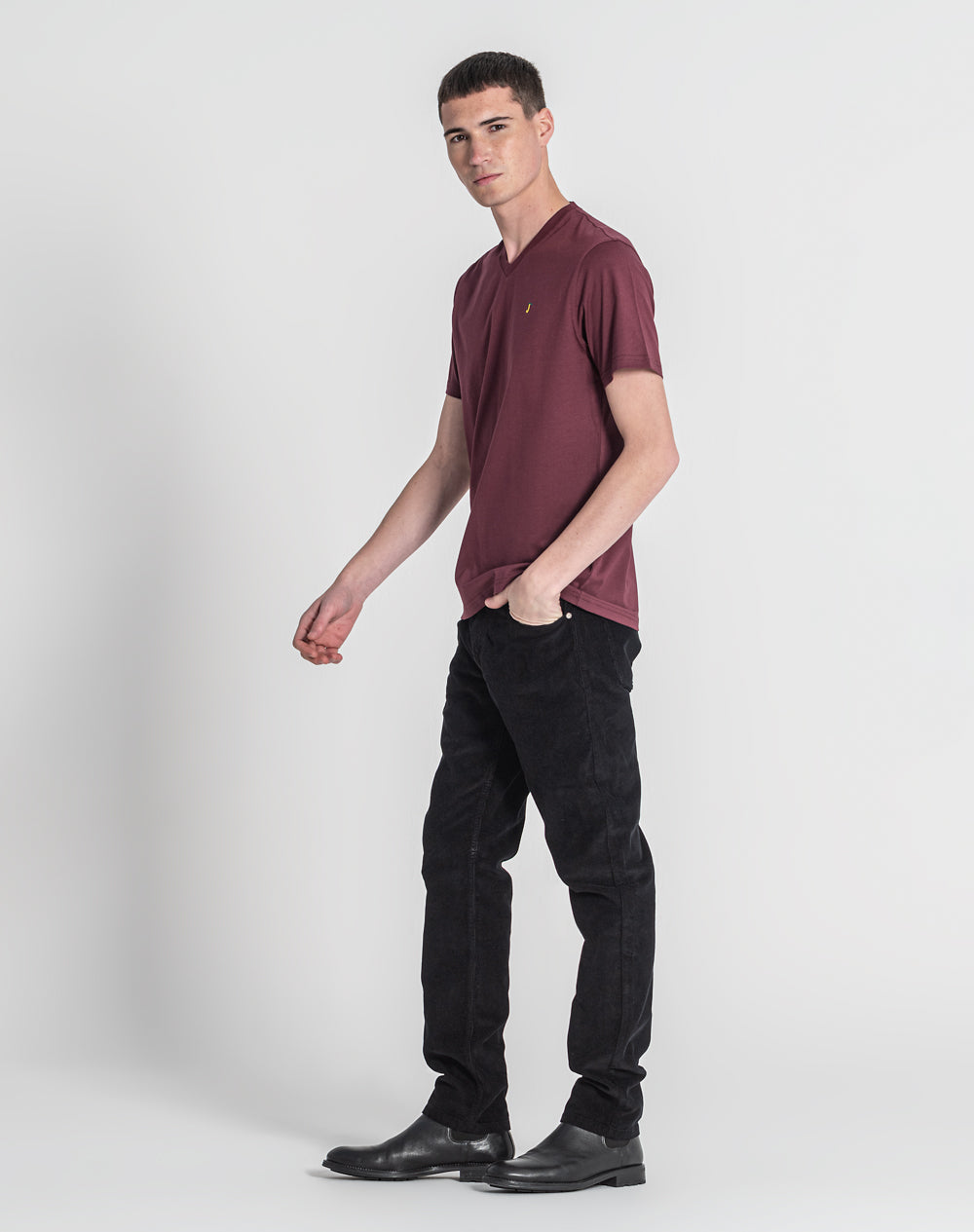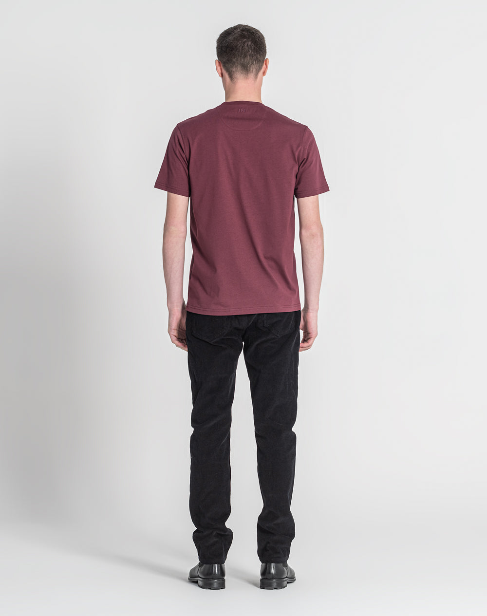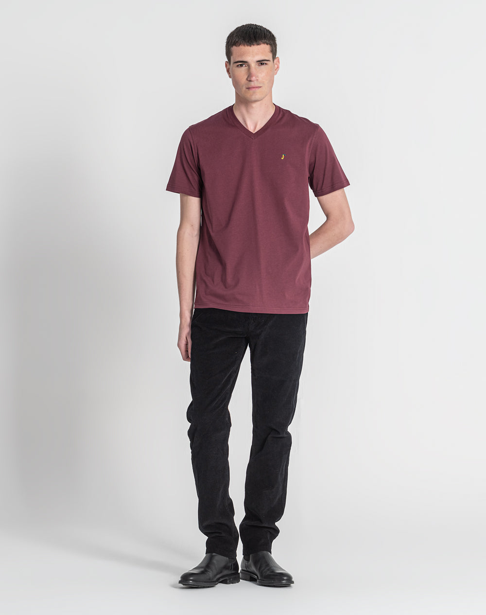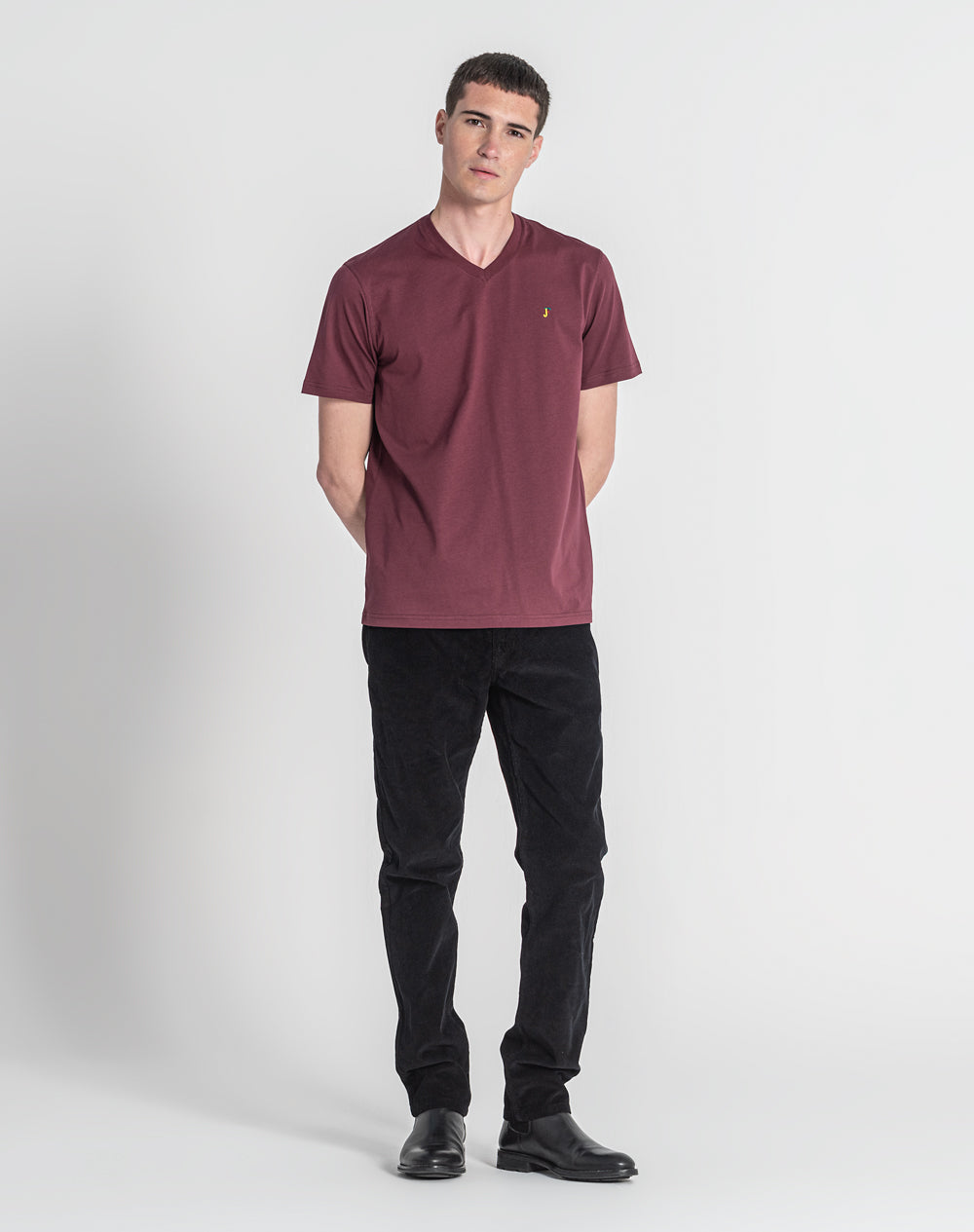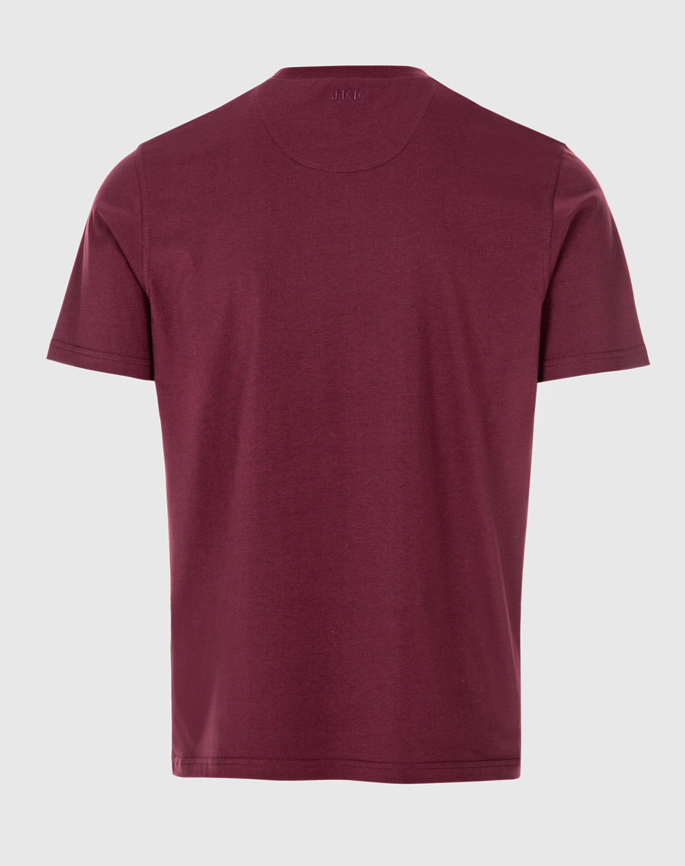 T-shirt em jersey orgânico com decote em V. Meia-lua na própria malha. Logótipo do ícon bordado com cores da marca. Logótipo JEF bordado nas costas à cor da peça.