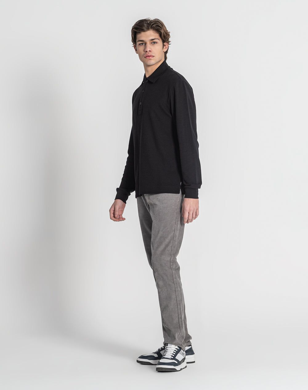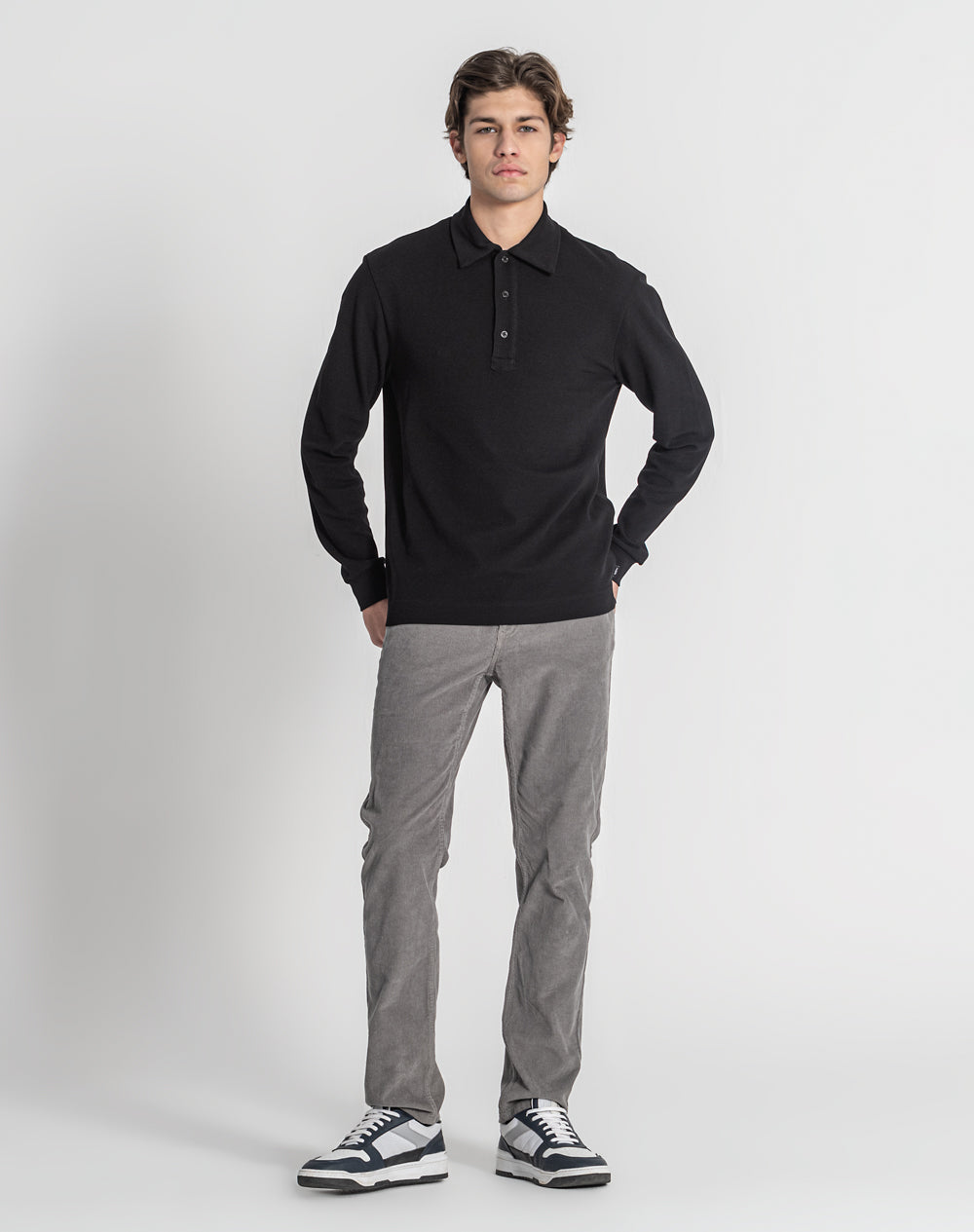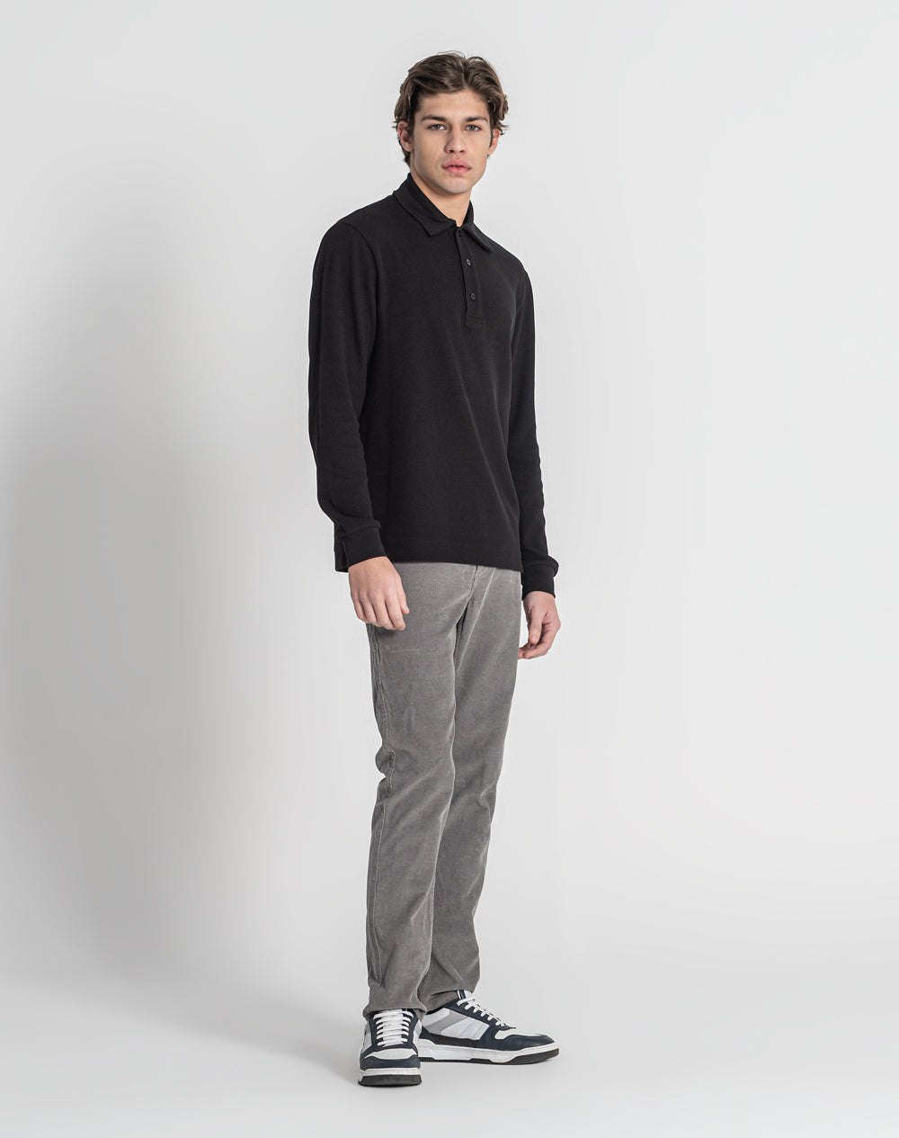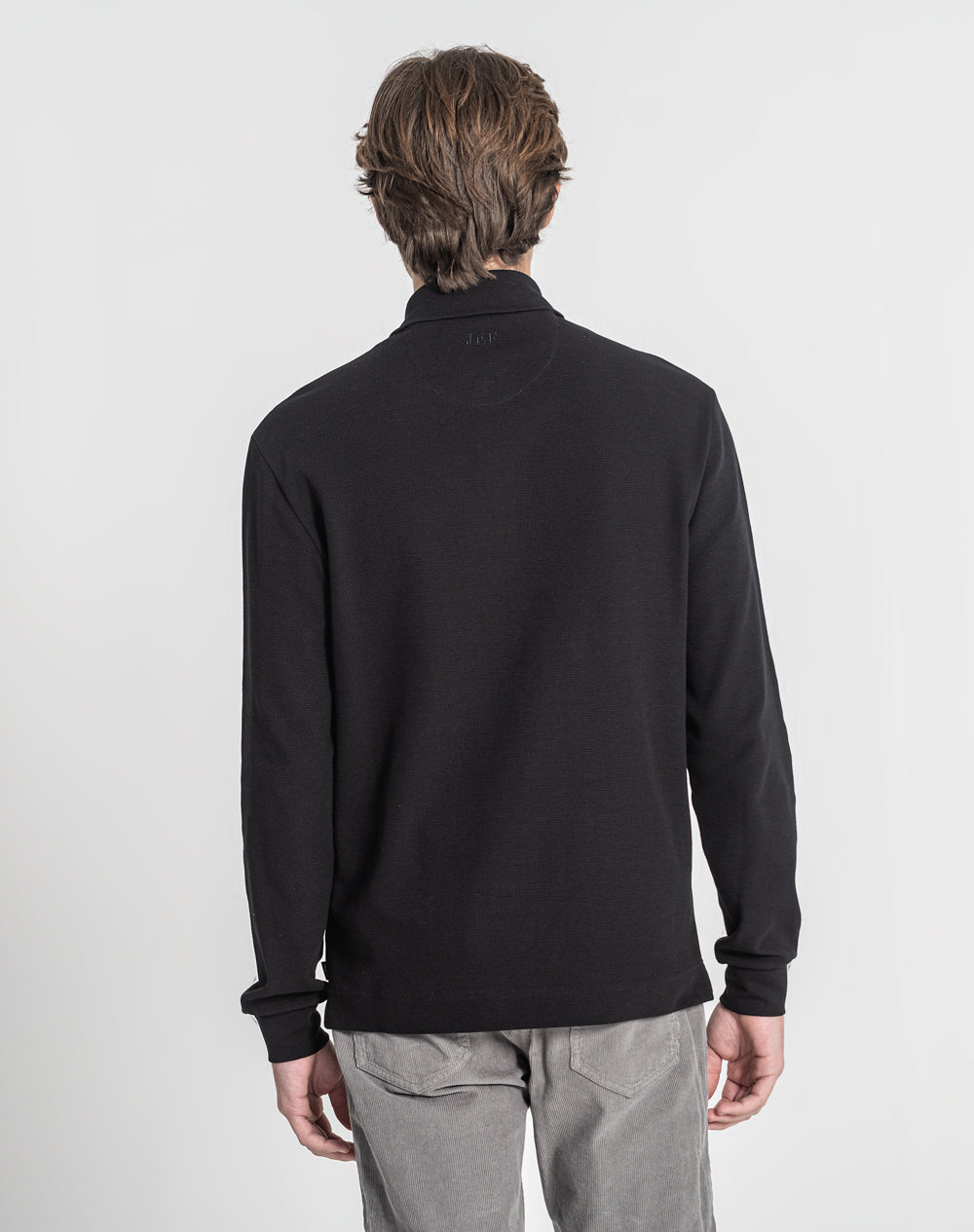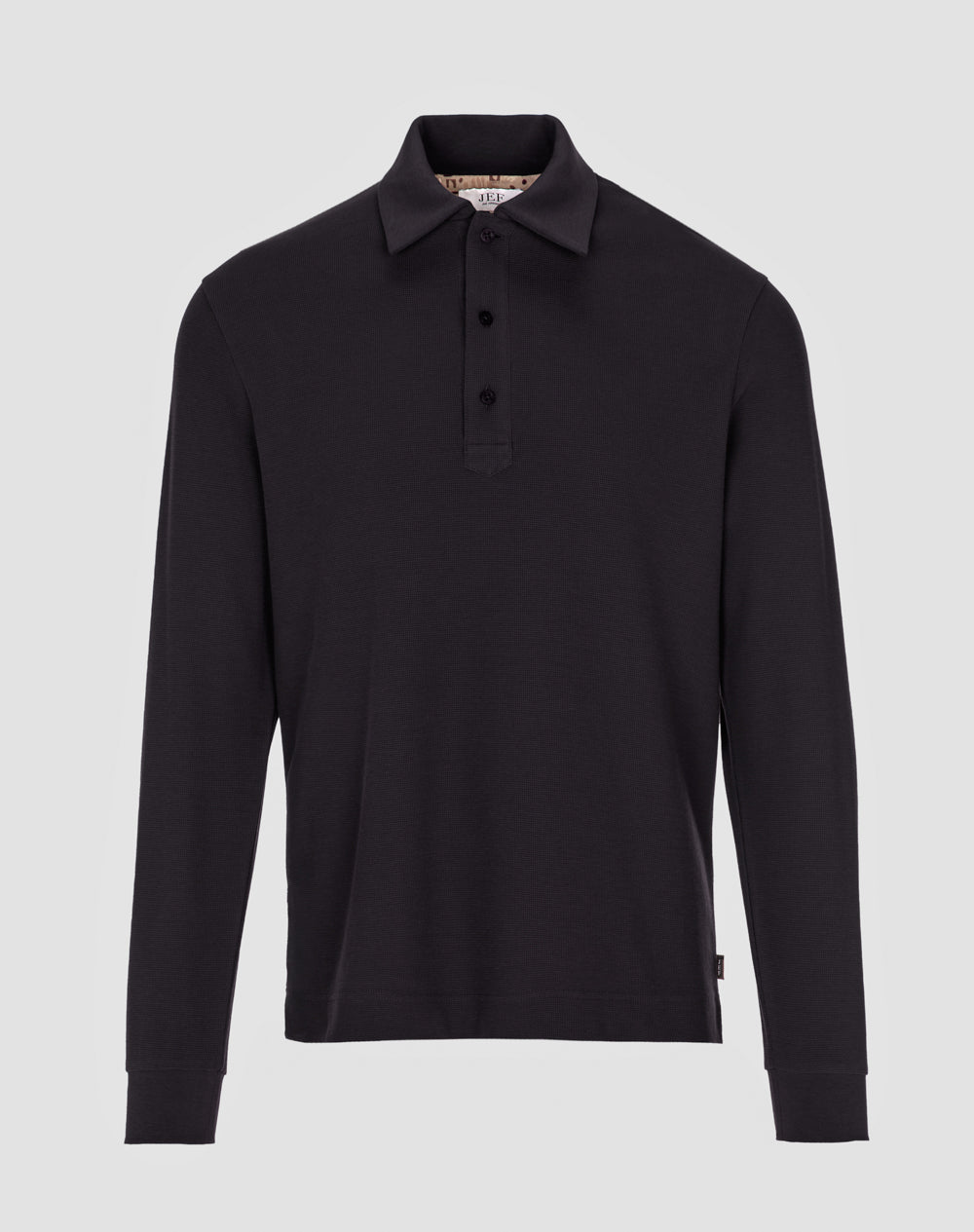 Polo manga comprida estilo regular fit. Abertura no meio-frente através 3 botões. Gola e punhos em rib. Logótipo JEF bordado nas costas à cor da peça. Meia-lua em tecido estampado alusivo ao tema da coleção. Etiqueta JEF preta na vertical metida na costura lateral.