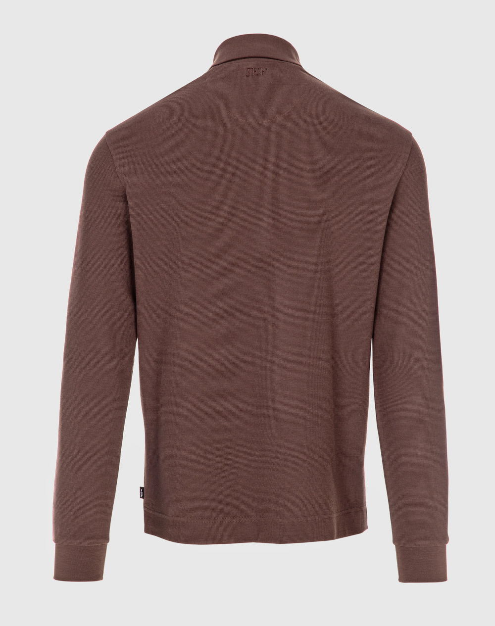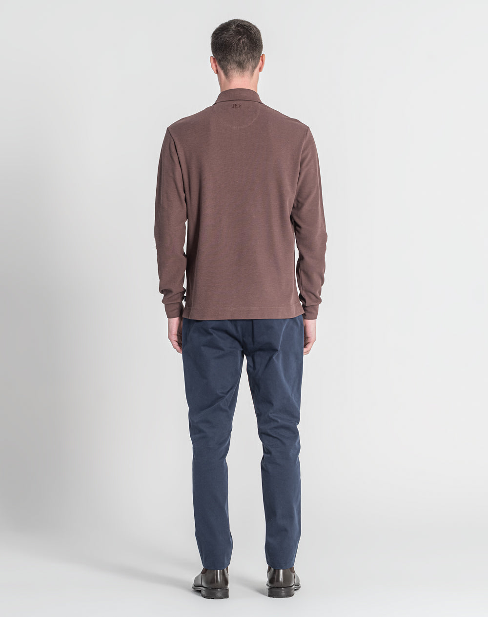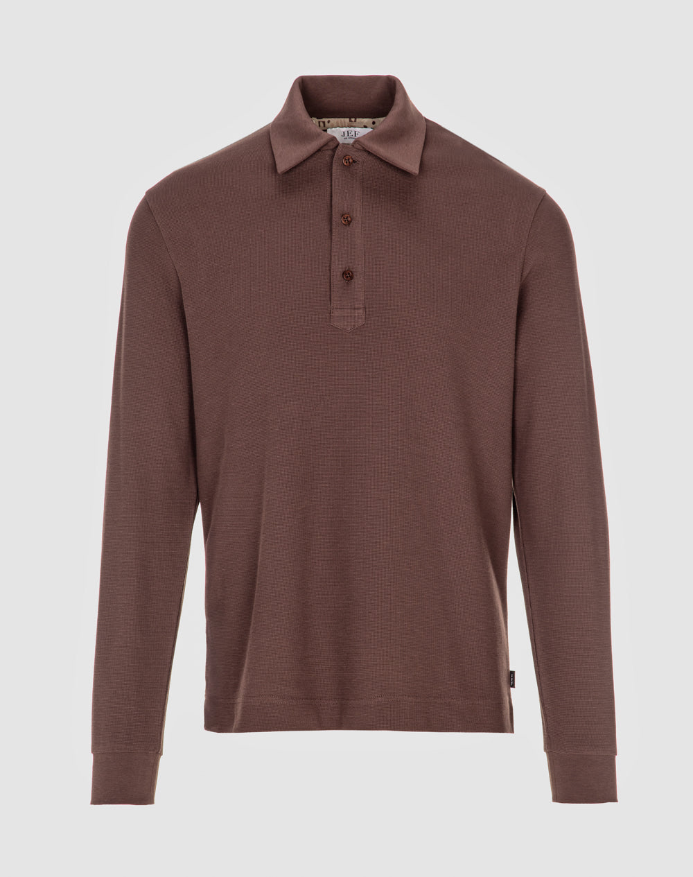 Polo manga comprida estilo regular fit. Abertura no meio-frente através 3 botões. Gola e punhos em rib. Logótipo JEF bordado nas costas à cor da peça. Meia-lua em tecido estampado alusivo ao tema da coleção. Etiqueta JEF preta na vertical metida na costura lateral.