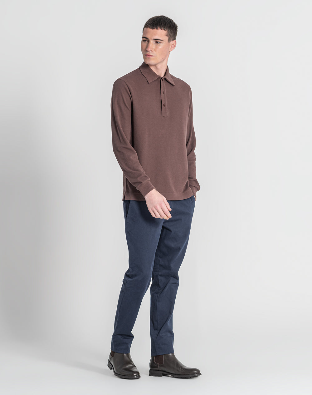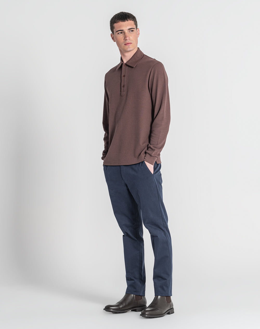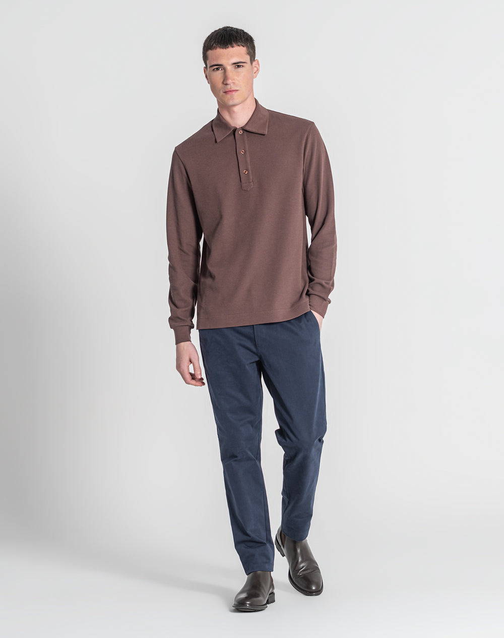 Polo manga comprida estilo regular fit. Abertura no meio-frente através 3 botões. Gola e punhos em rib. Logótipo JEF bordado nas costas à cor da peça. Meia-lua em tecido estampado alusivo ao tema da coleção. Etiqueta JEF preta na vertical metida na costura lateral.
