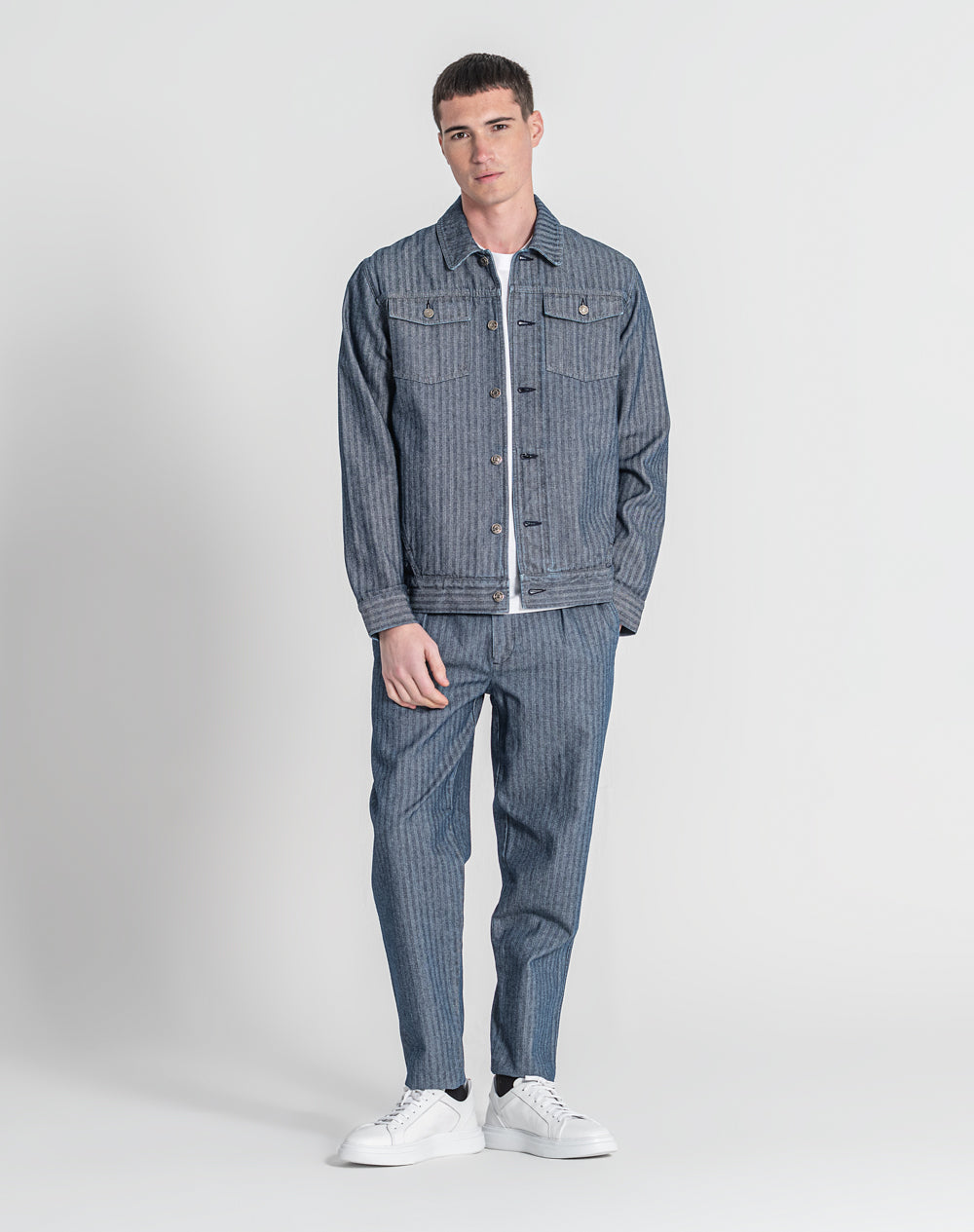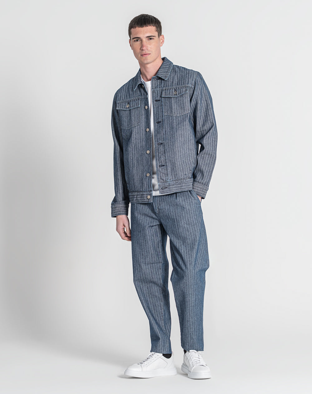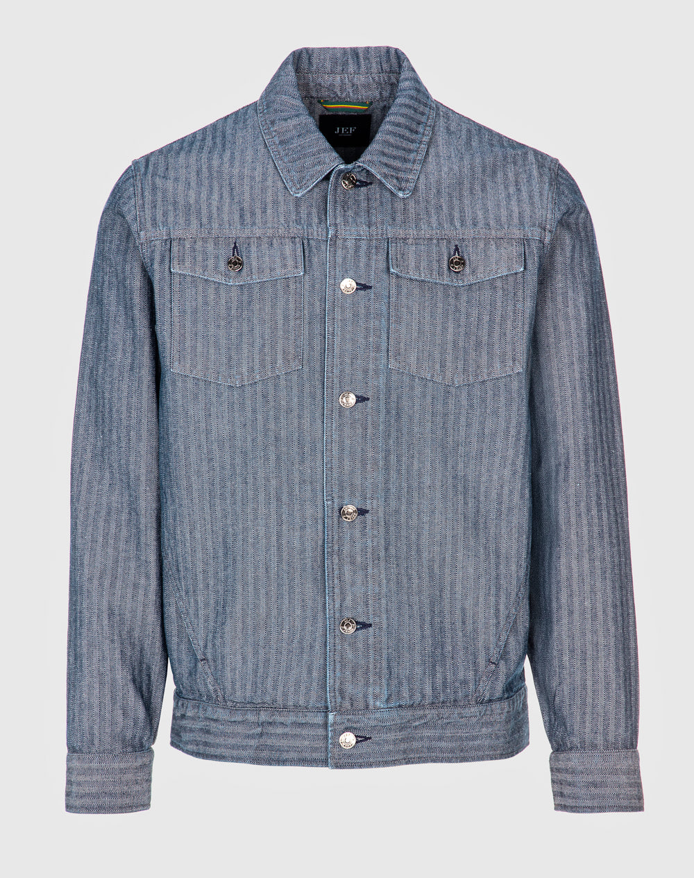 Casaco estilo trucker com efeito fishbone. Estilo regular fit. Bolsos superiores de chapa com pala. Abertura no meio frente através de botões de prego. Bolsos nas laterais. Etiqueta JEF preta na vertical pregada na lateral.