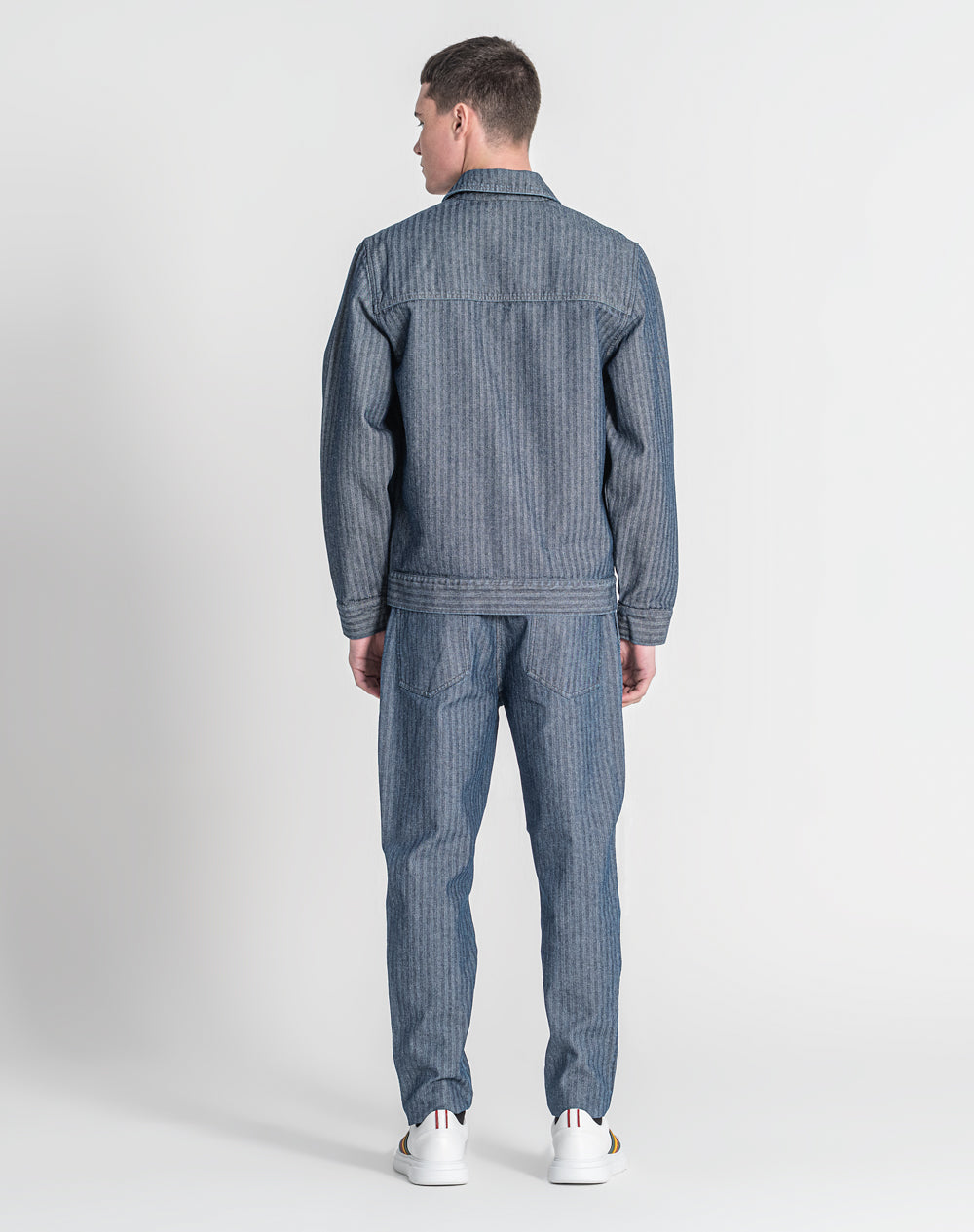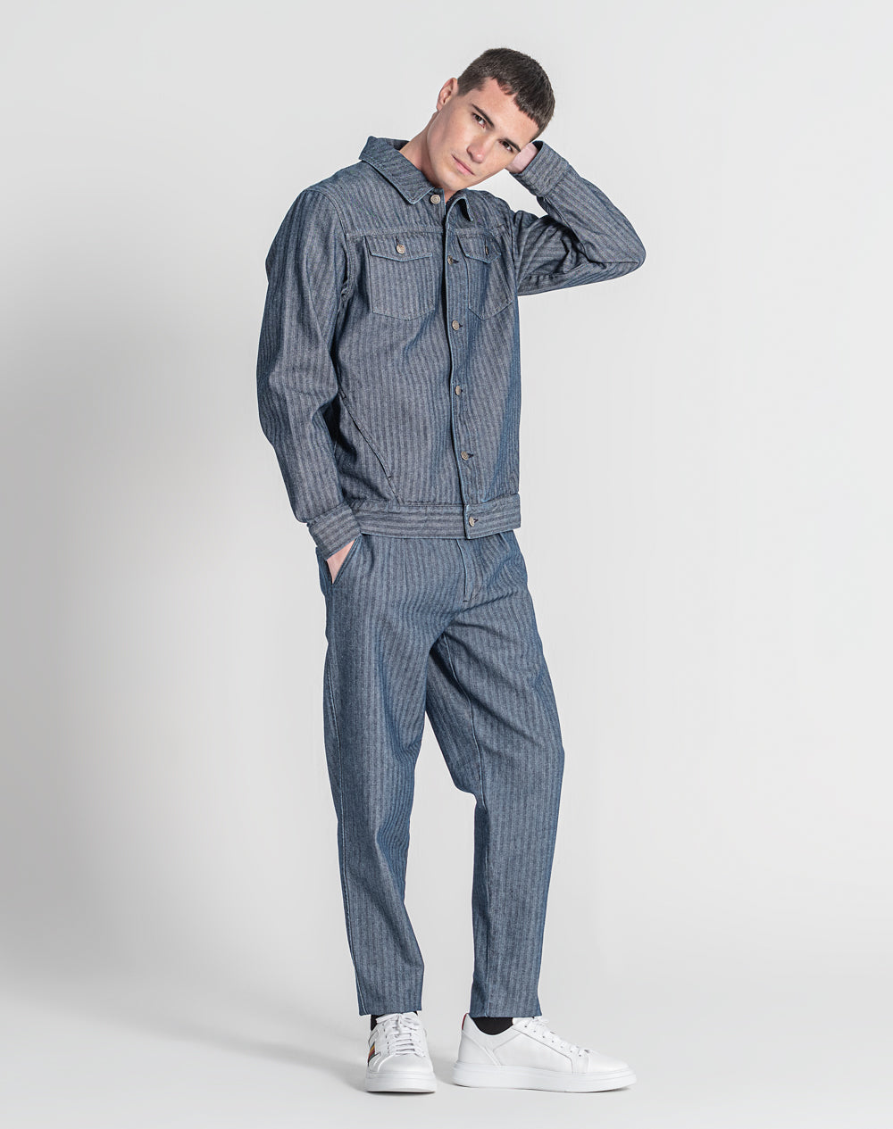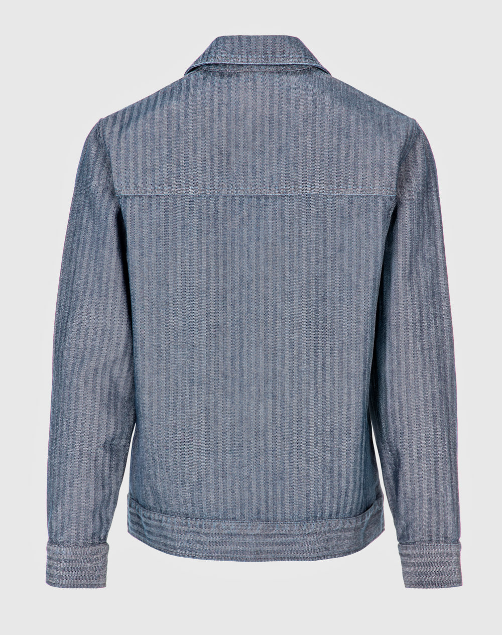 Casaco estilo trucker com efeito fishbone. Estilo regular fit. Bolsos superiores de chapa com pala. Abertura no meio frente através de botões de prego. Bolsos nas laterais. Etiqueta JEF preta na vertical pregada na lateral.
