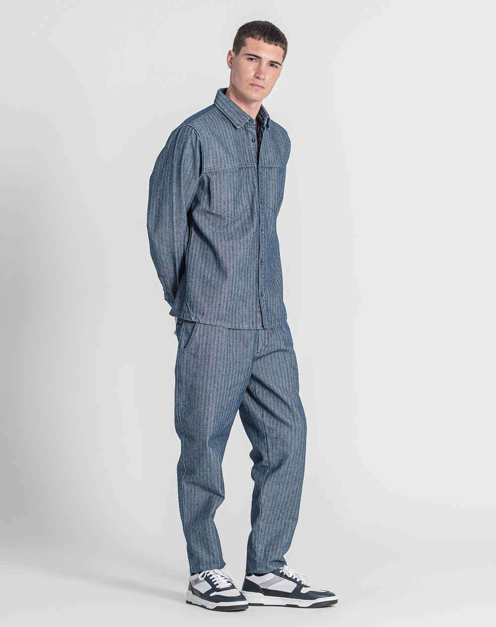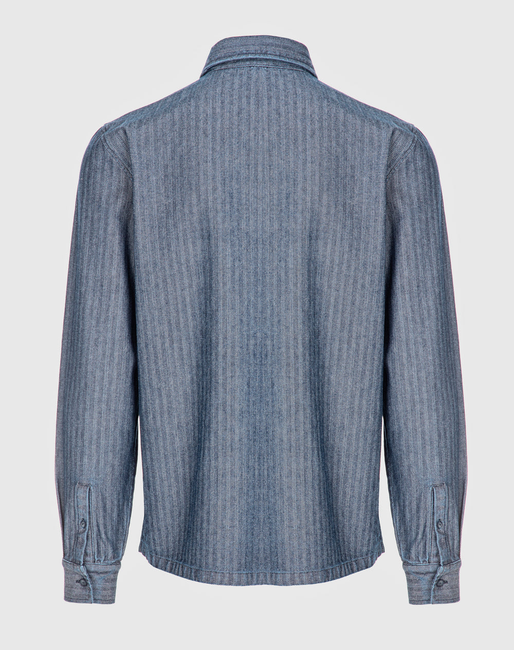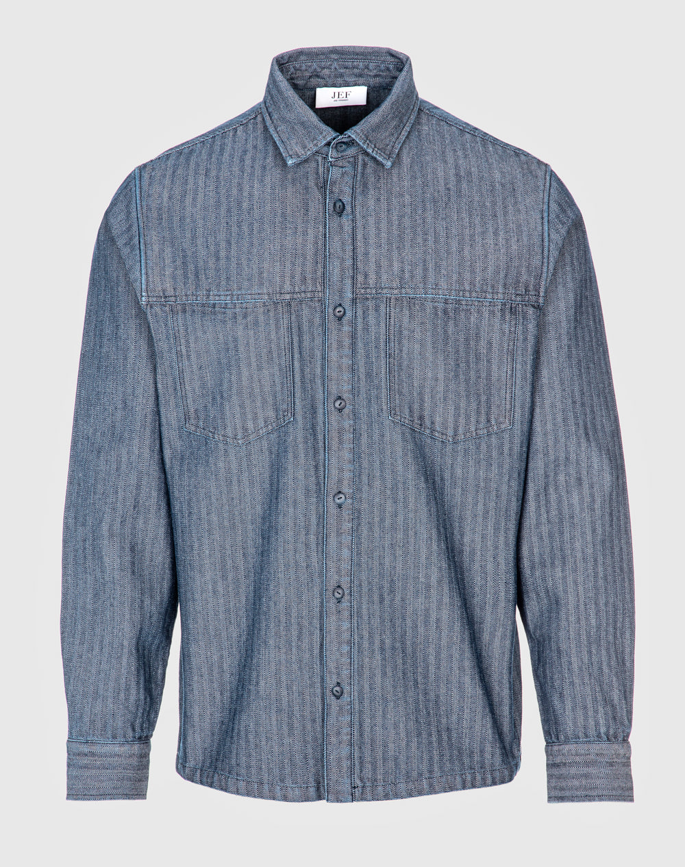 Camisa exterior com efeito fishbone. Estilo regular fit. Bolsos superiores de chapa. Abertura meio-frente com botões. Logótipo JEF bordado nas costas à cor da peça.