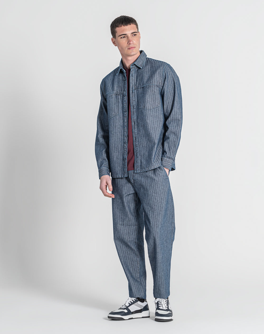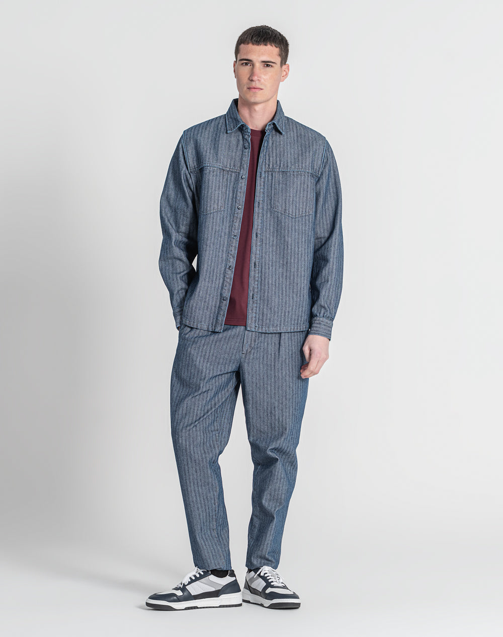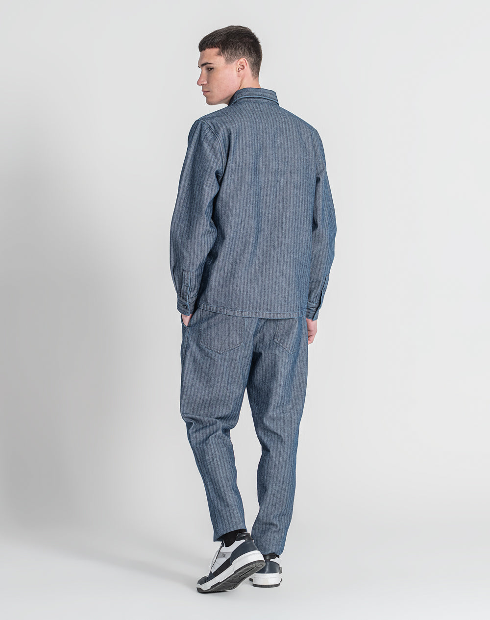 Camisa exterior com efeito fishbone. Estilo regular fit. Bolsos superiores de chapa. Abertura meio-frente com botões. Logótipo JEF bordado nas costas à cor da peça.